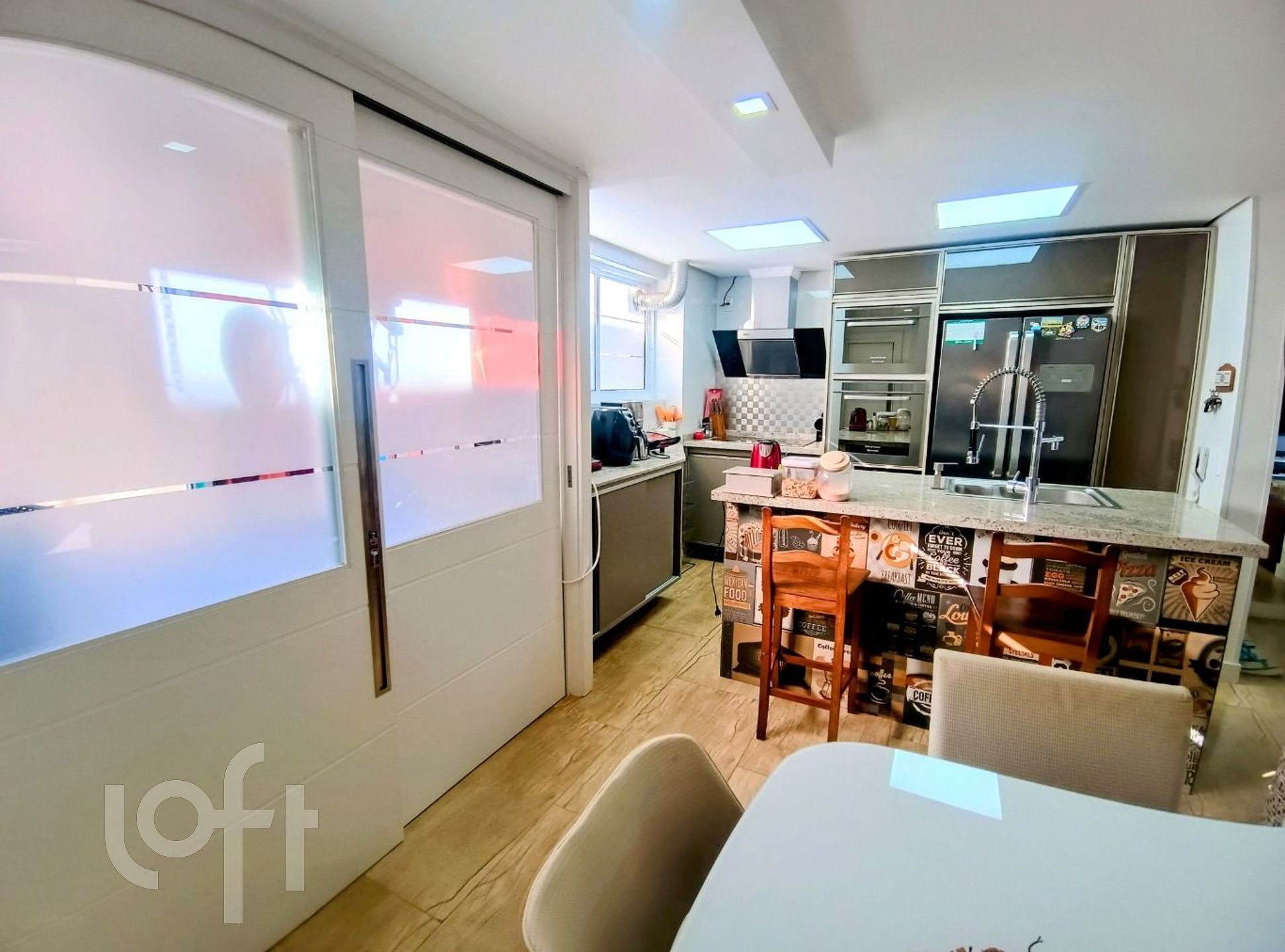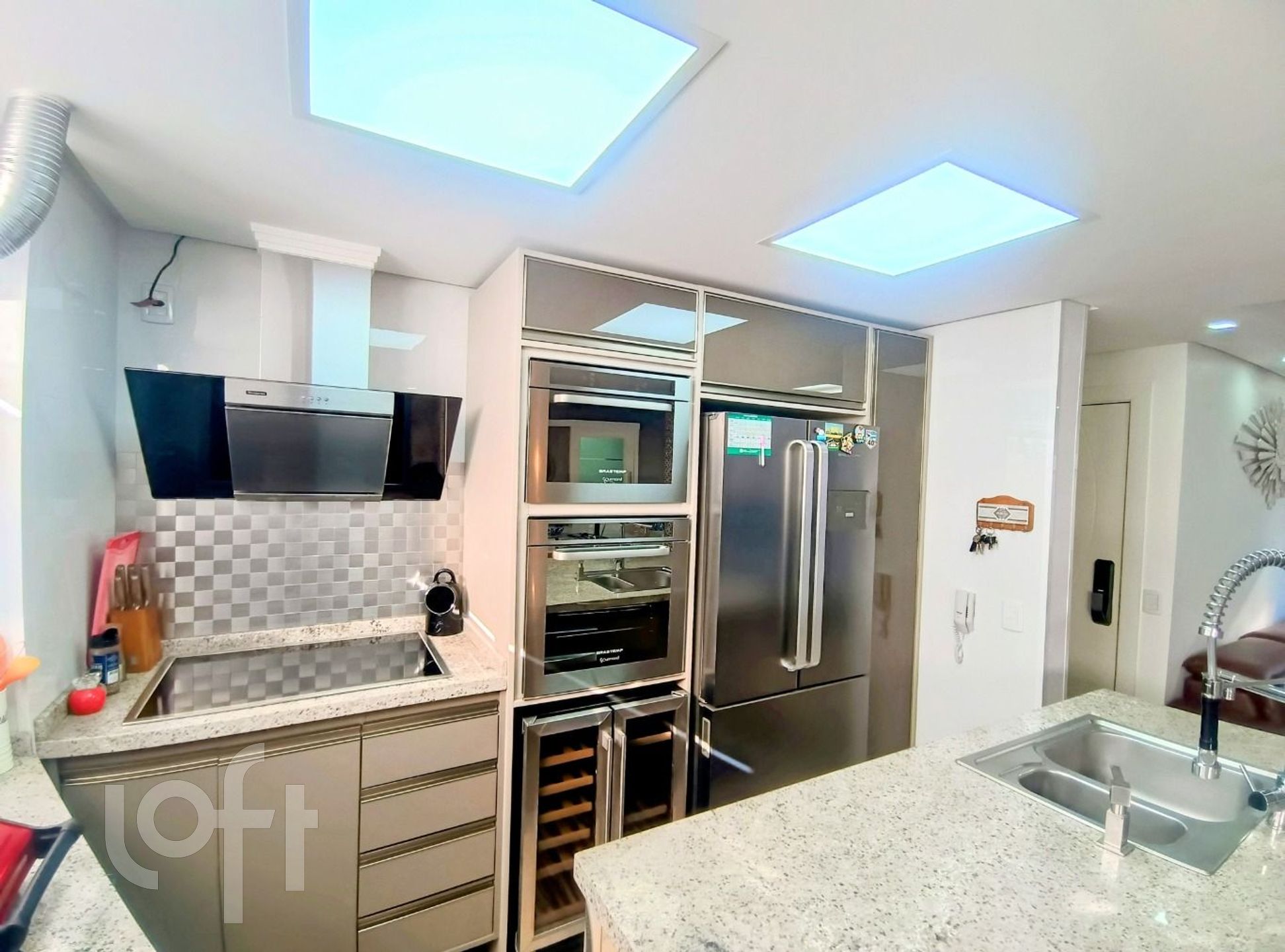 Cervejeira e adega de vinhos, fogão indução, depurador, side by side, forno micro-ondas, forno elétrico, lava louça, lavadora roupas e secadora separadas.