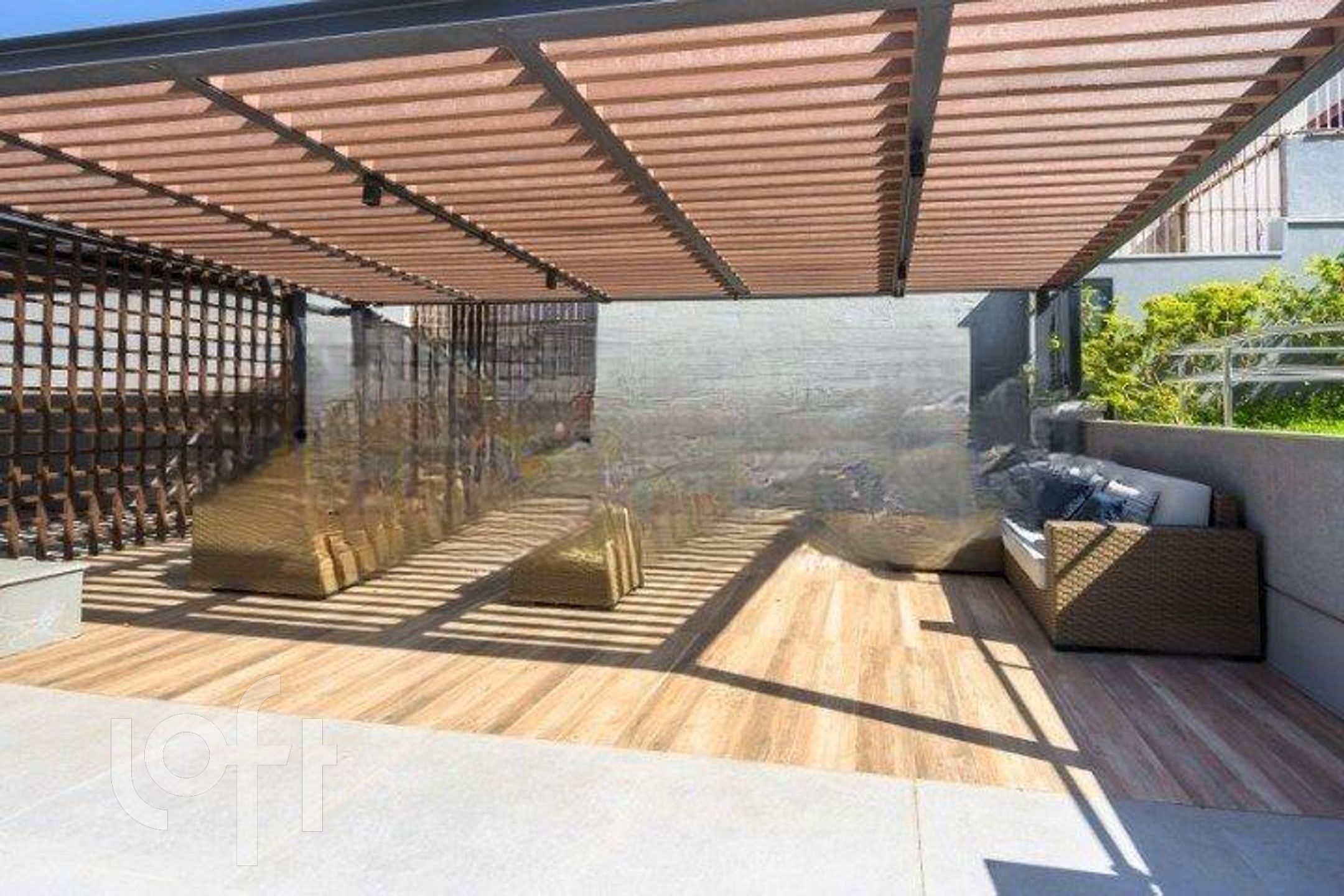 Deck pergolado e quiosque com churrasqueira