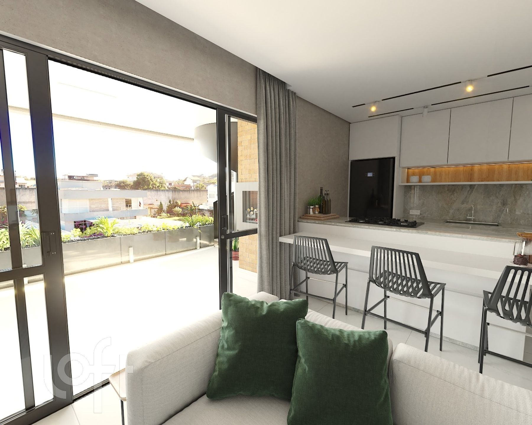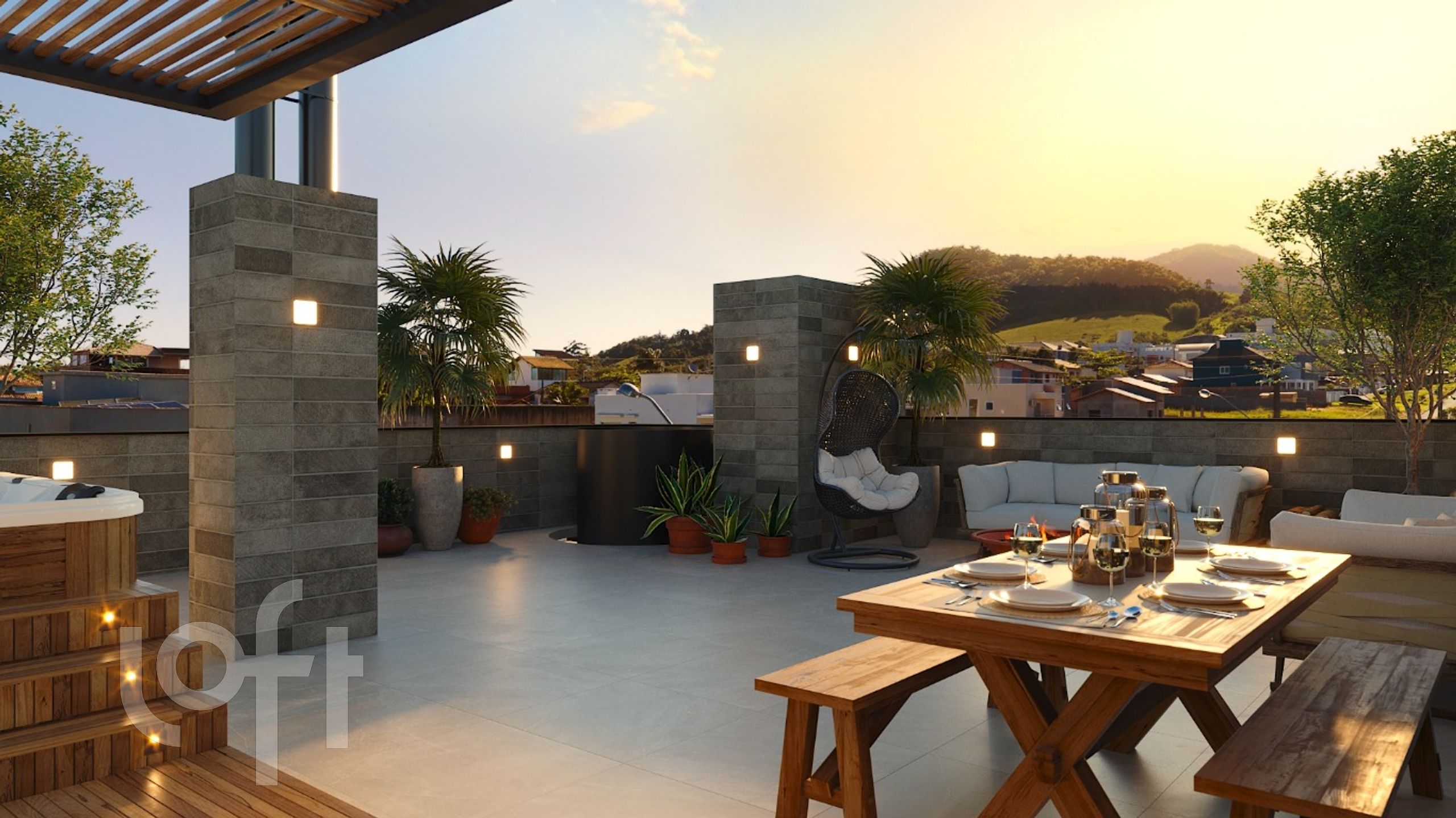 Apartamento de 2 dormitórios com rooftop de 36,08m² e espera para jacuzzi. Living amplo para 2 ambientes, 1 suíte, banheiro social, sacada, churrasqueira e 2 vagas de garagem cobertas lado a lado.