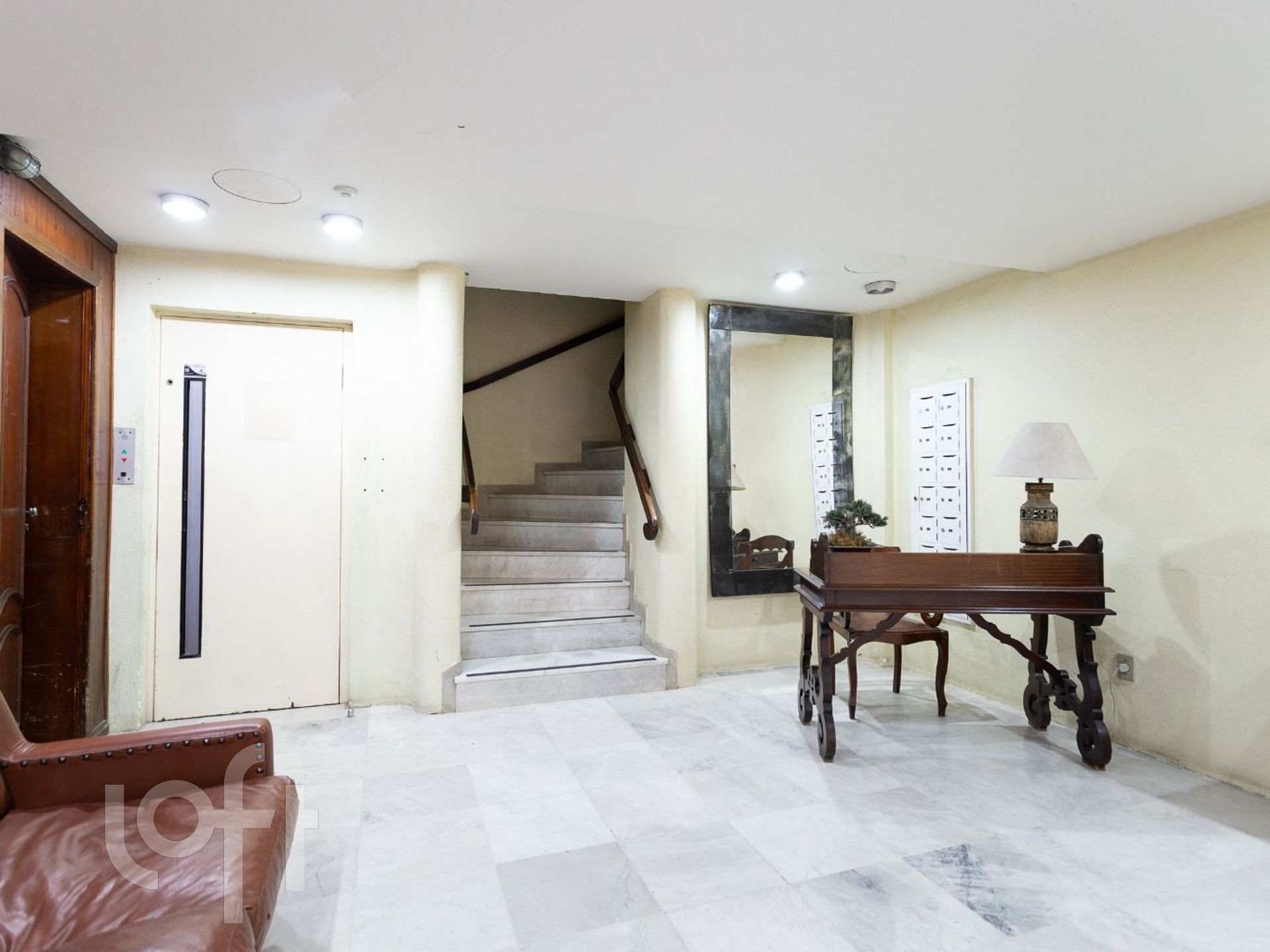 Edifício com elevador e câmeras de segurança.