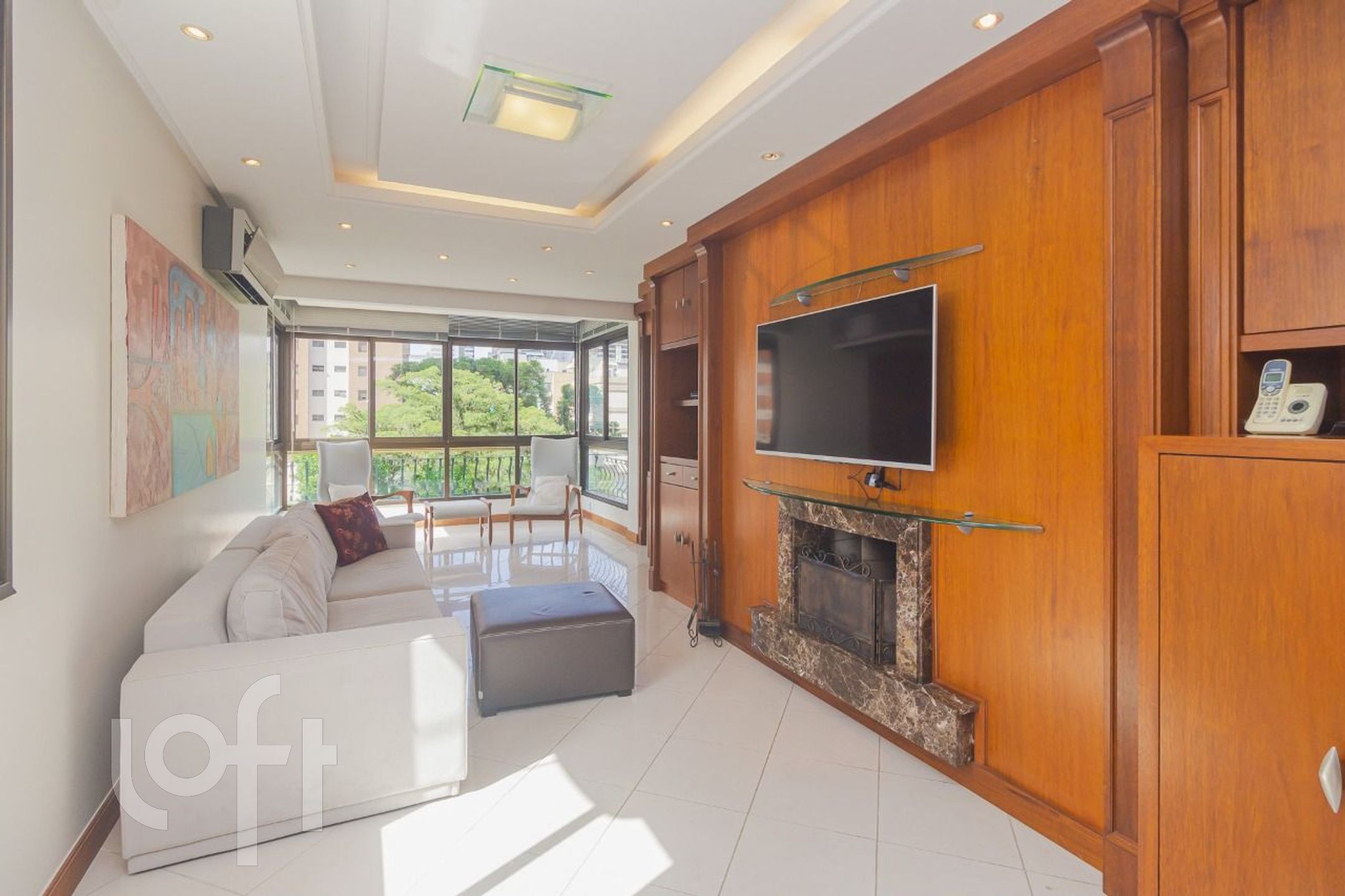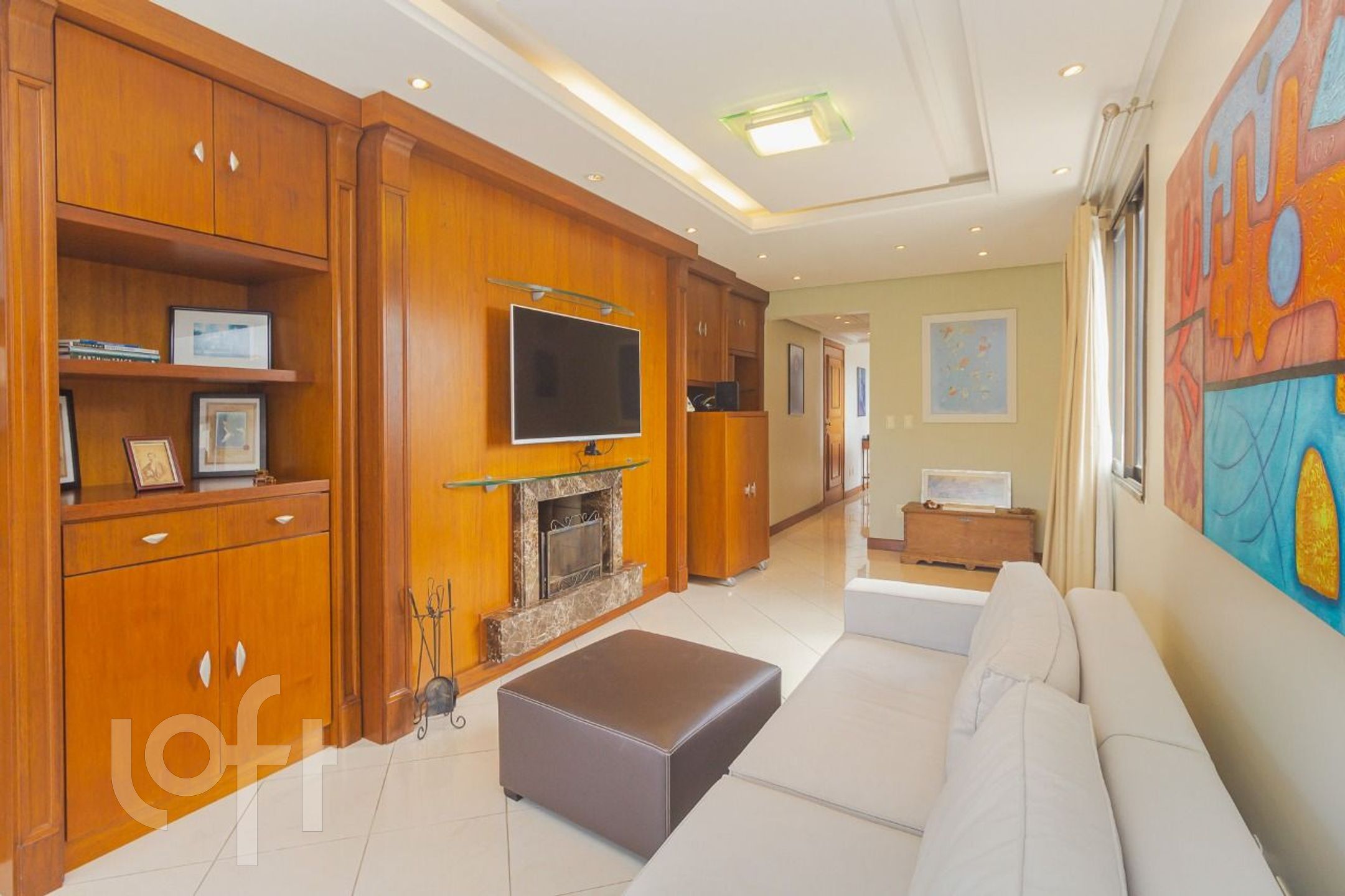 Living: Amplo, com lareira e churrasqueira integrada.