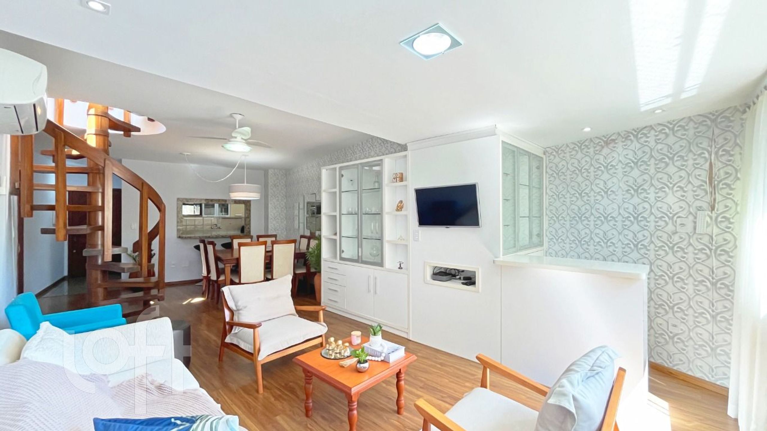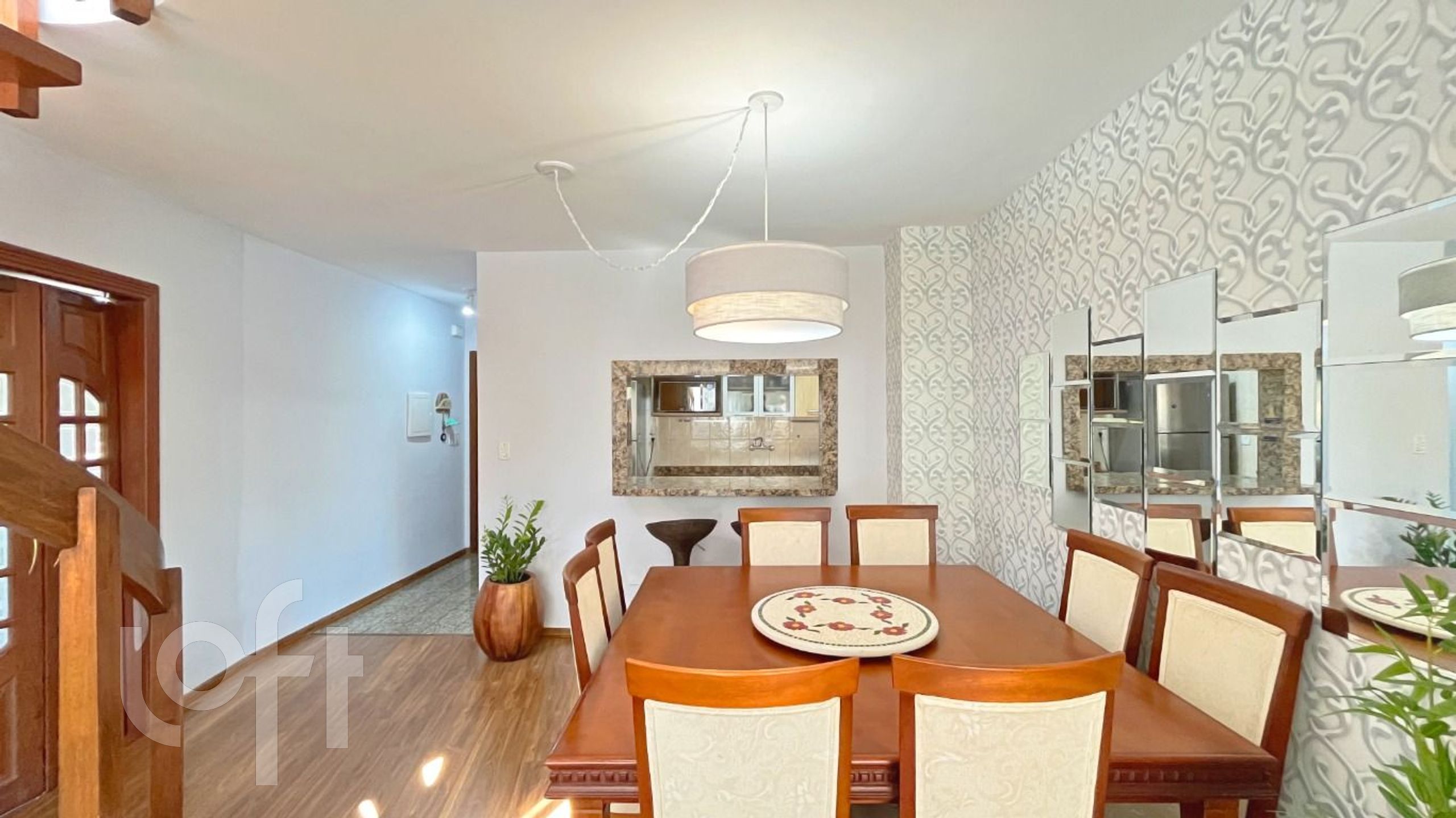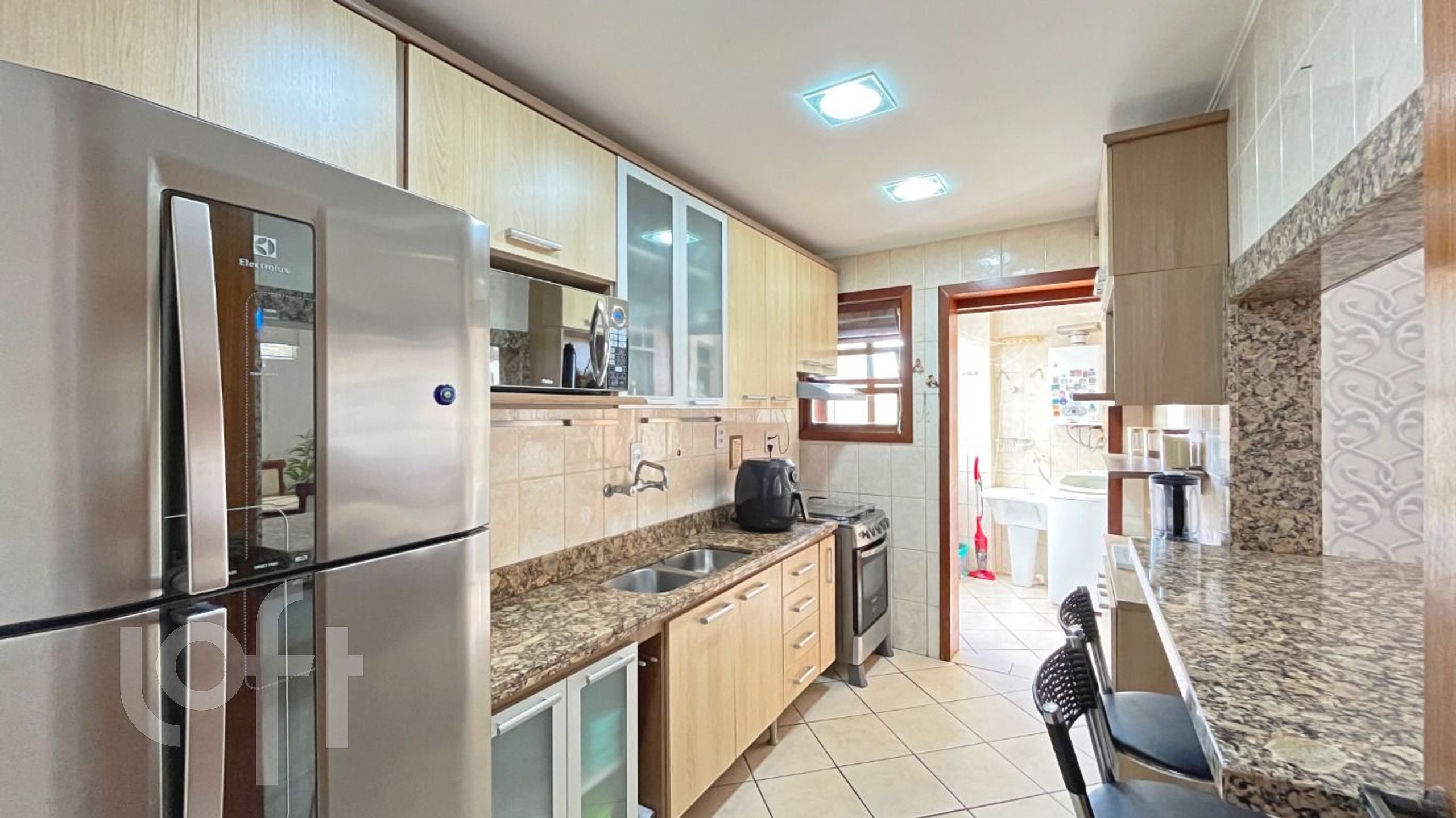 O primeiro pavimento conta com dois quartos, sendo uma suíte com closet, amplo living com dois ambientes, banheiro social, cozinha equipada com armários e eletrodomésticos, área de serviço, espaço home office e lavabo.