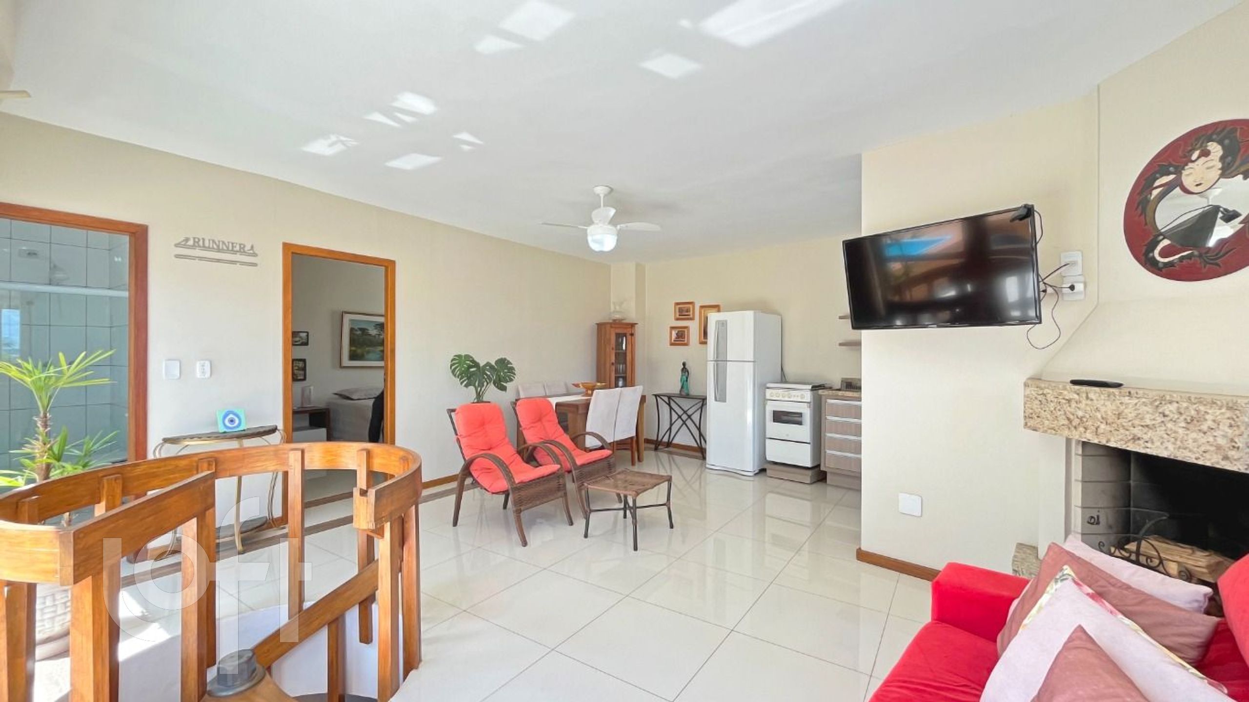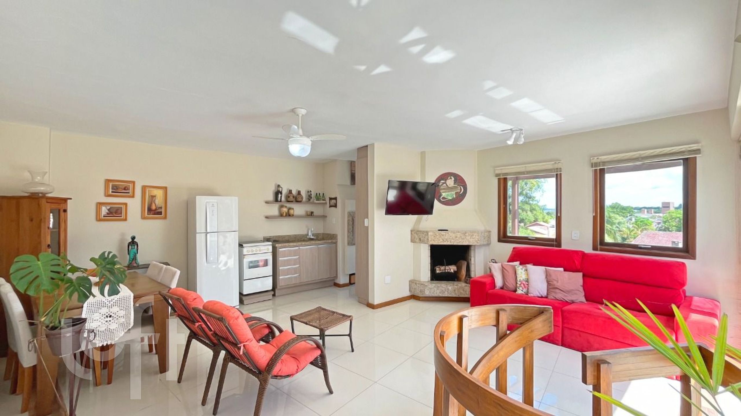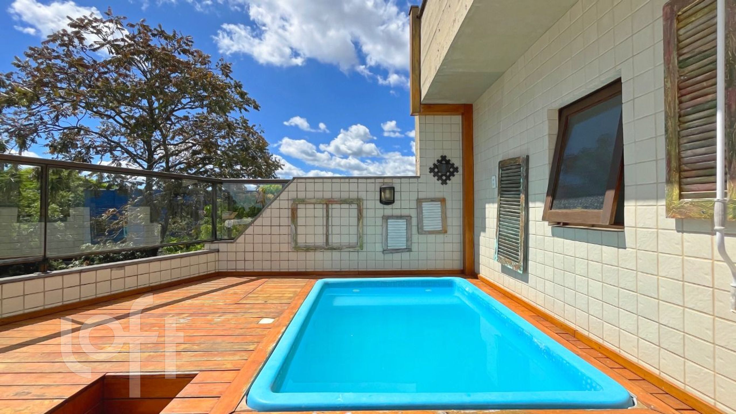 O segundo pavimento é composto por um amplo living com lareira e cozinha com churrasqueira integrada, um quarto, banheiro social e um espaçoso terraço com deck e piscina.