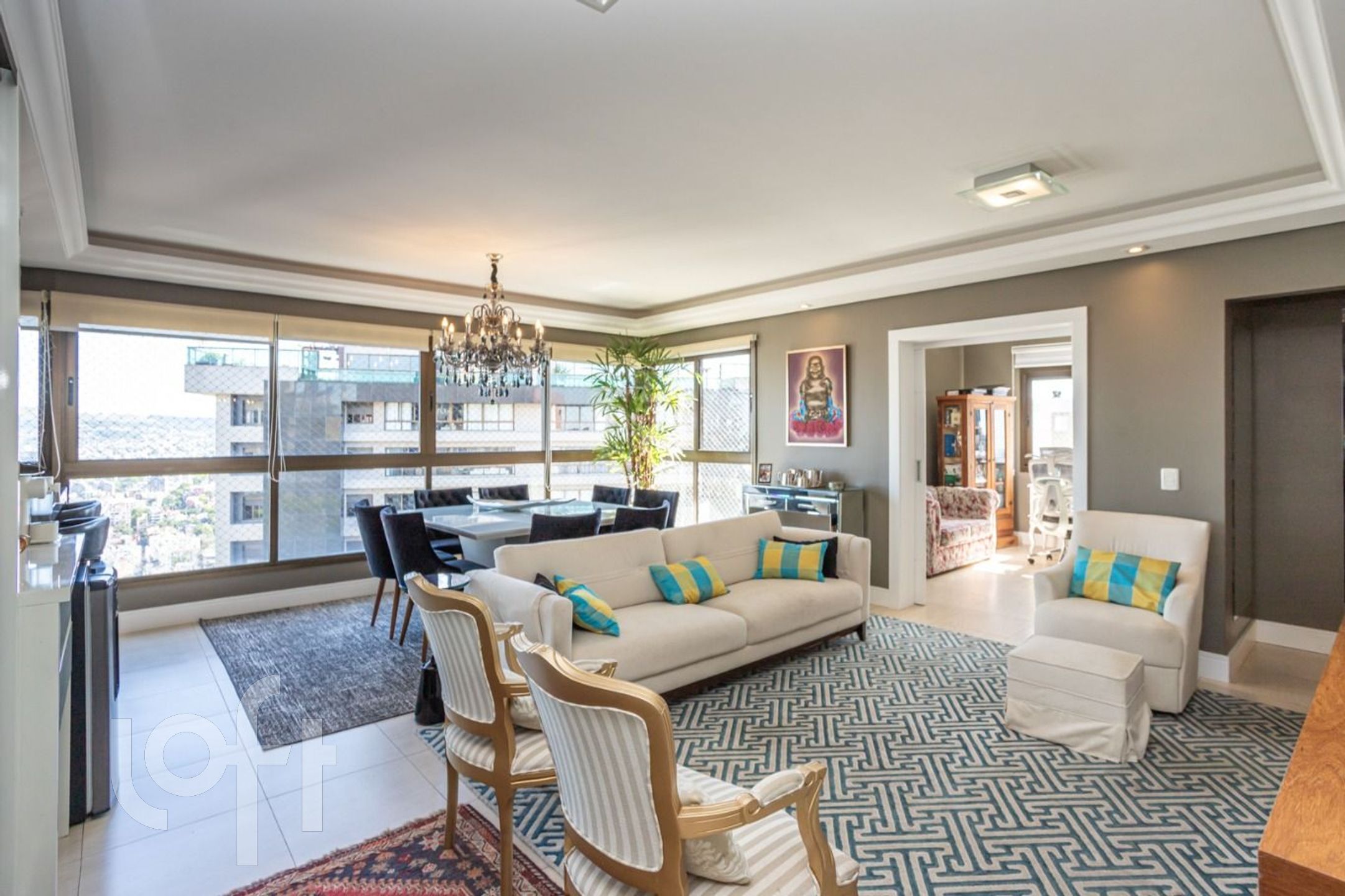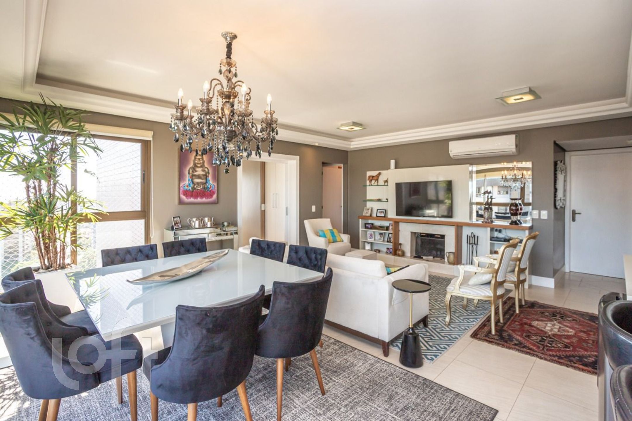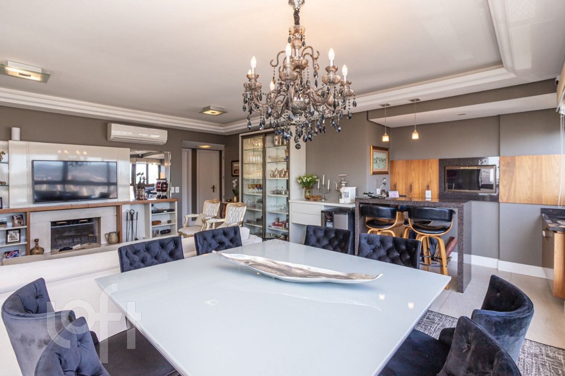 Apartamento semi mobiliado de 132,8 m², em andar alto e privilegiado por luz natural abundante. A área íntima conta com três dormitórios, incluindo uma suíte. O living, amplo e distribuído em três ambientes, integra lareira e espaço gourmet com churrasqueira. A planta inclui ainda lavabo, rouparia, cozinha, área de serviço e dependência de serviço completa. Dispõe de três vagas de garagem.