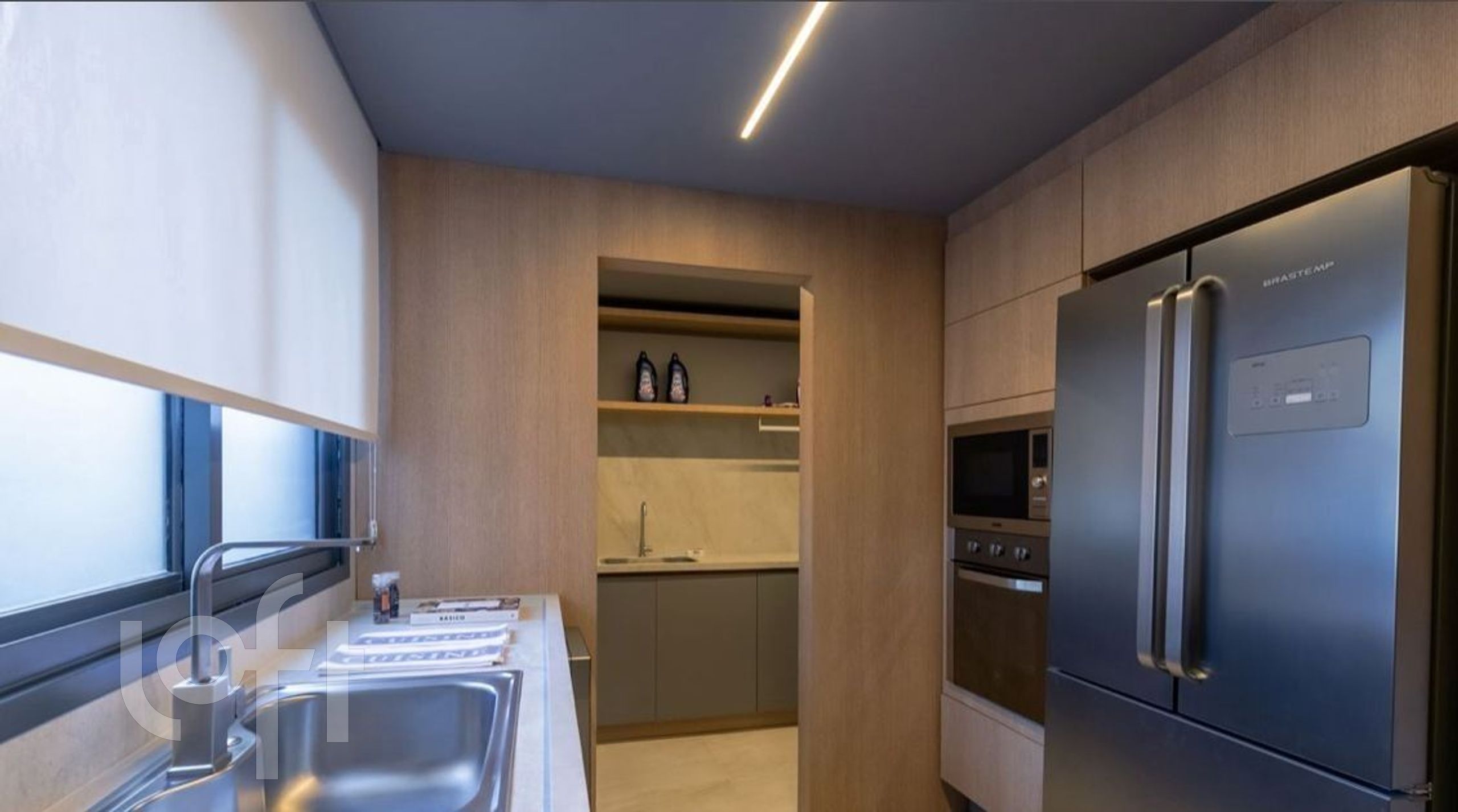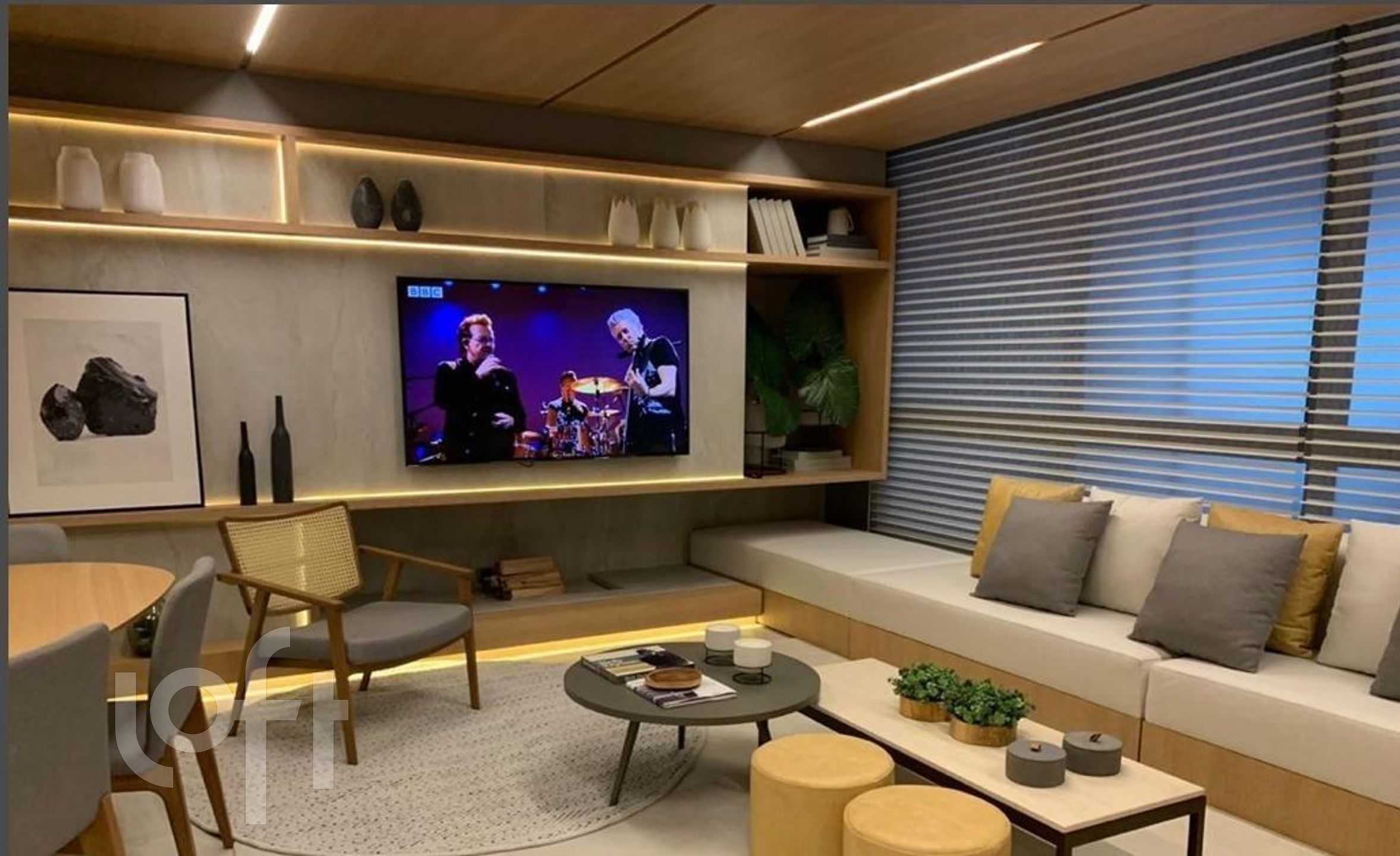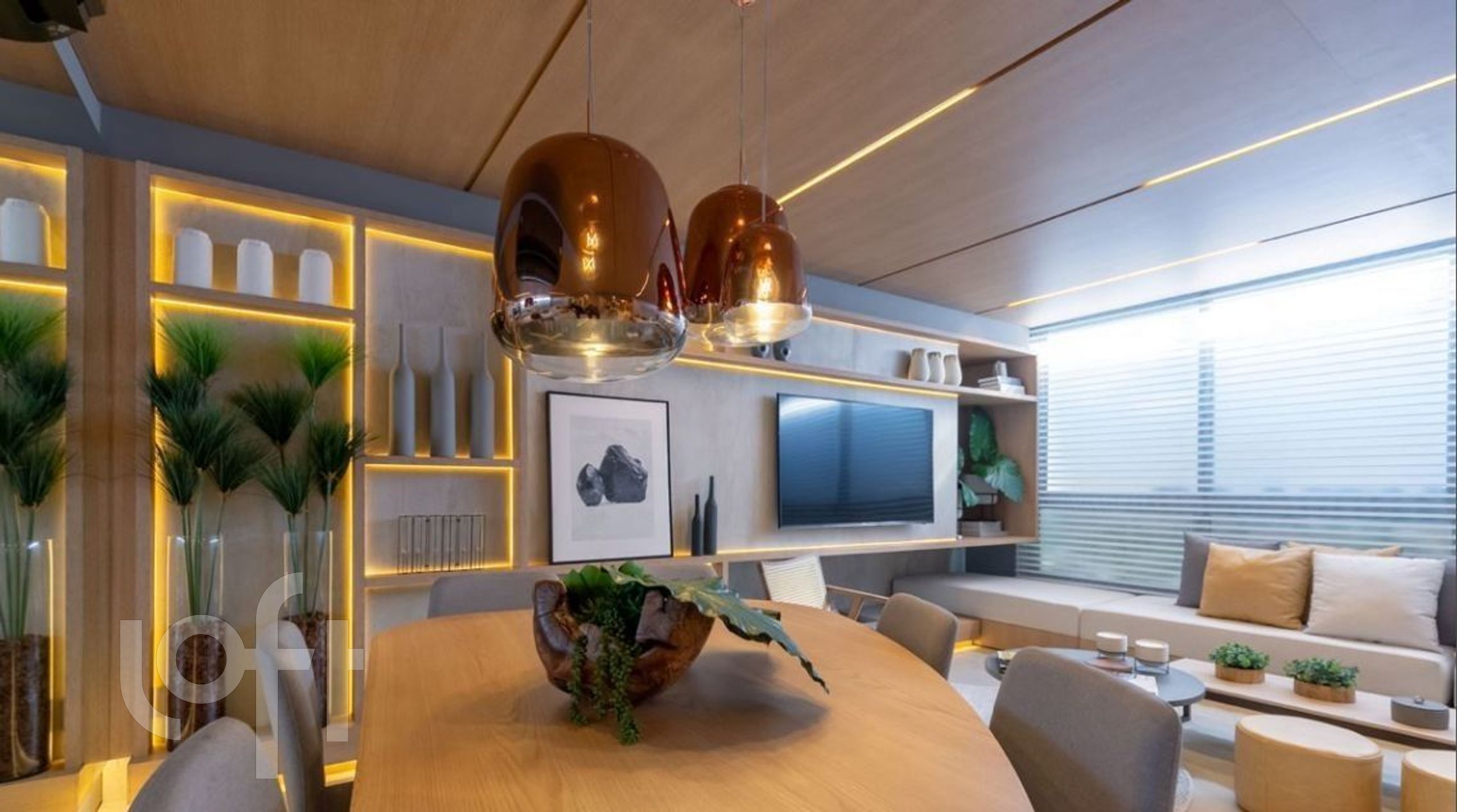 Possui amplo living para 2 ambientes com lareira, espaço gourmet com churrasqueira, hall de entrada, lavabo, cozinha com móveis sob medida, área de serviço separada e banho auxiliar.