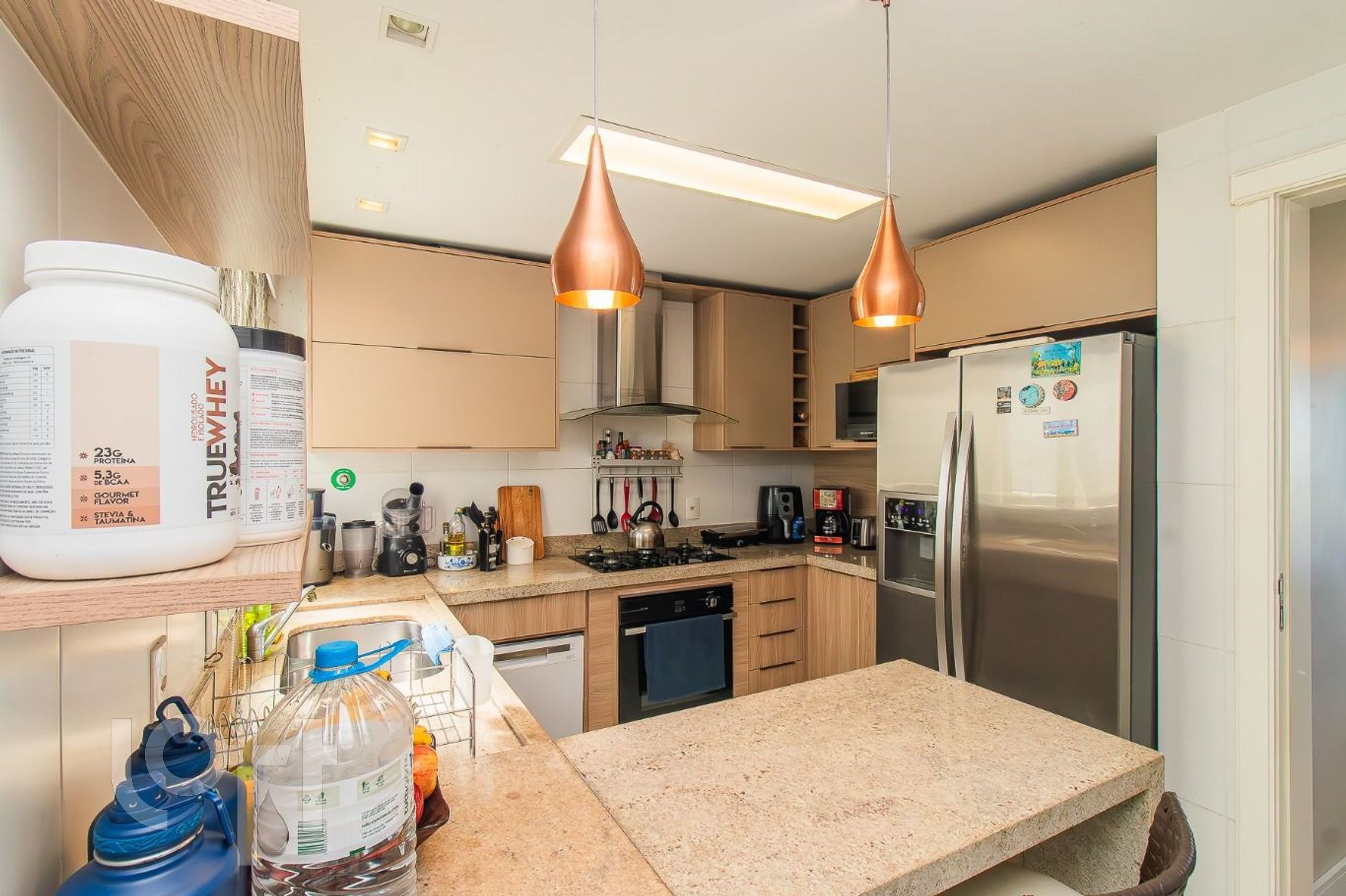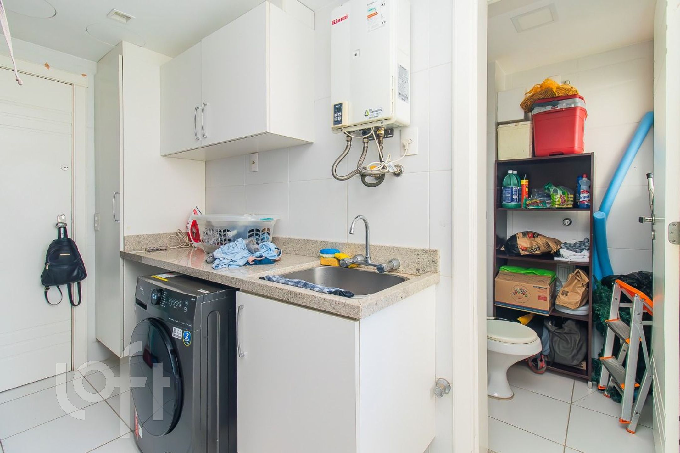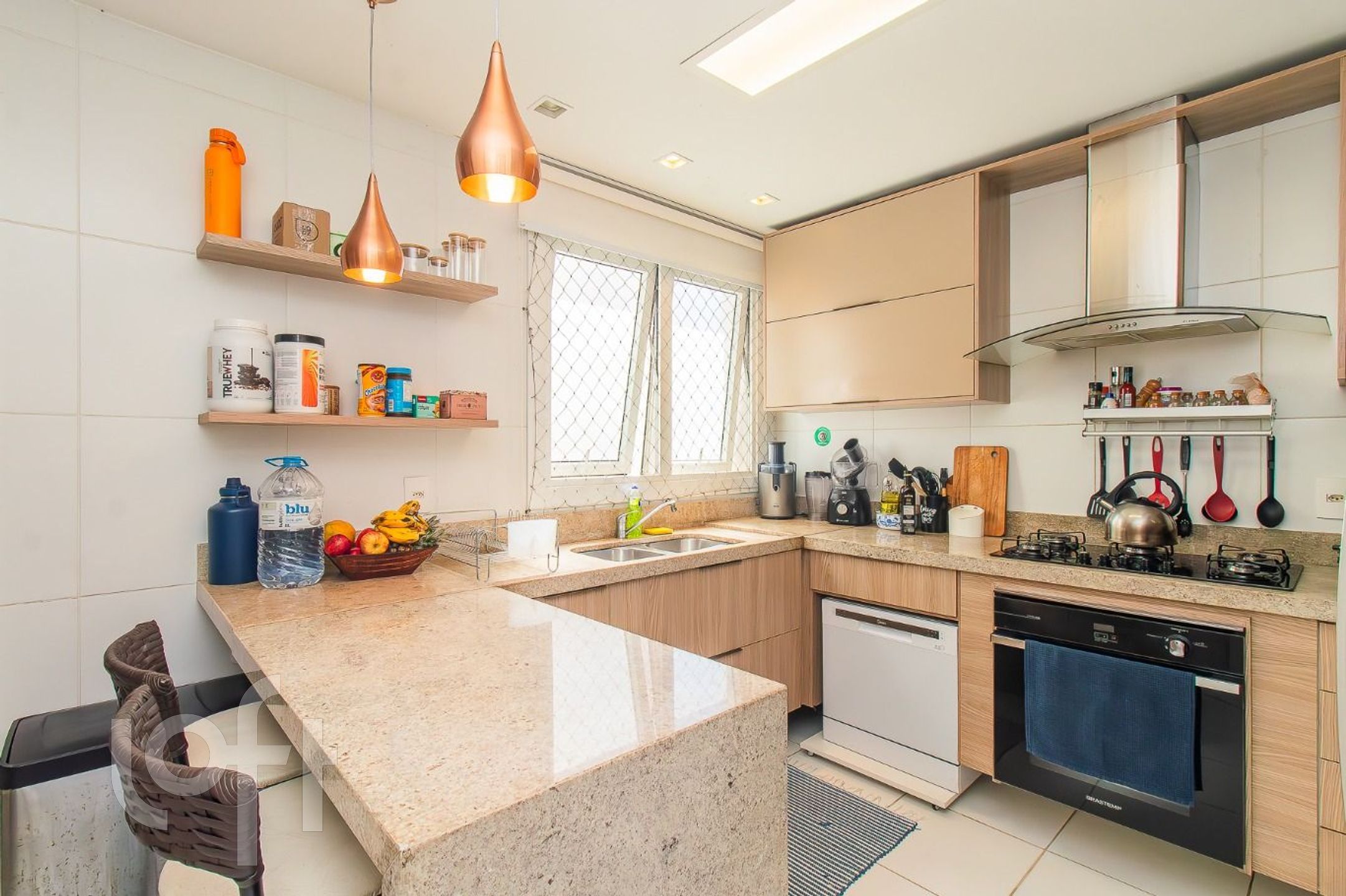 Cozinha planejada, área de serviço independente e banheiro auxiliar.