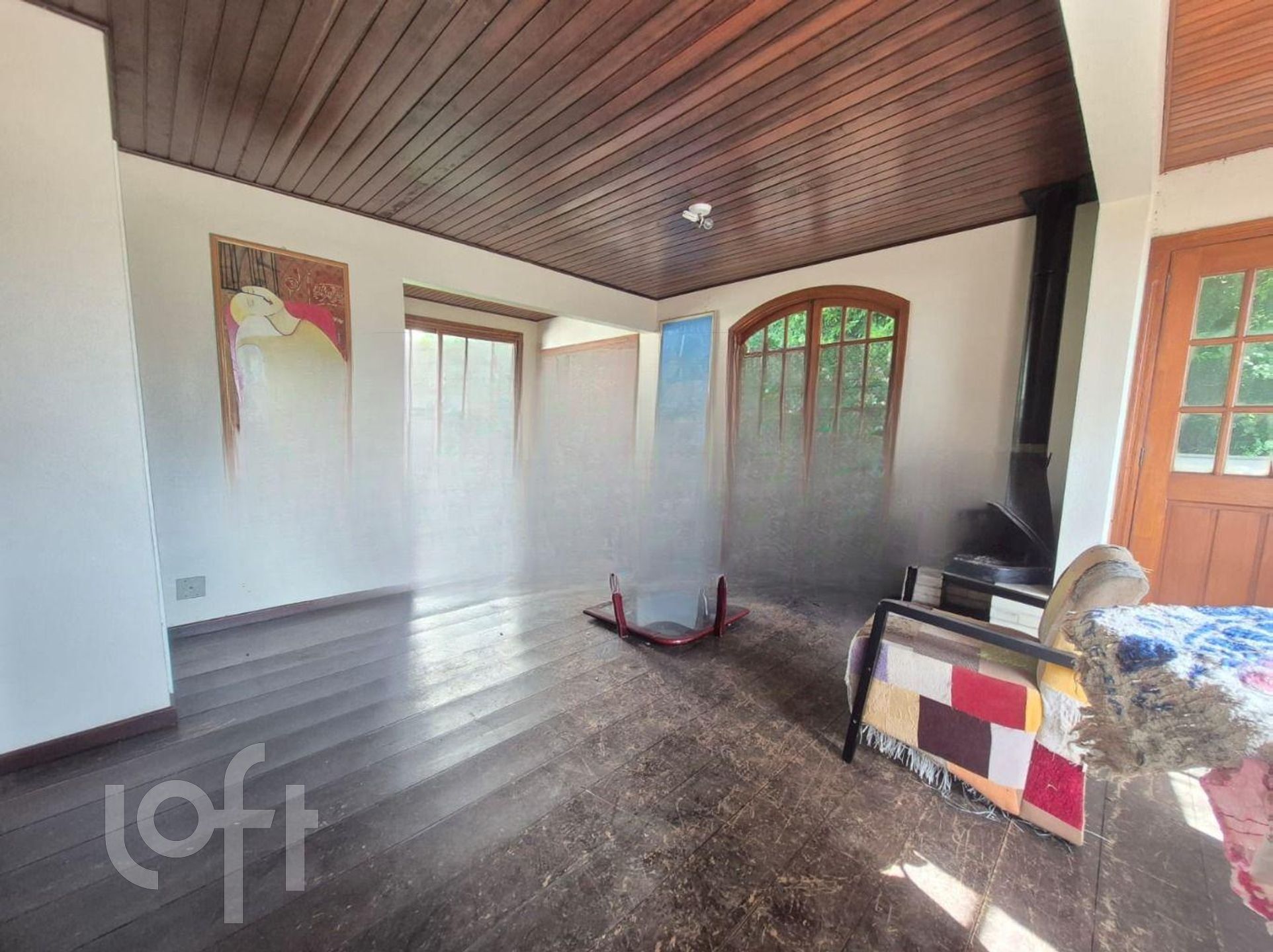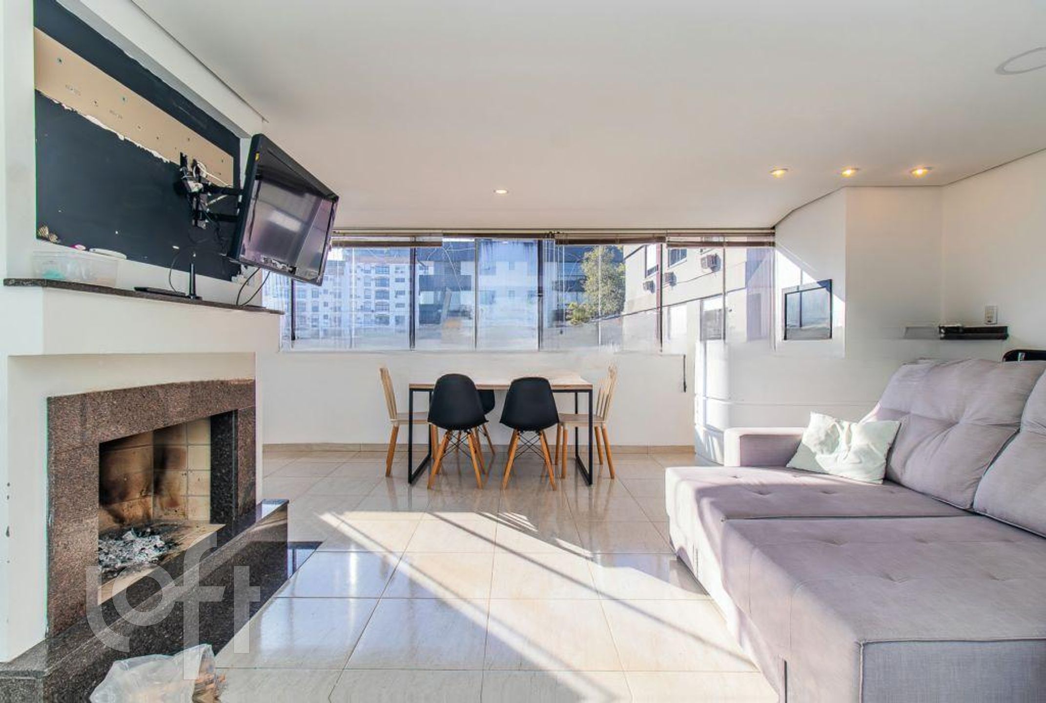 Piso superior, sala grande para 2 ambientes com lareira, 1 dormitório ou gabinete, banheiro completo, churrasqueira, terraço com piscina.