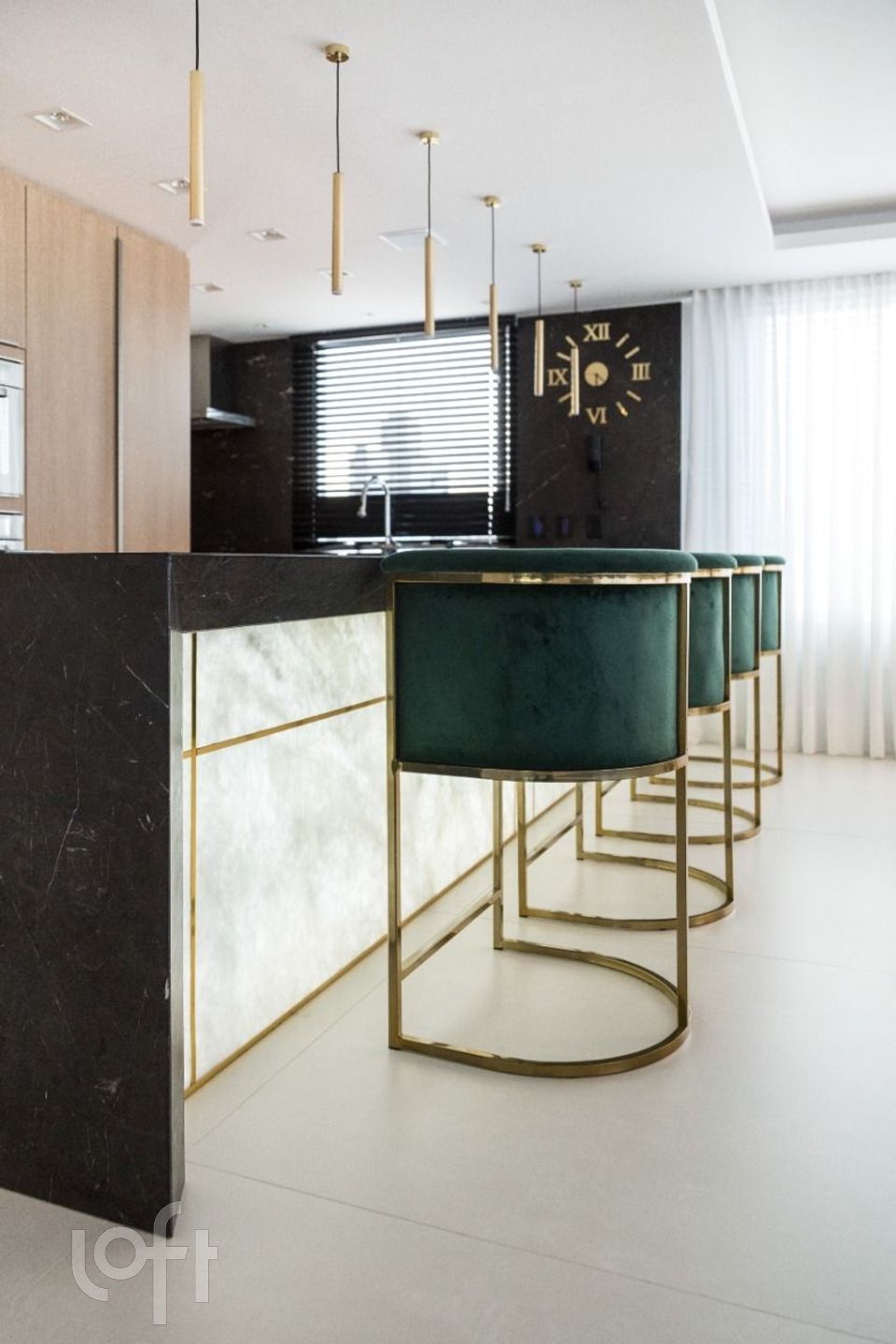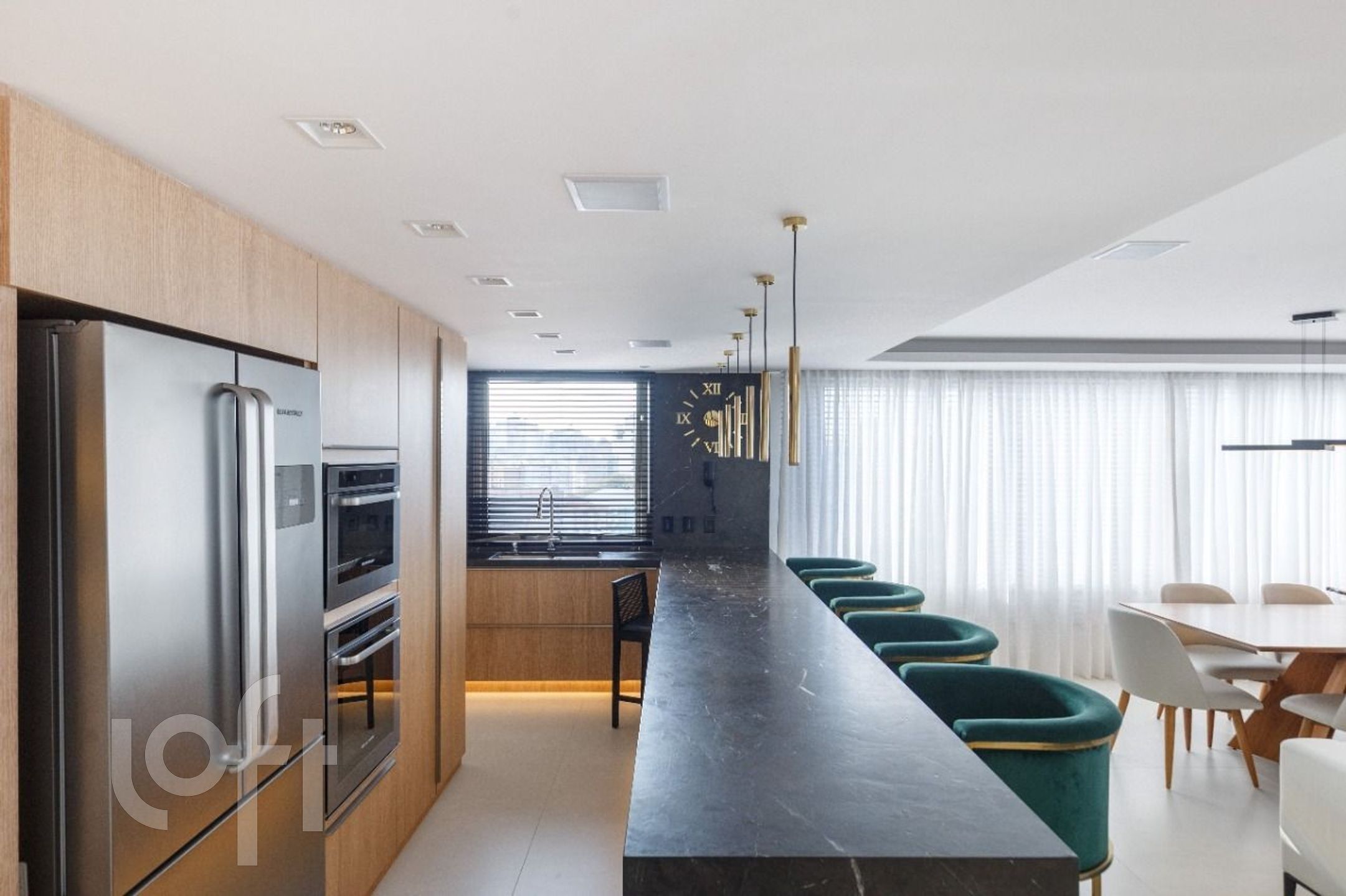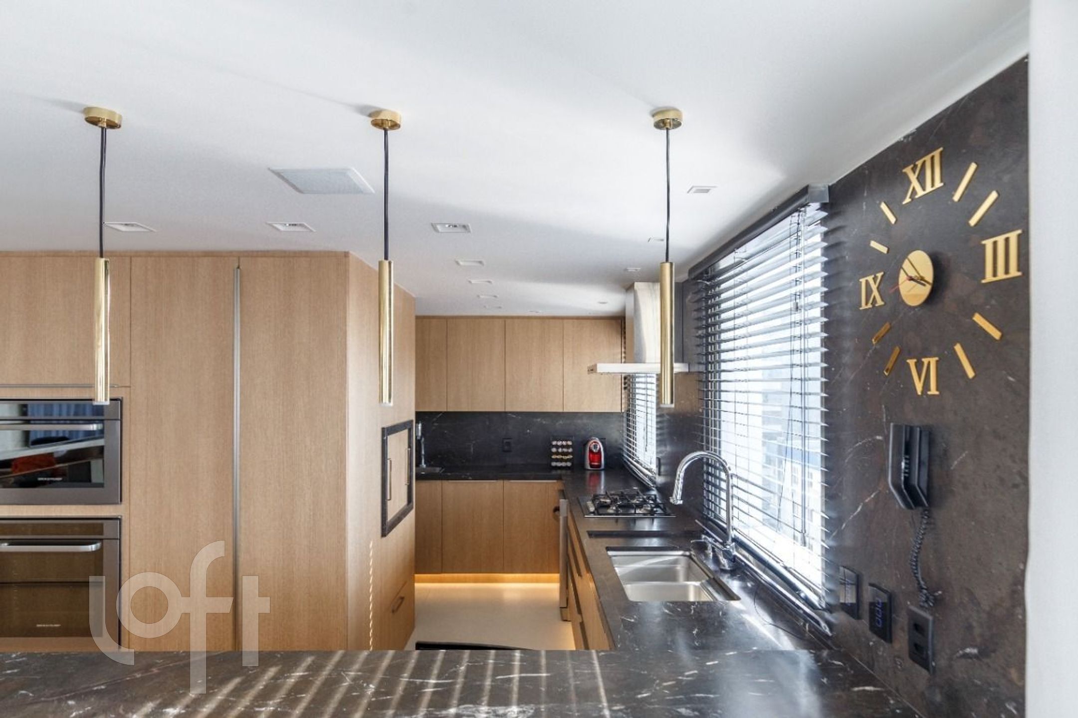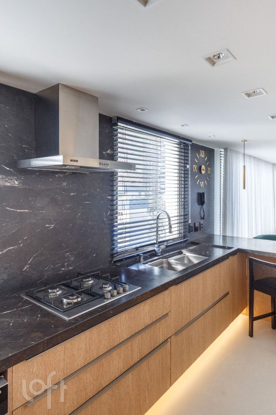 Cozinha lindamente decorada com ampla bancada em pedra e móveis DellAnno