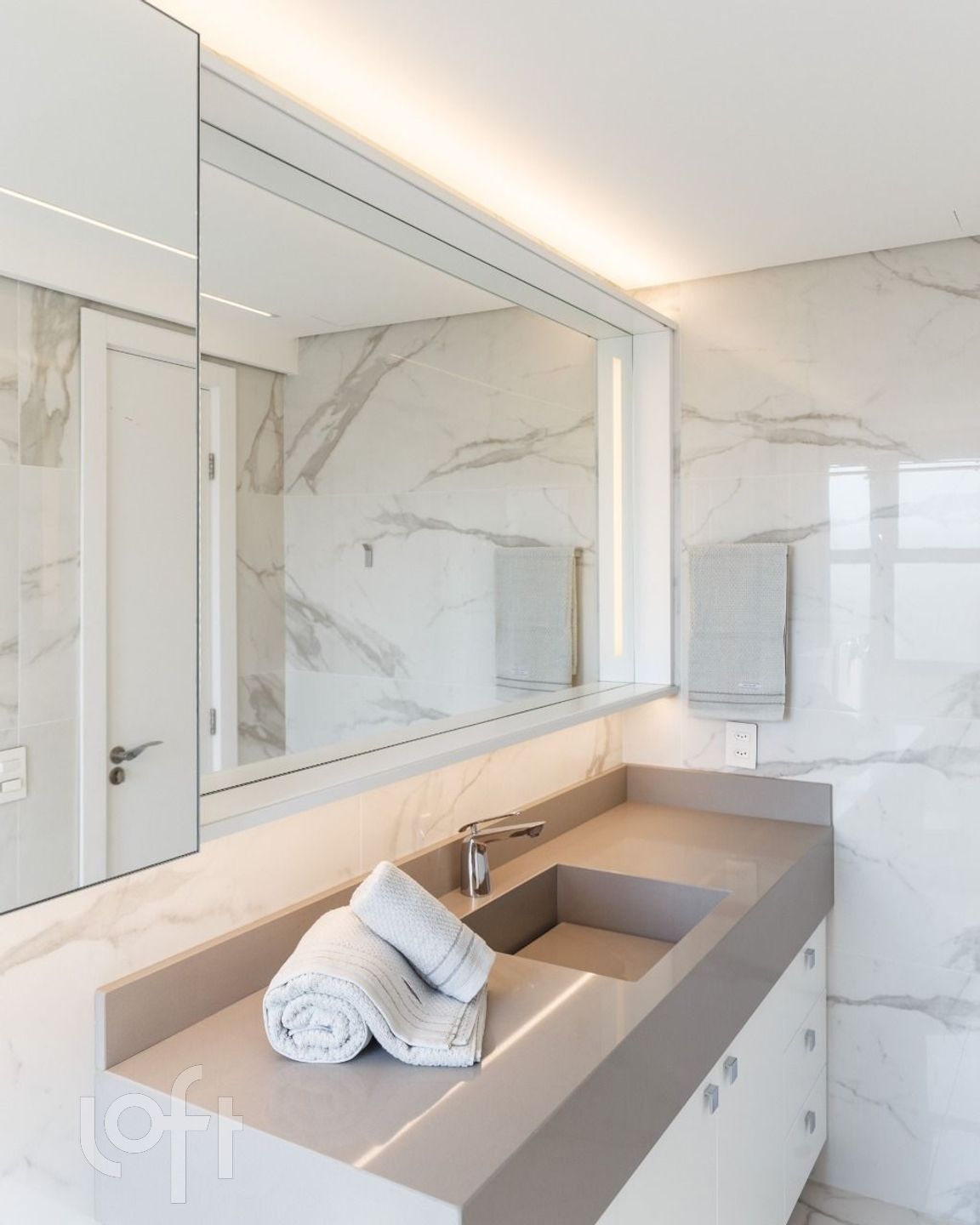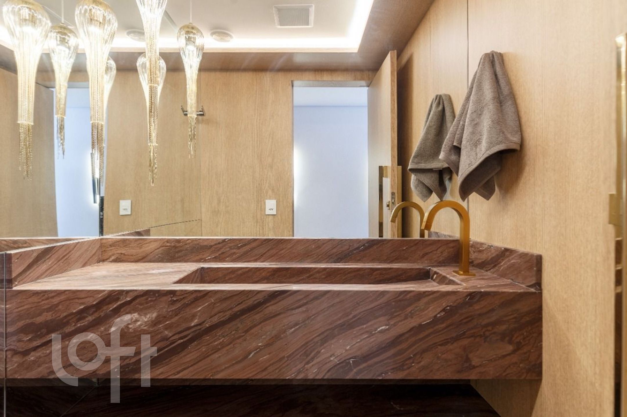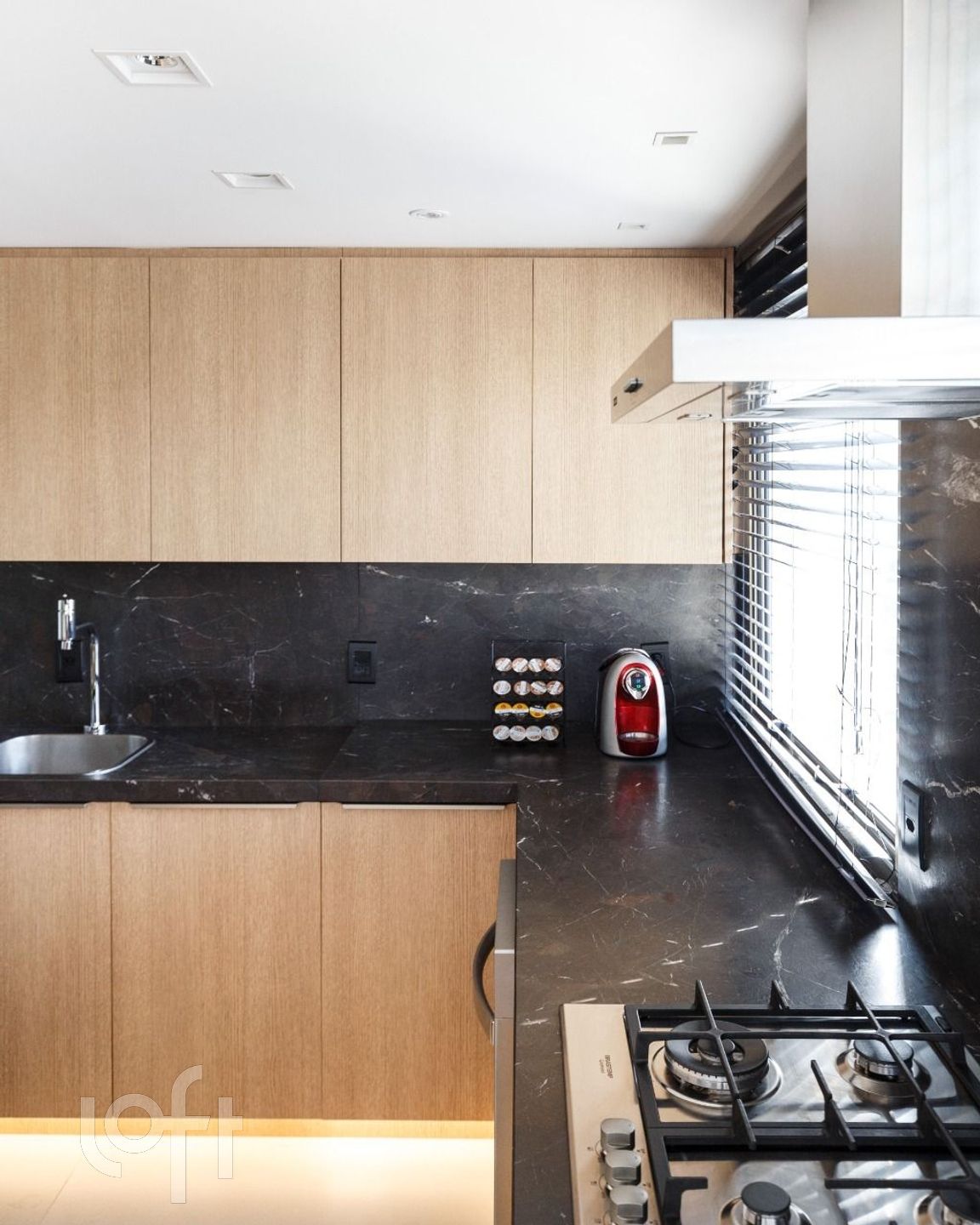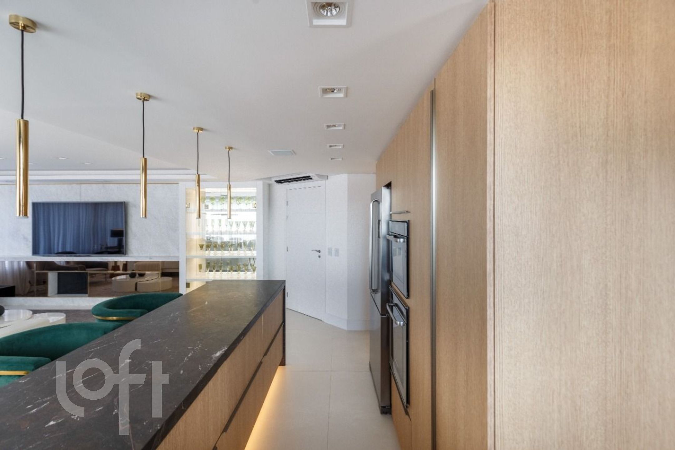 Cozinha lindamente decorada com ampla bancada em pedra e móveis DellAnno