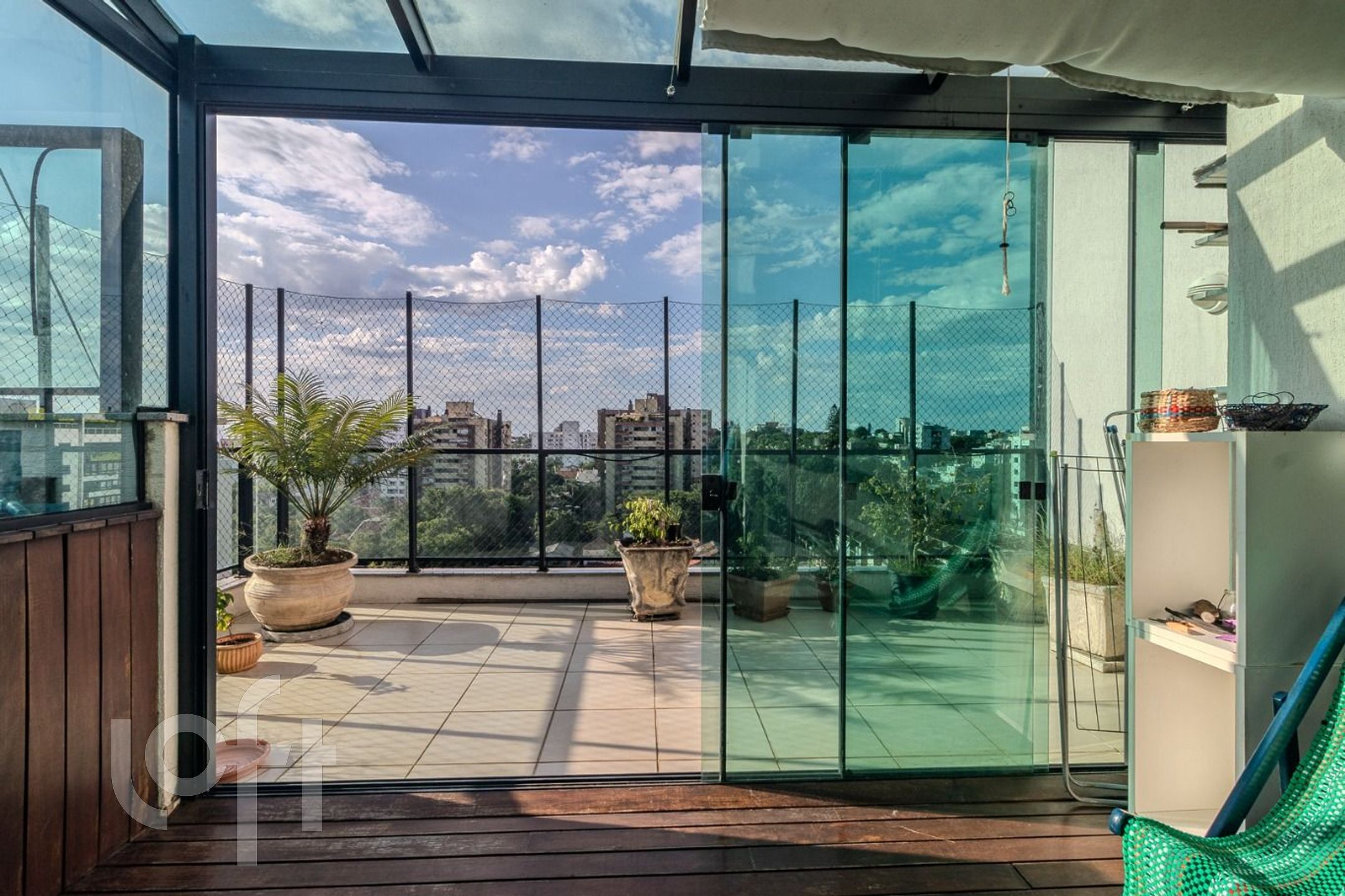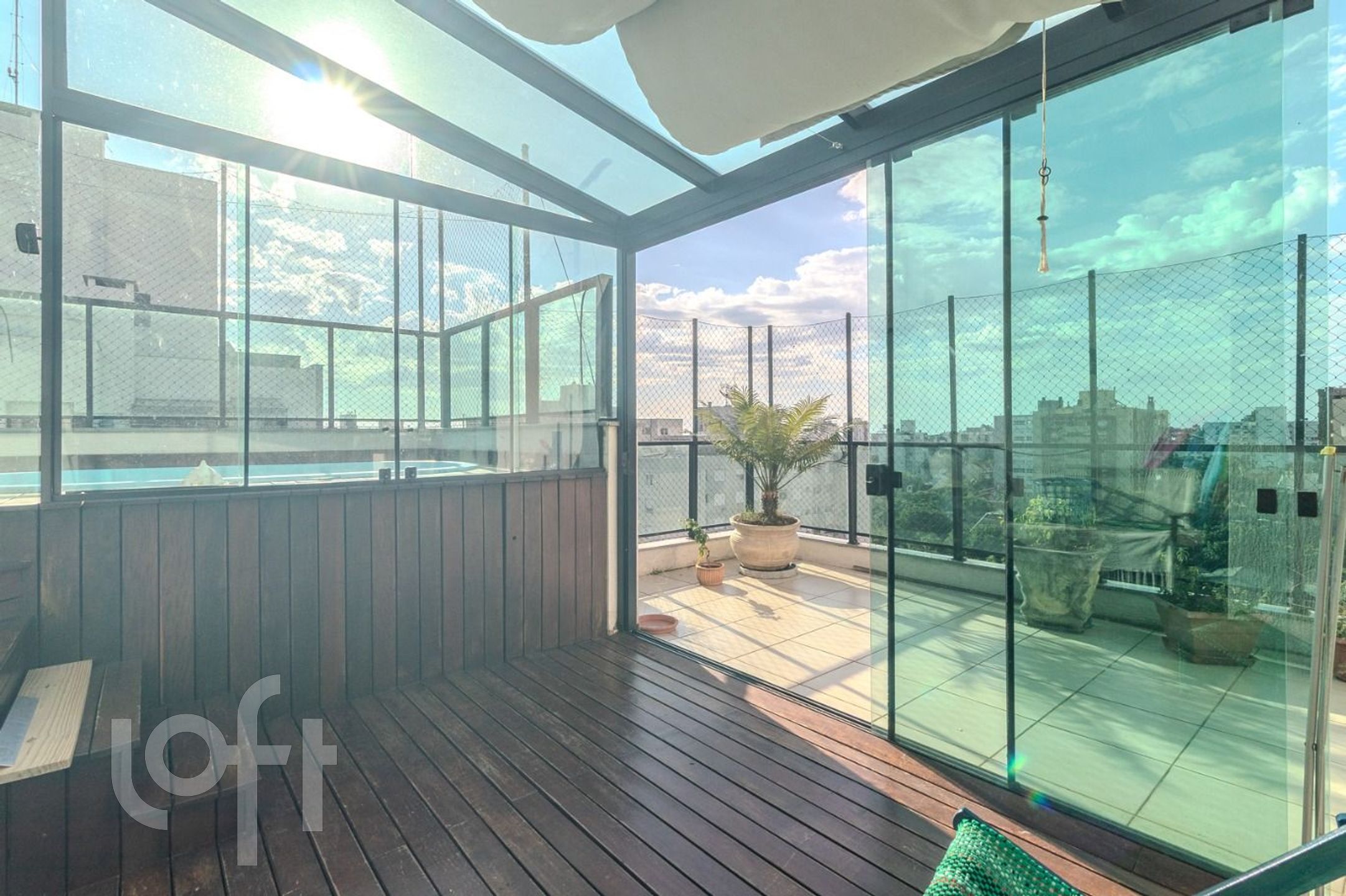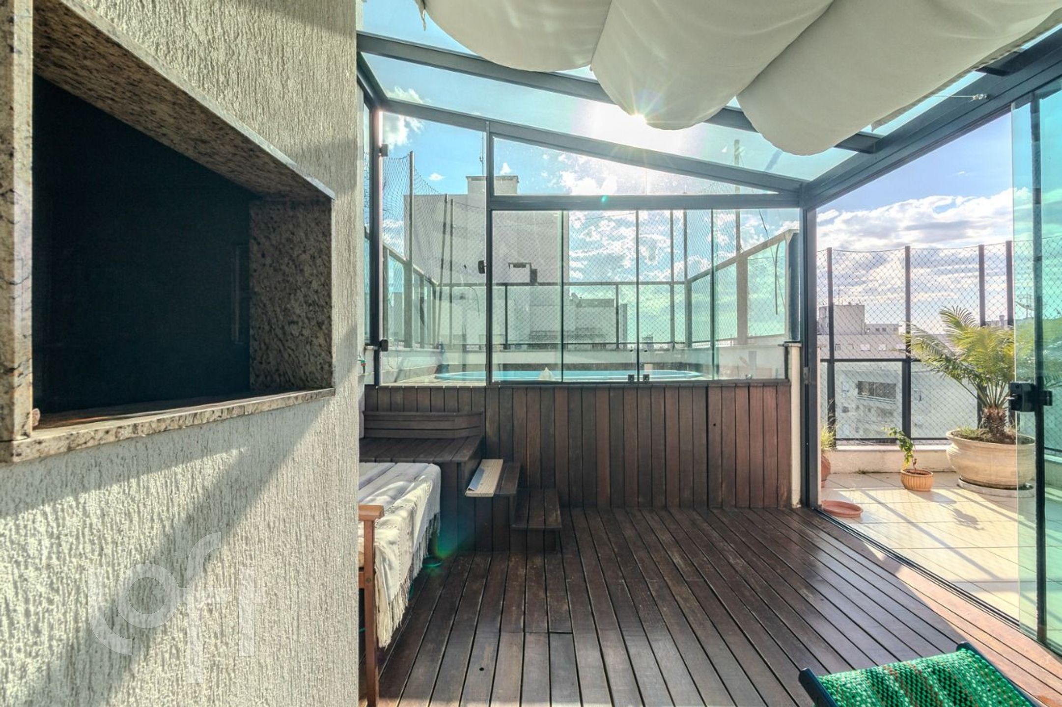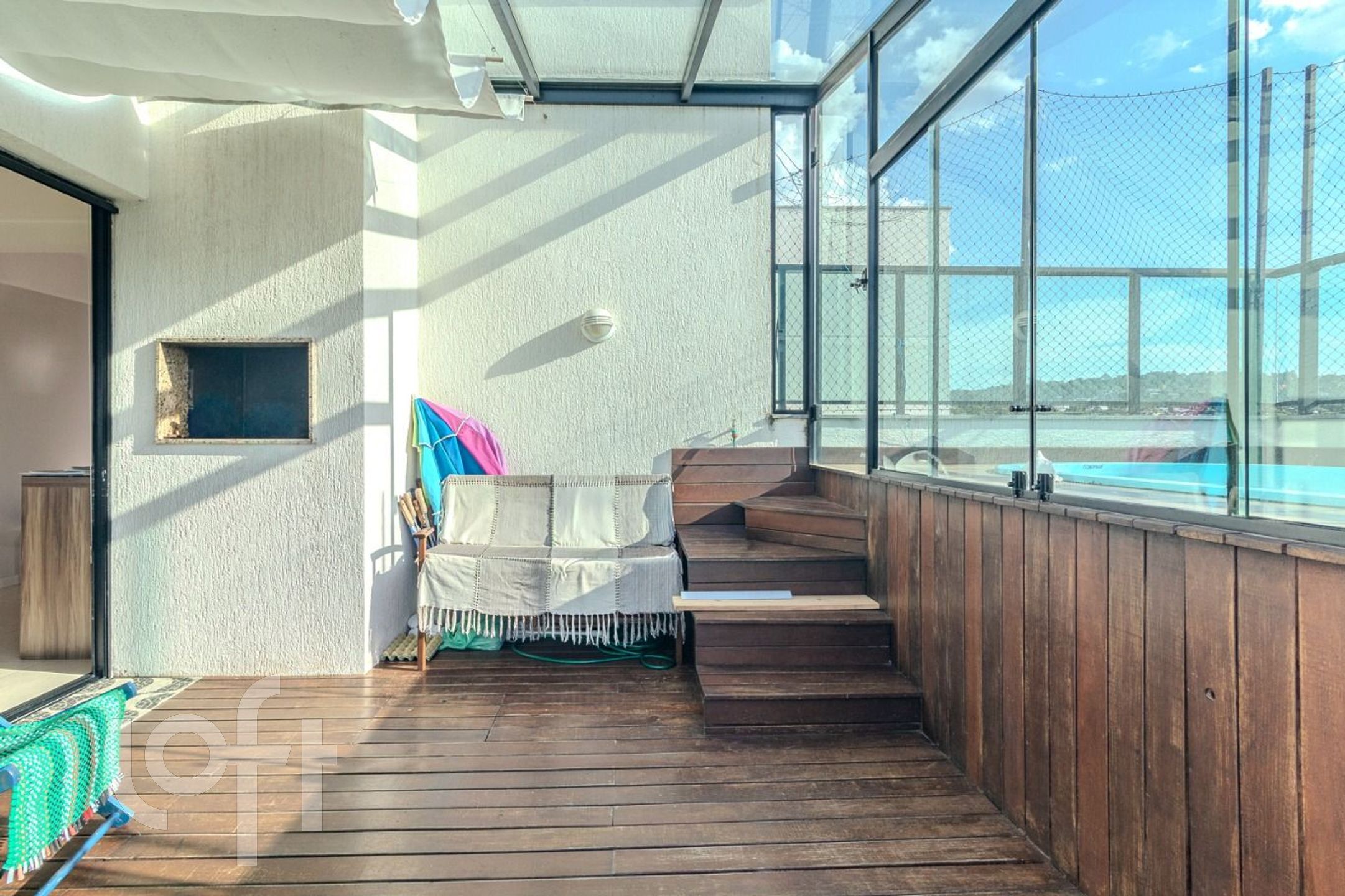 O terraço é um dos grandes destaques, equipado com deck com piscina e churrasqueira, parcialmente fechado com vidro temperado, proporcionando maior conforto e uma vista contemplativa.