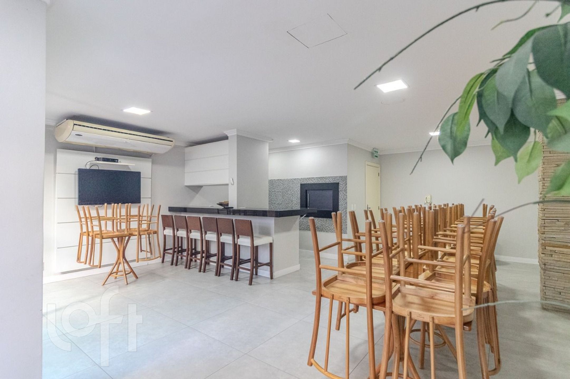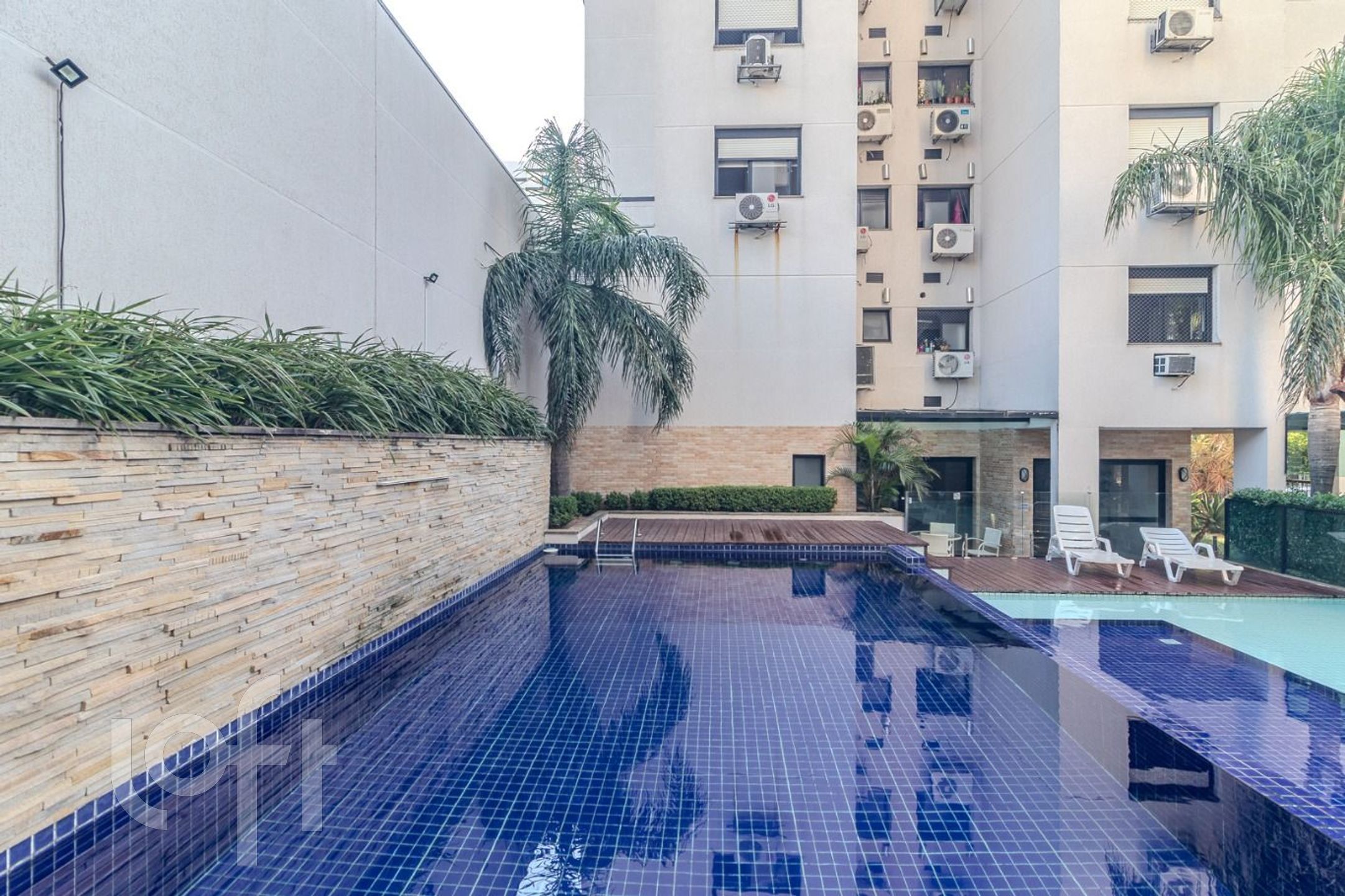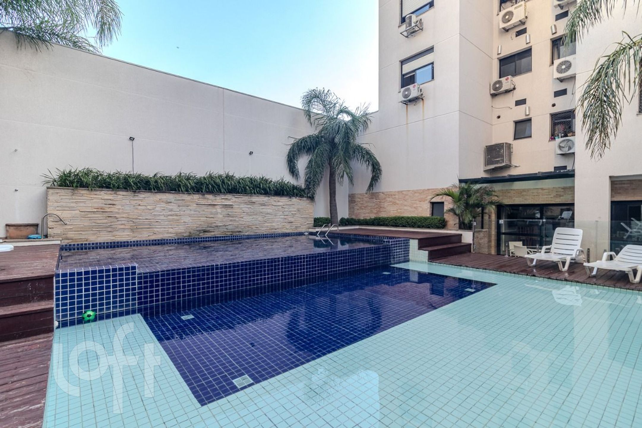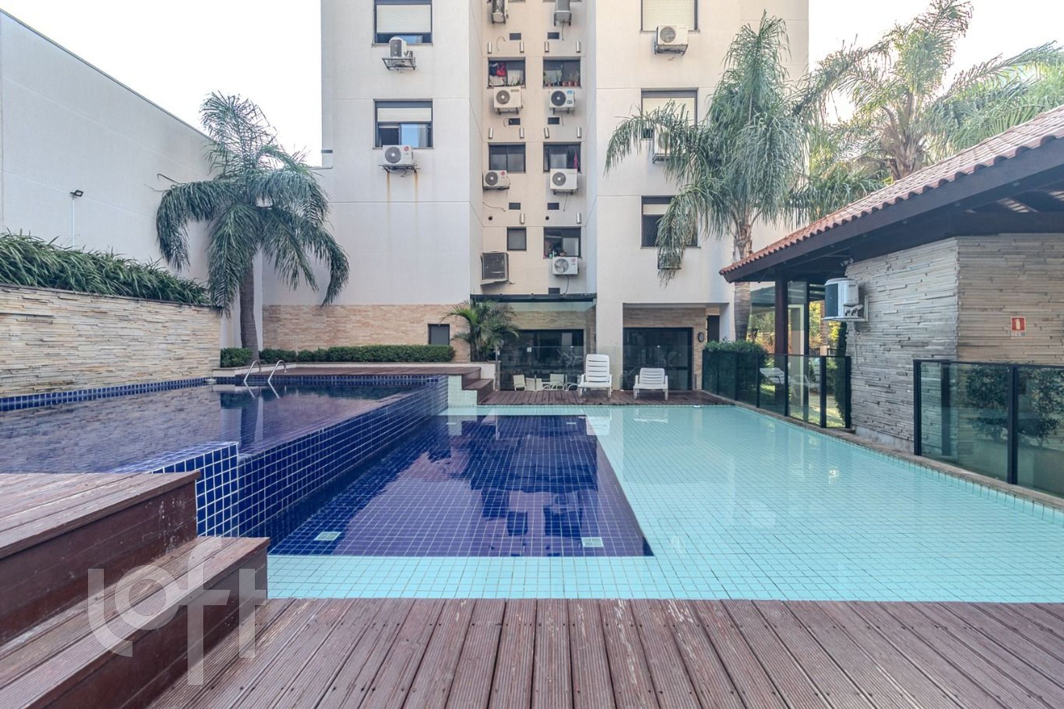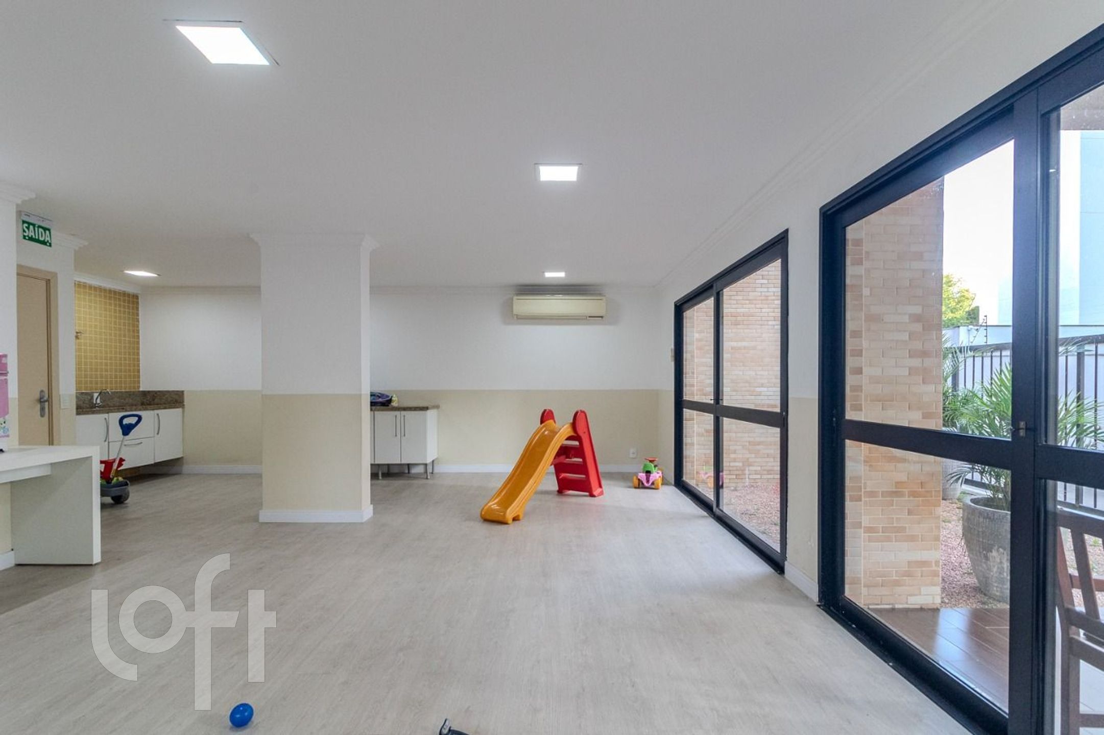 O condomínio oferece infraestrutura completa: piscinas adulto e infantil, salão de festas, brinquedoteca, portaria 24h virtual, hall receptivo, sala fitness, espaço de leitura/coworking, playground e gás central.