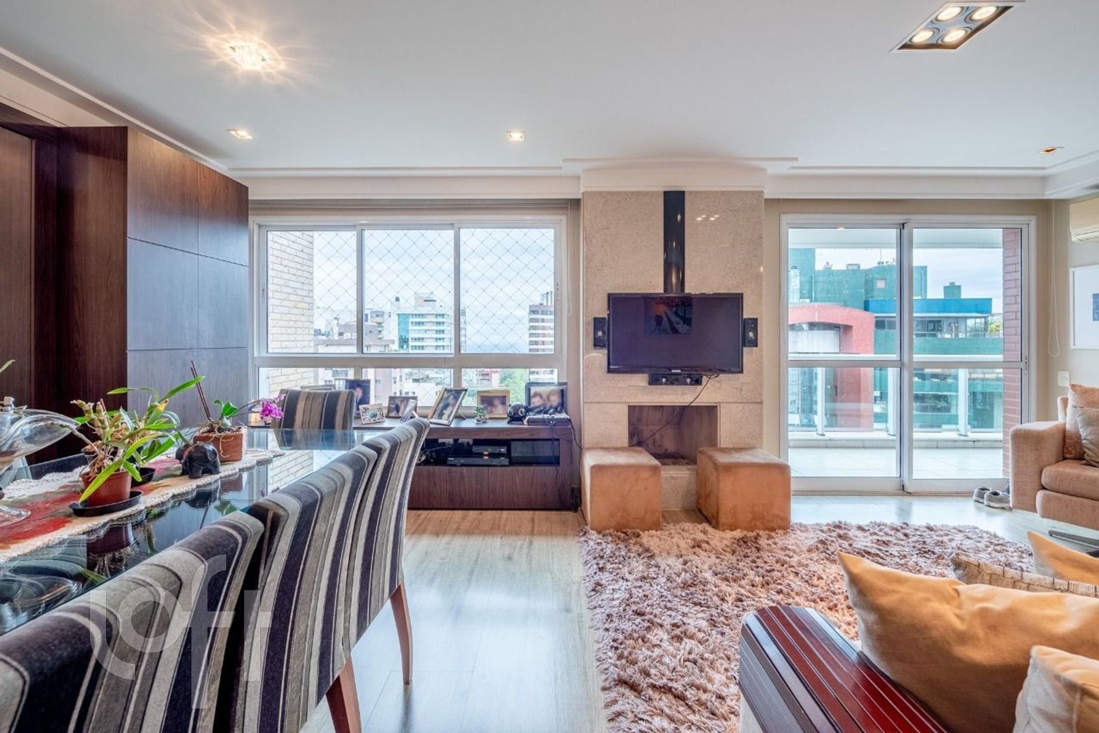 ? Social: Living para 3 ambientes com lareira e churrasqueira integrada.