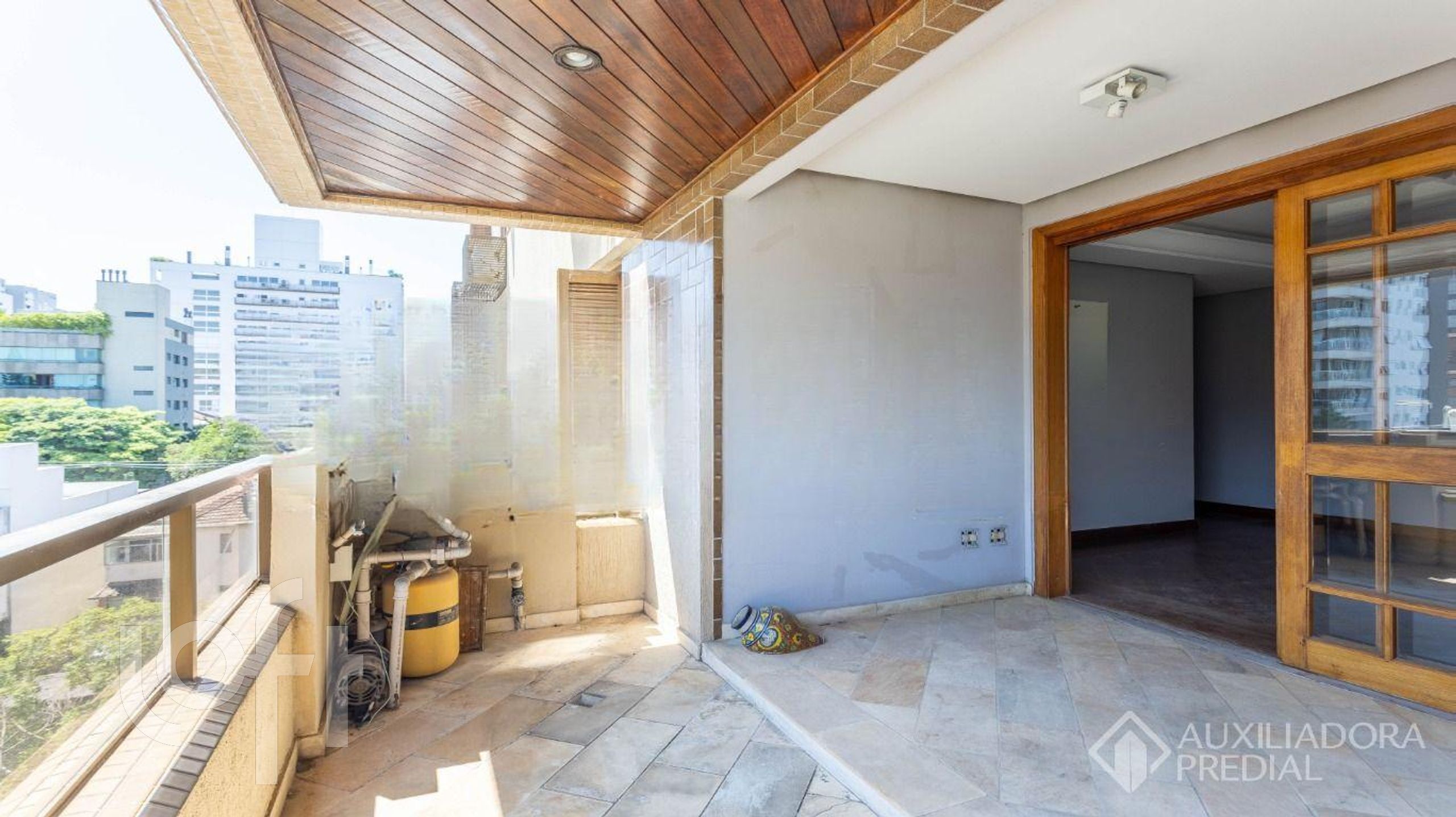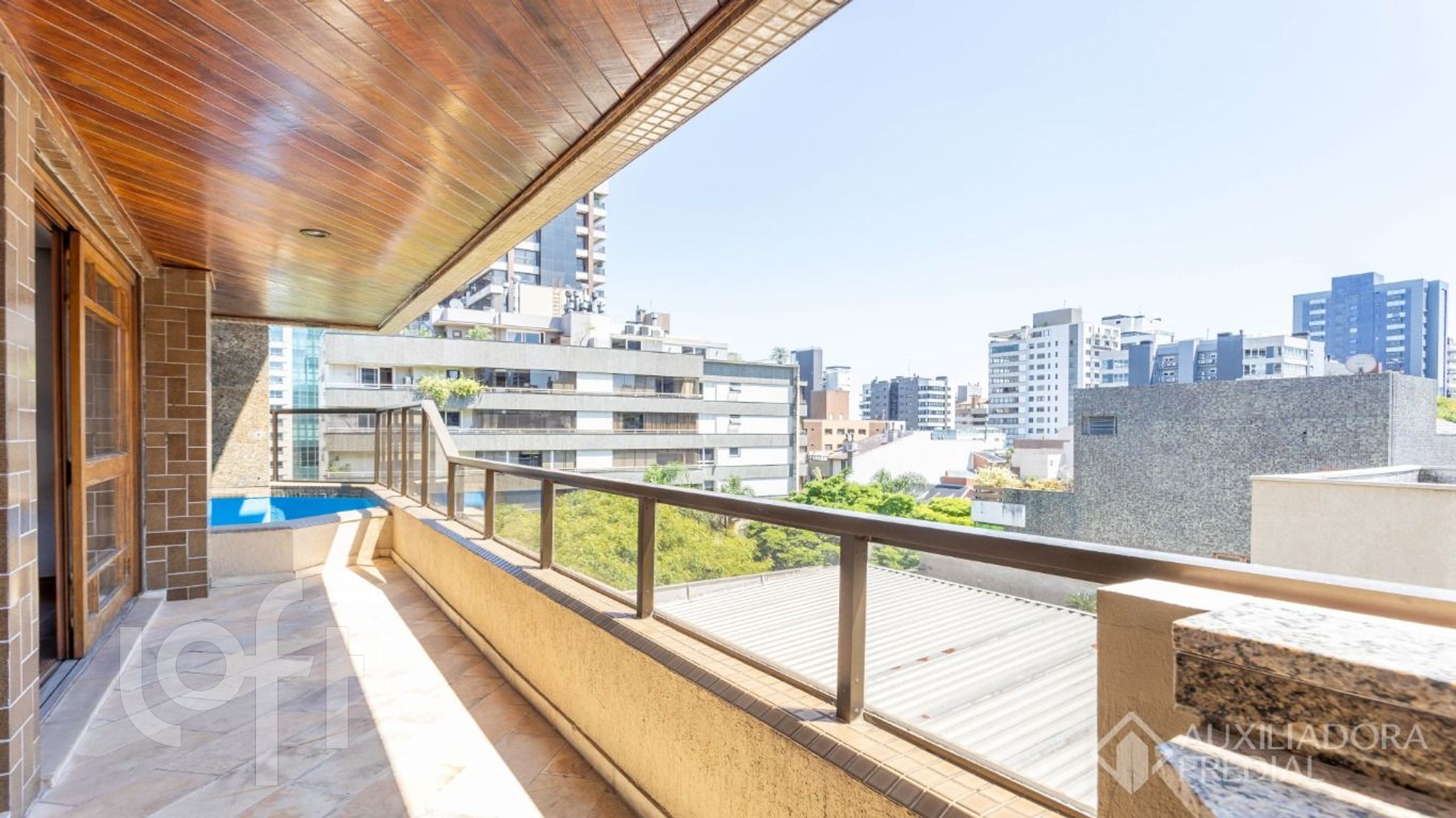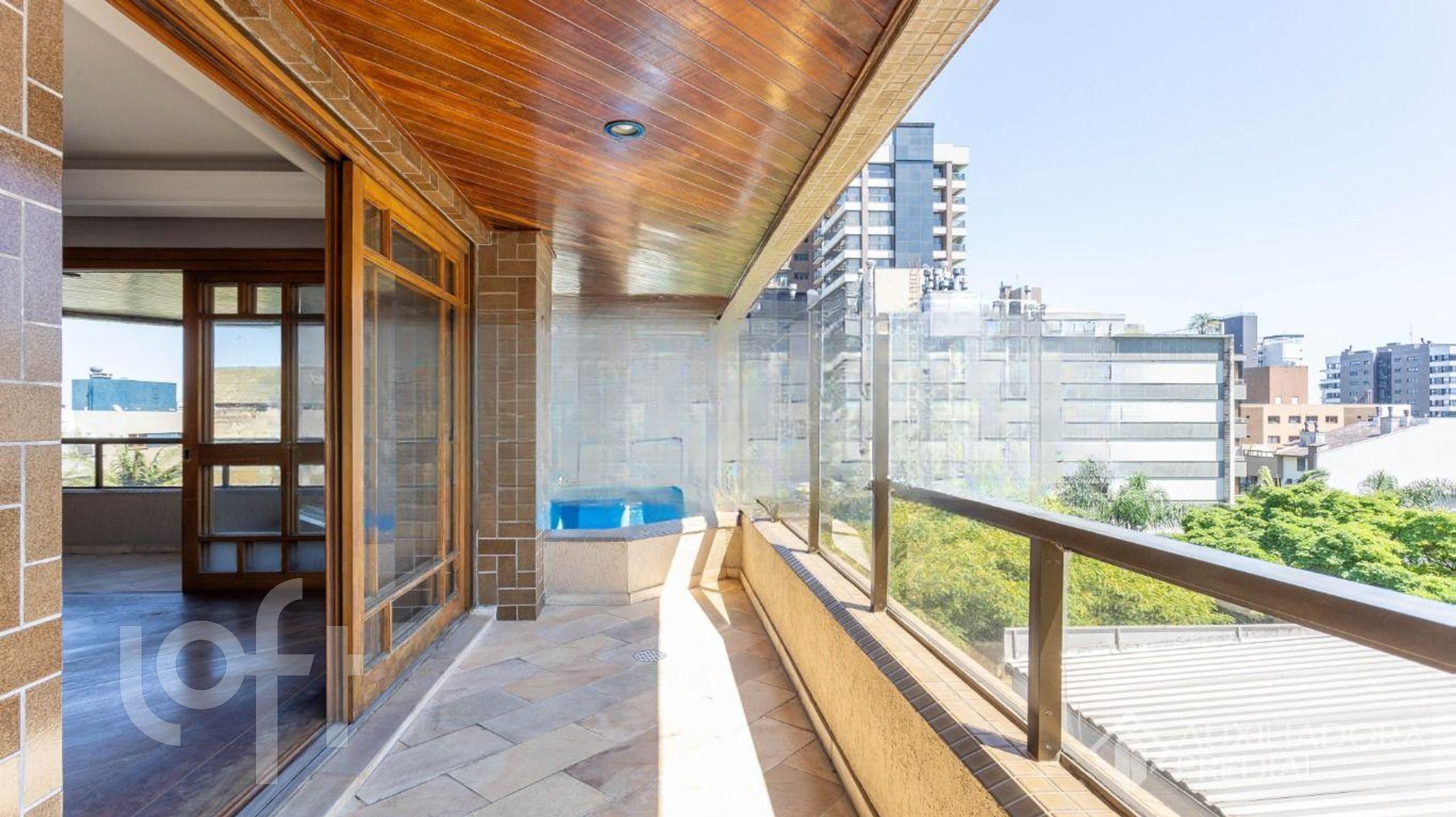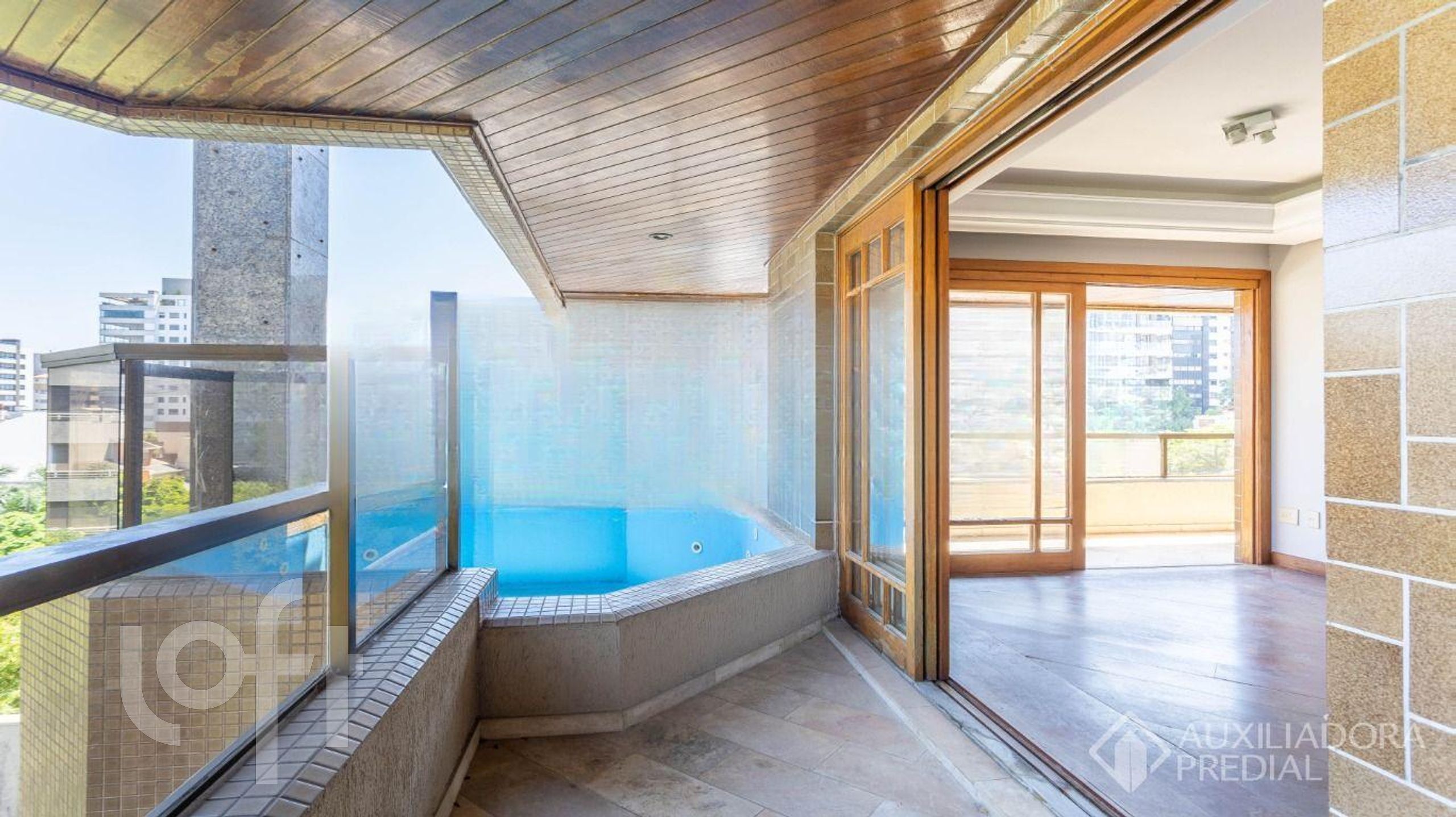 O estar conta ainda com uma segunda sacada com piscina privativa, criando um espaço exclusivo para lazer e convivência.