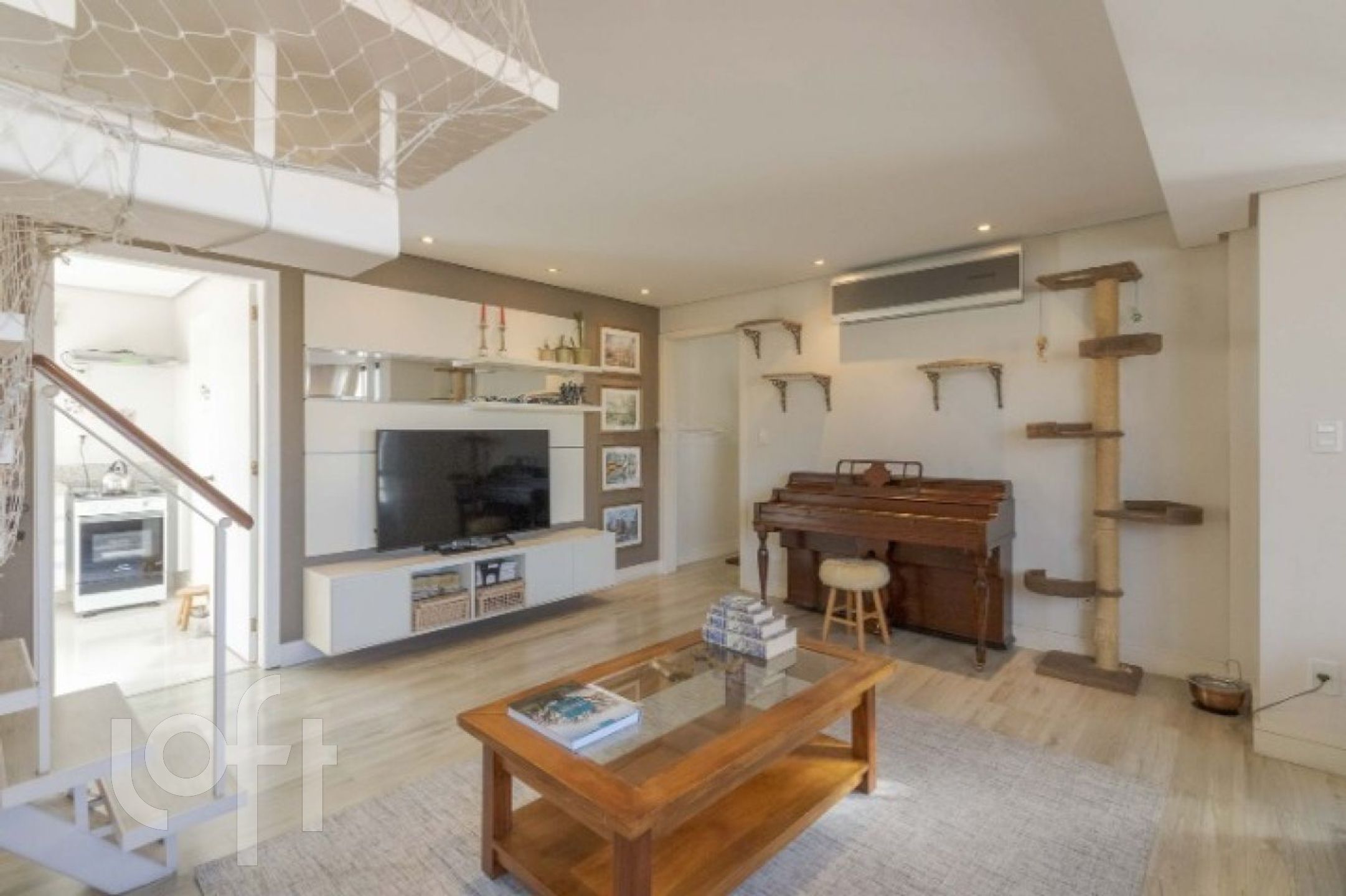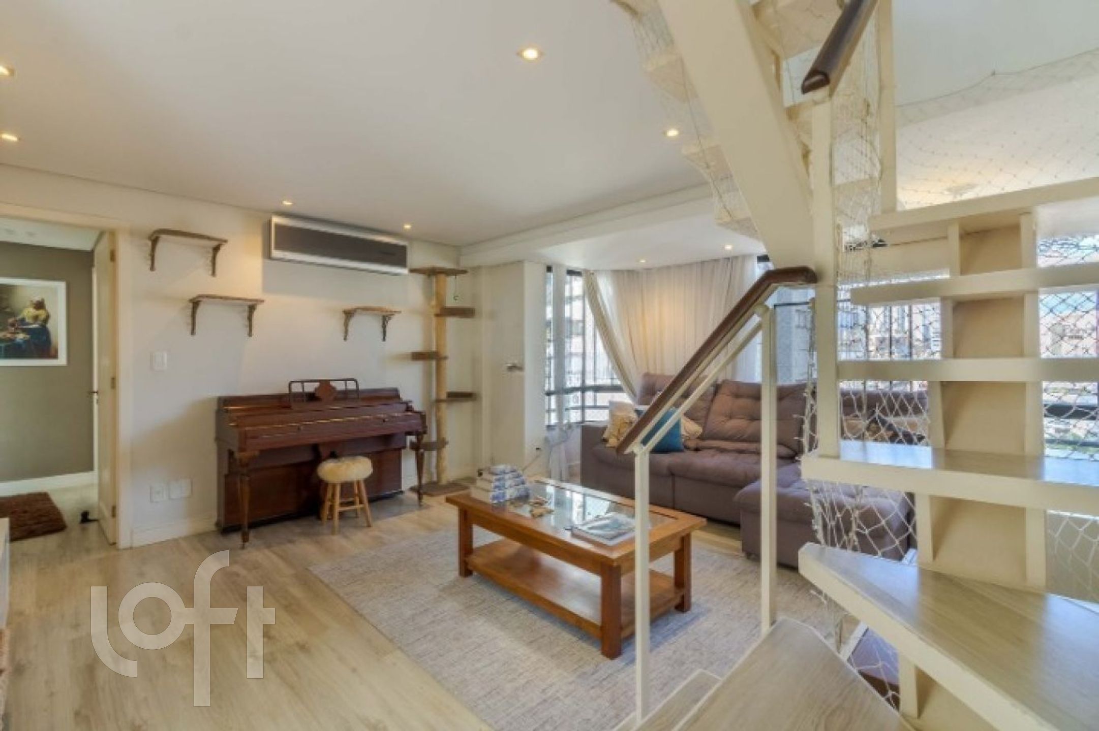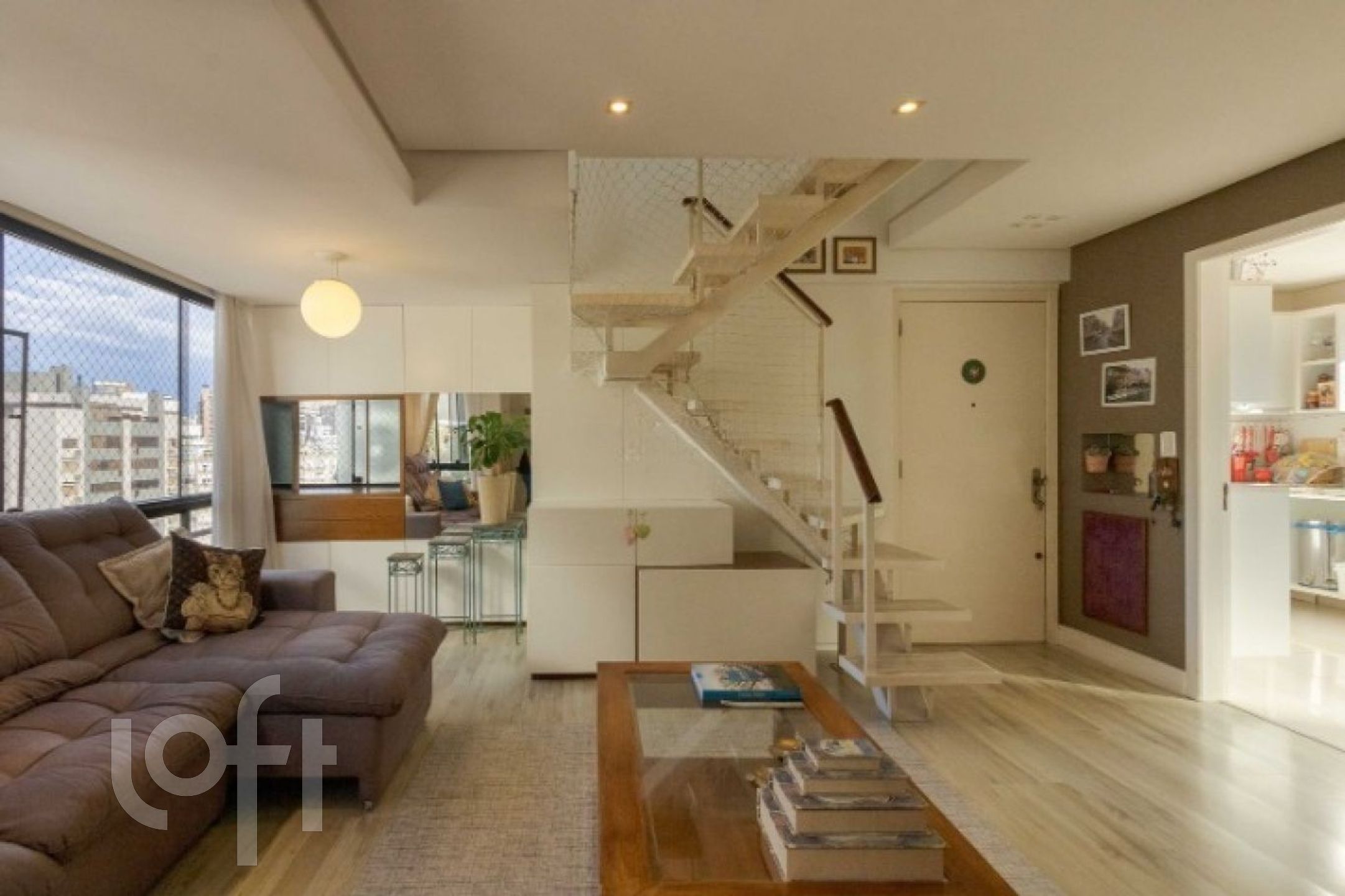 No piso inferior temos as 2 suítes, living para 2 ambientes, cozinha mobiliada e área de serviço com banheiro auxiliar.