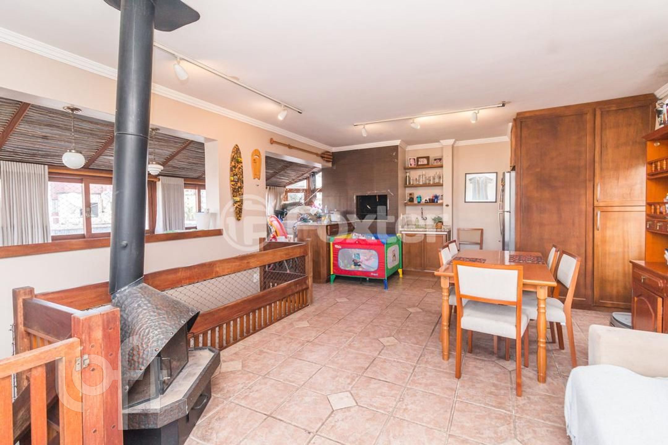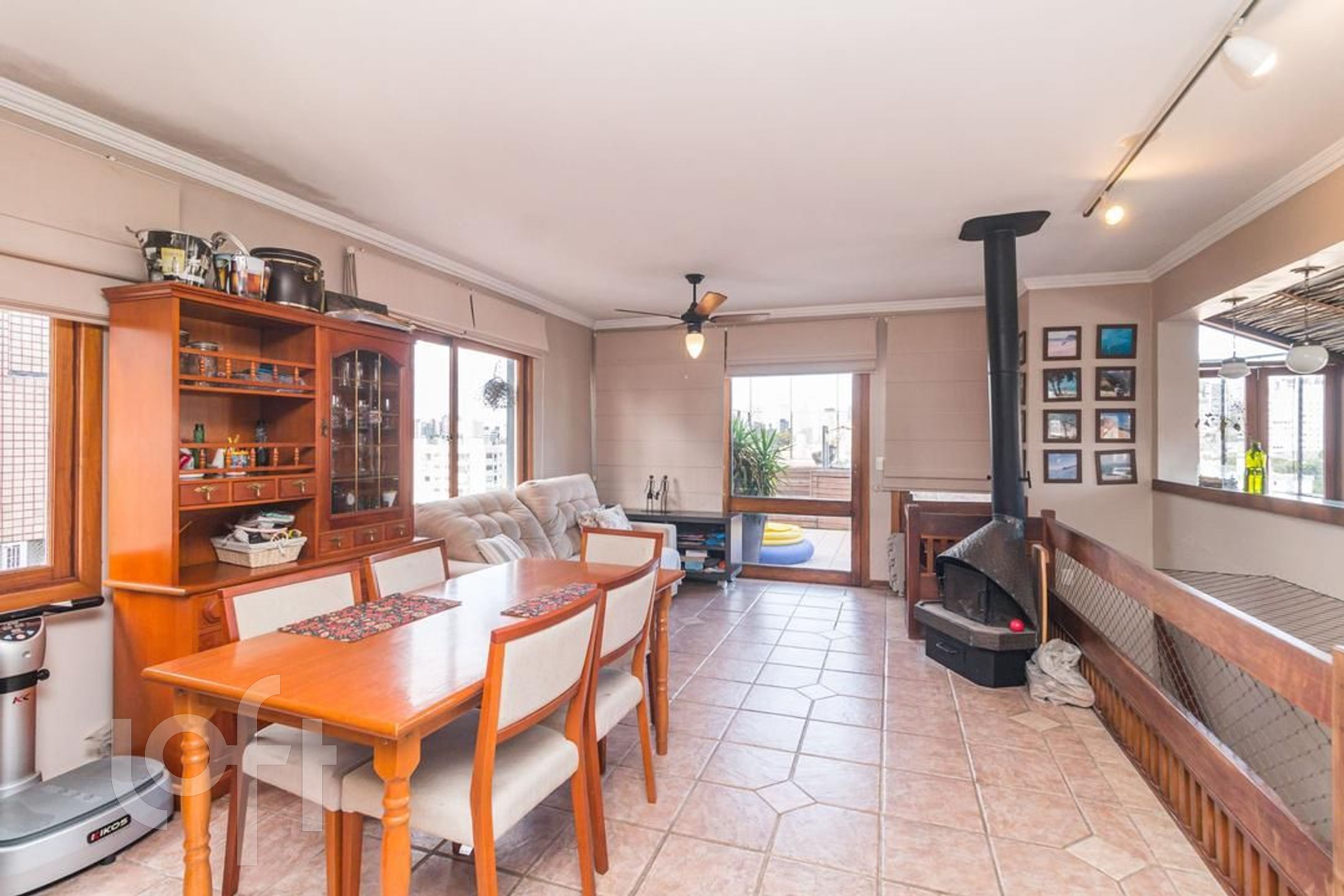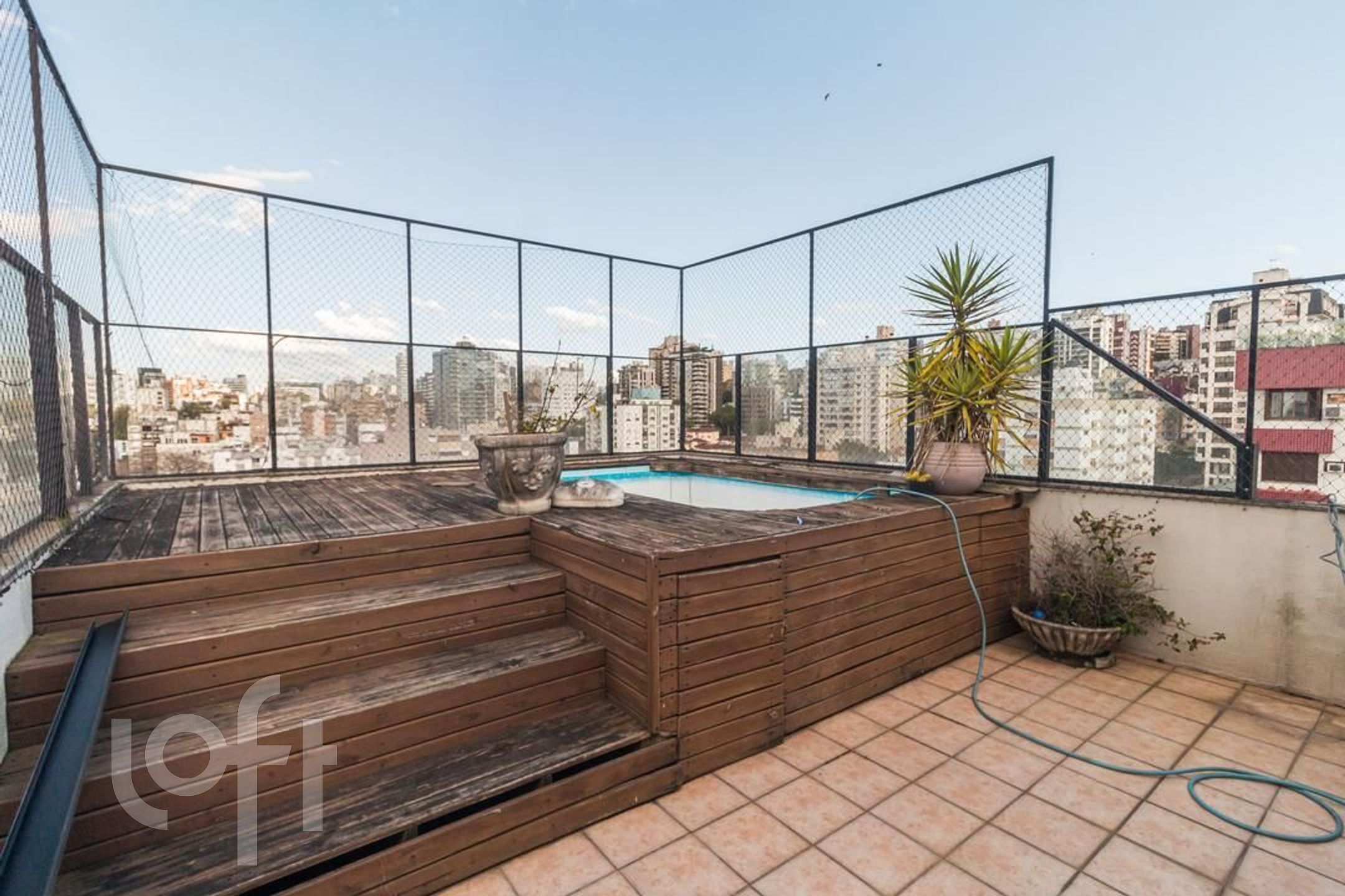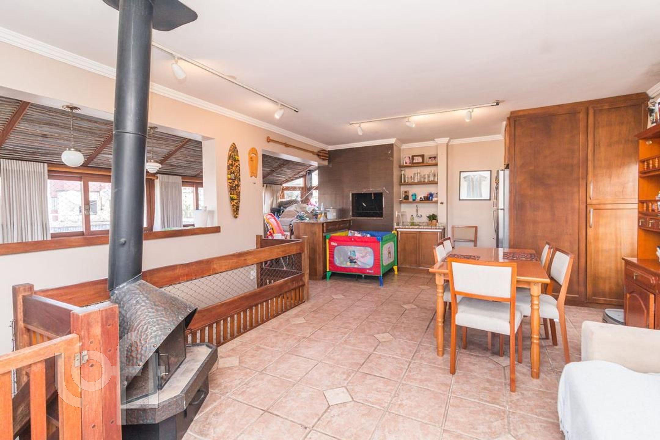 Possui 2 dormitorios (1 suite), originalmente com 3.Living amplo com sacada integrada, banho social, cozinha com area de serviço separada, escada de madeira. Parte superior social com lareira , churrasqueira, piscina, banho , vista panorâmica. Norte/Leste.