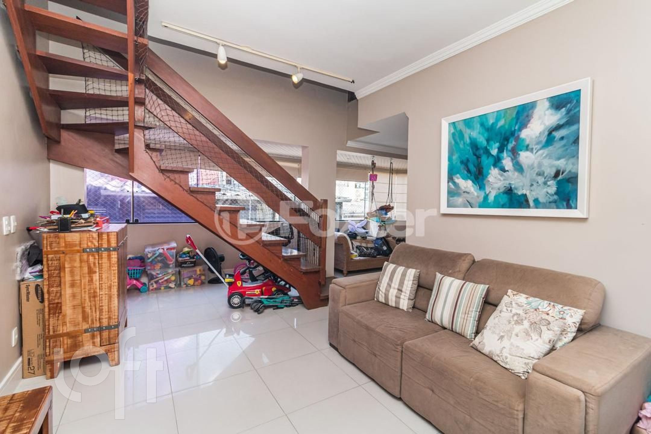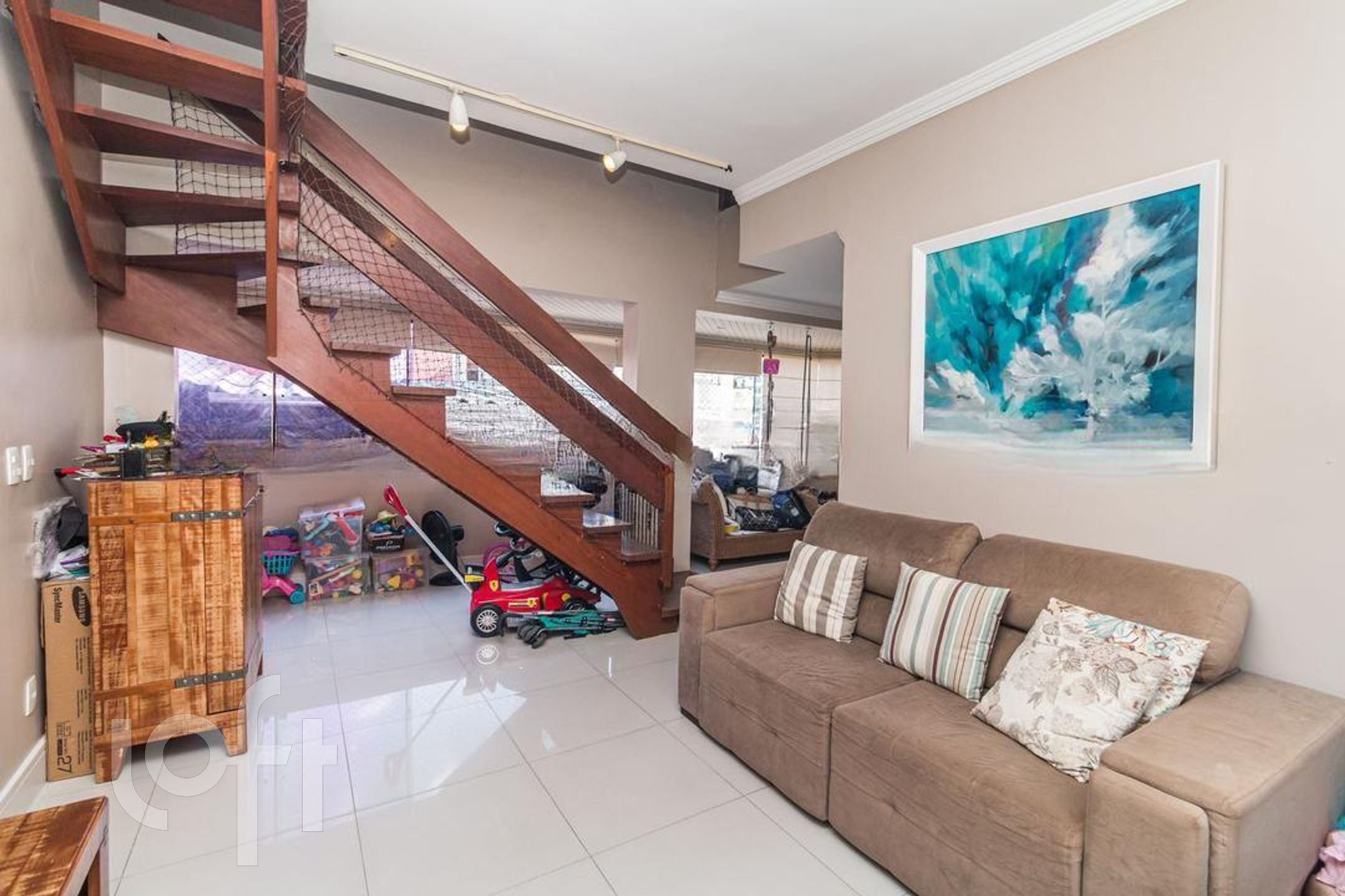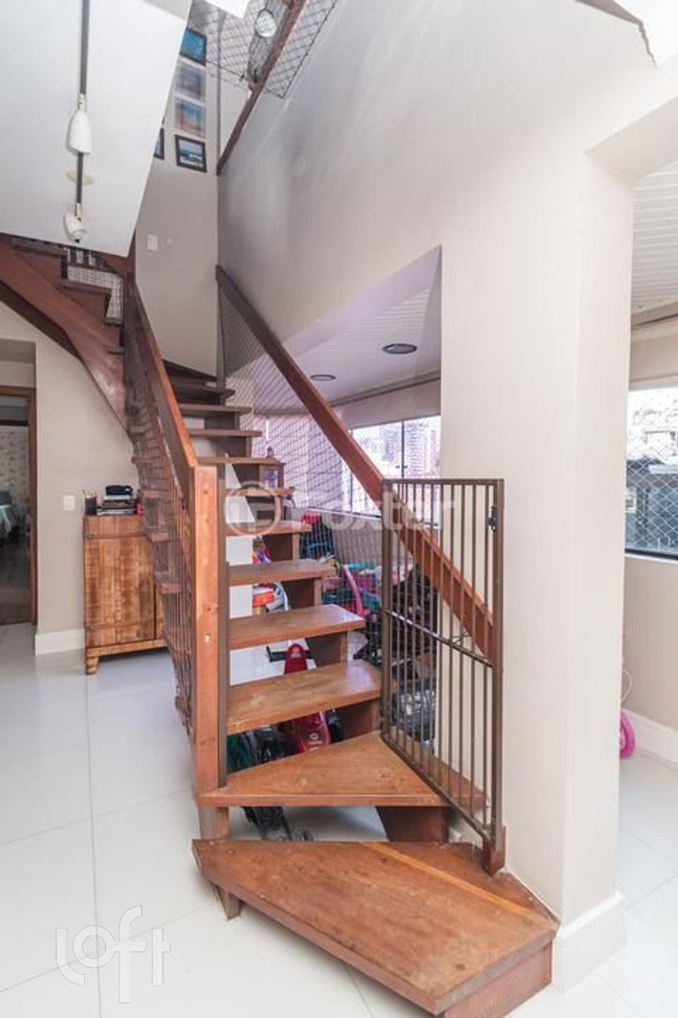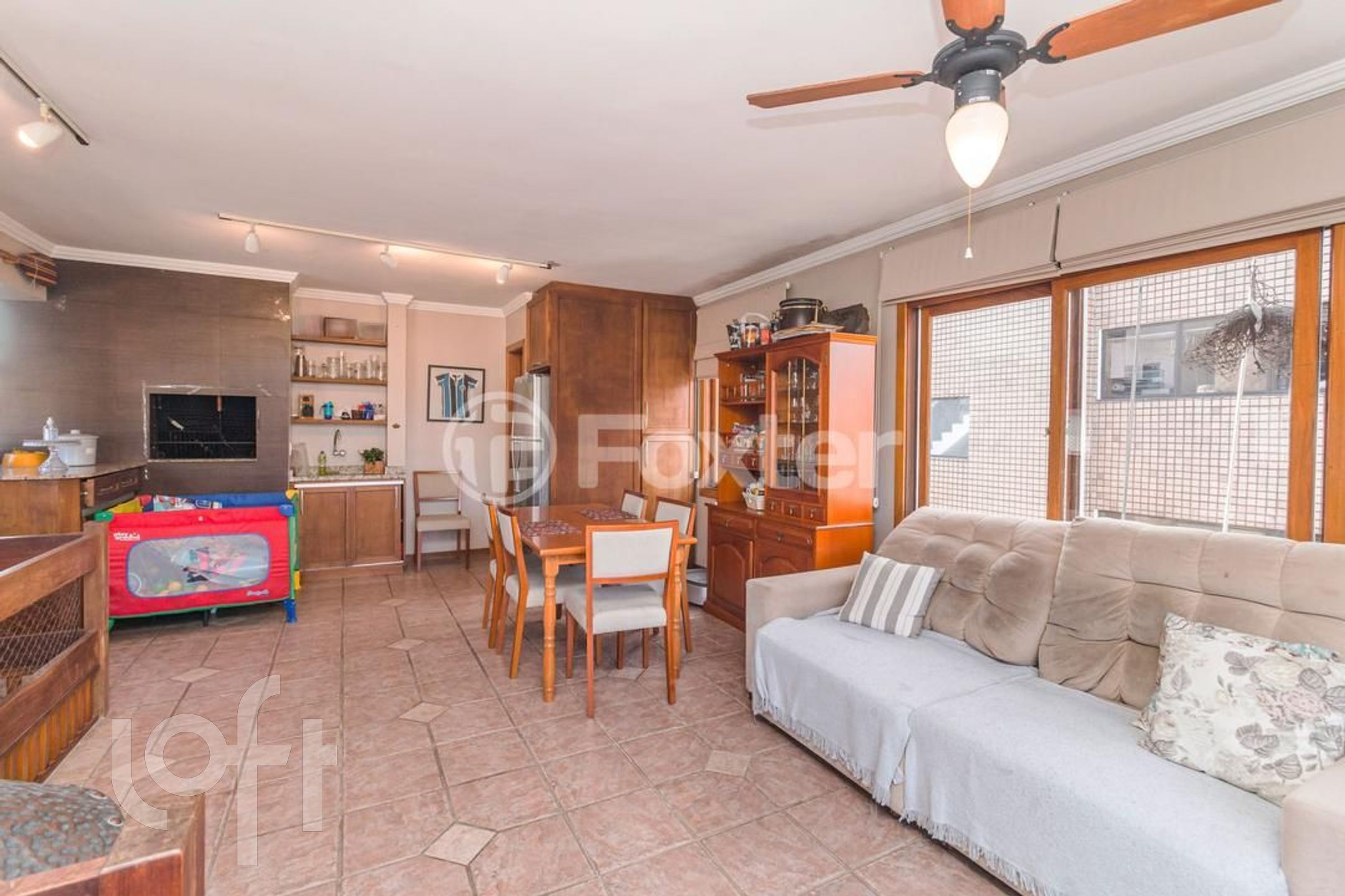 Possui 2 dormitorios (1 suite), originalmente com 3.Living amplo com sacada integrada, banho social, cozinha com area de serviço separada, escada de madeira. Parte superior social com lareira , churrasqueira, piscina, banho , vista panorâmica. Norte/Leste.