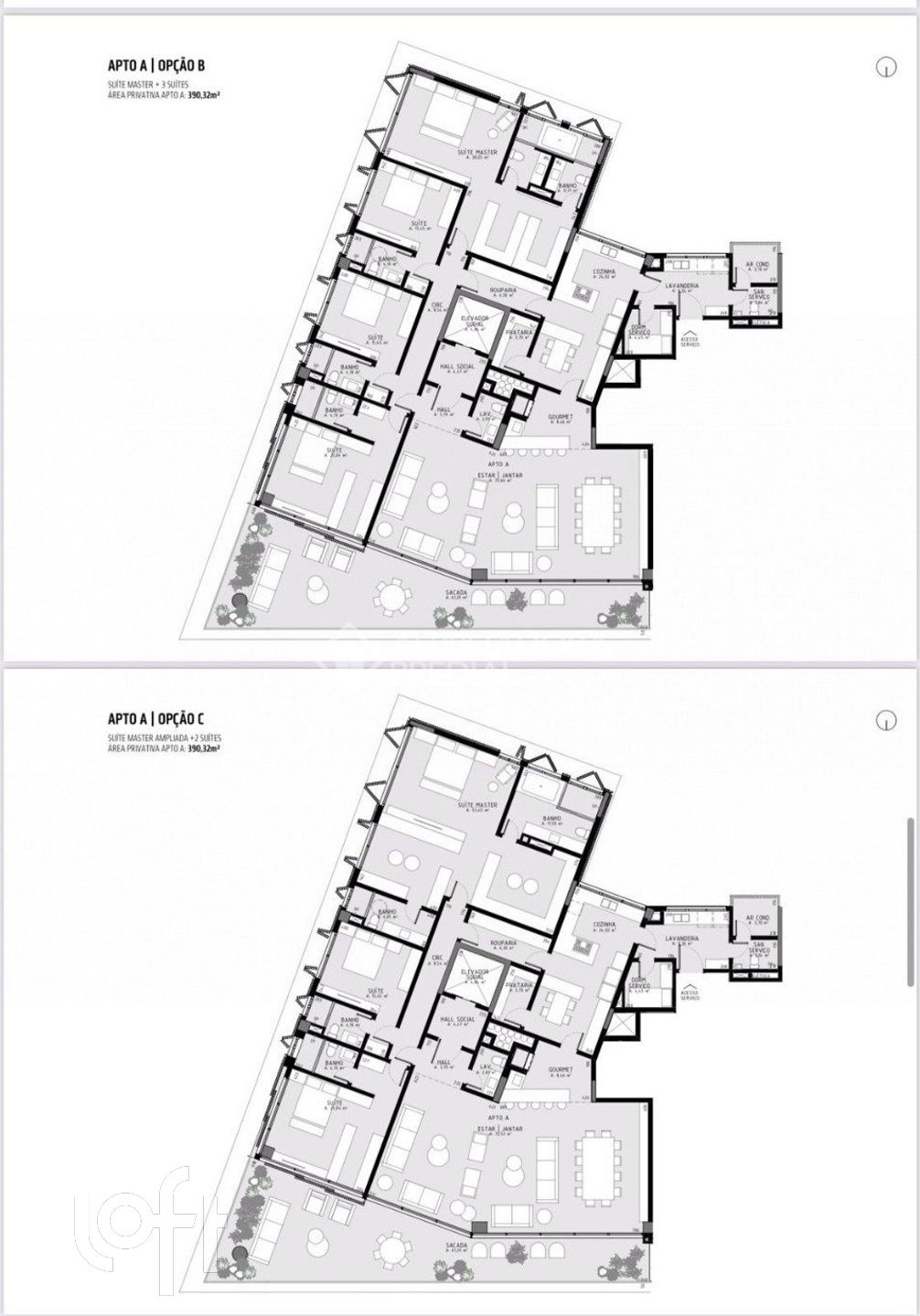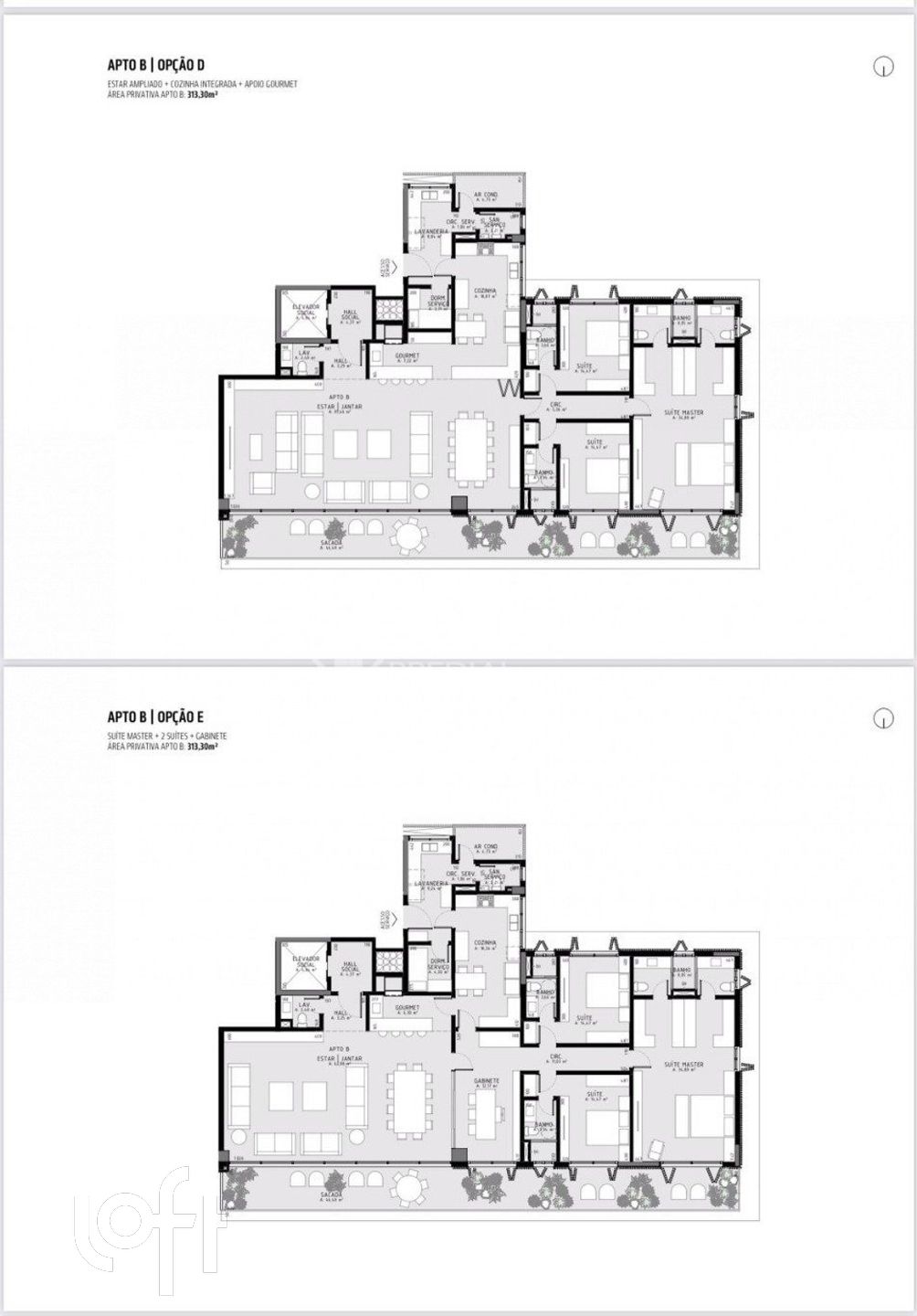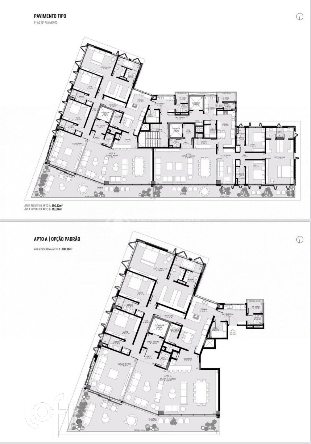 Várias opções de plantas, Apto A opção Padrão, B,C,D e Apto B opção Padrão, B,C,D e E.