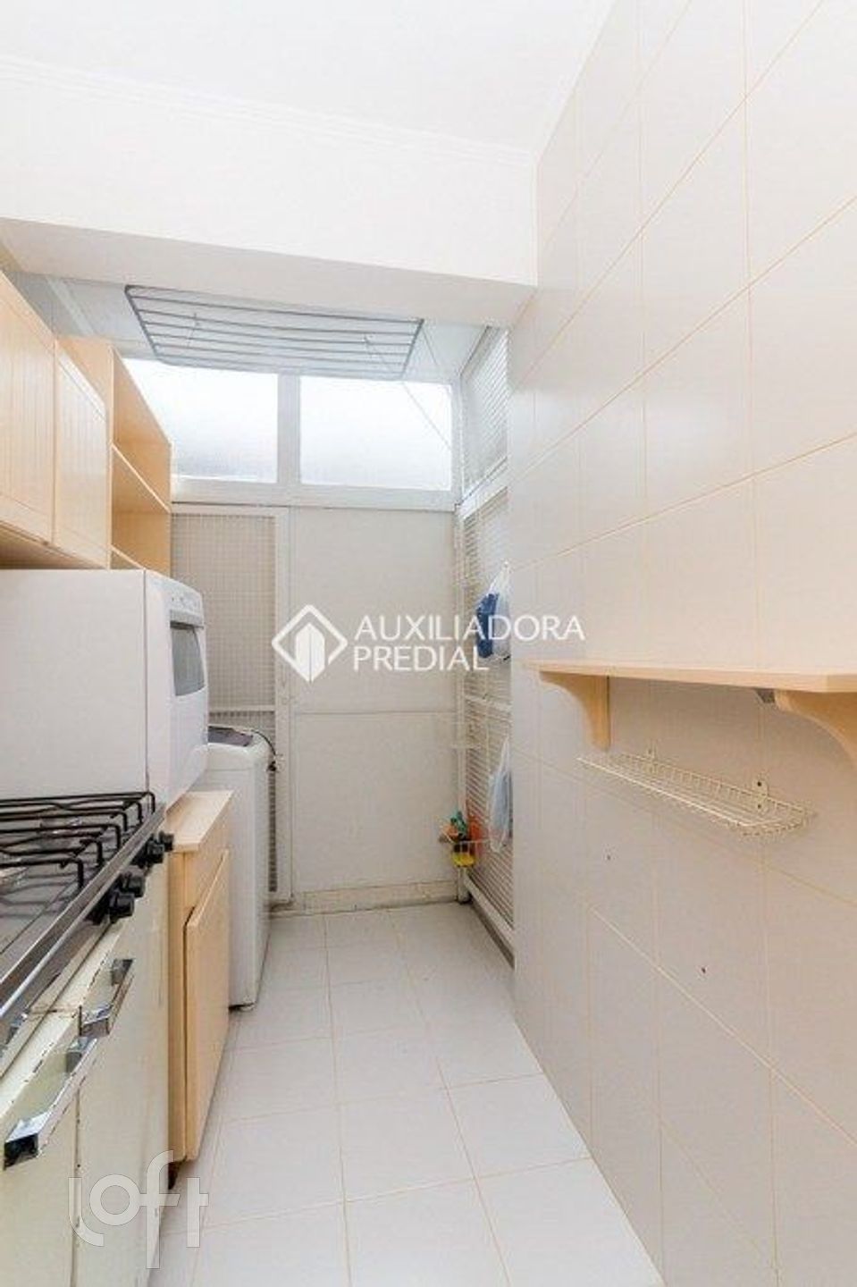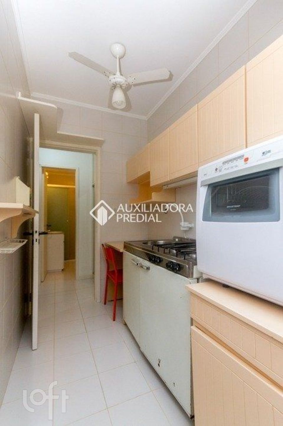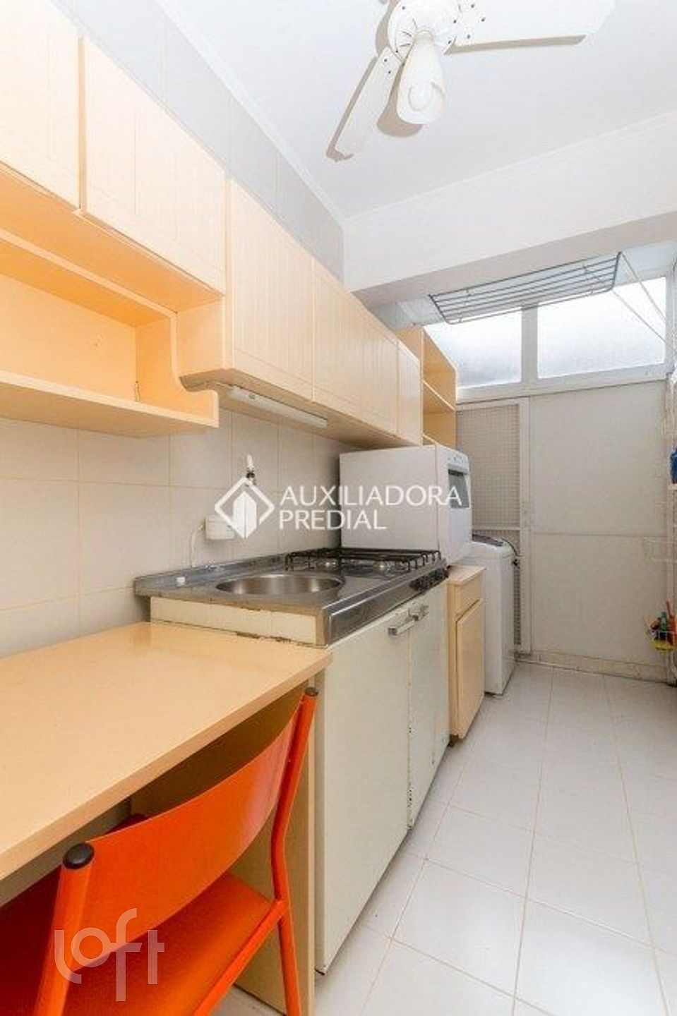 O imóvel conta com ambiente living/dormitório equipado com ar-condicionado split e ventilador de teto, além de cozinha e torneira elétrica. Possui ainda área de serviço e banheiro social com box e armários.