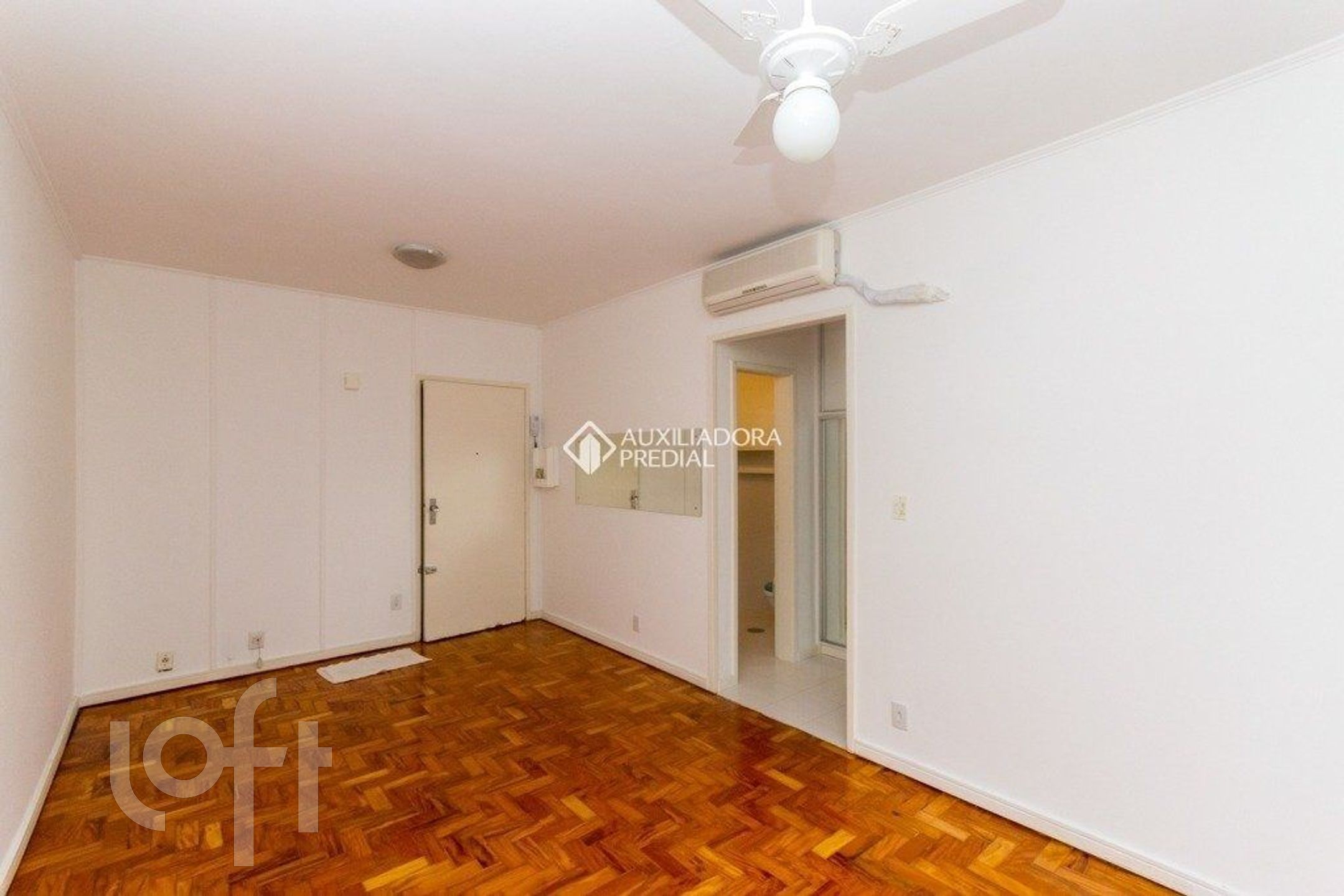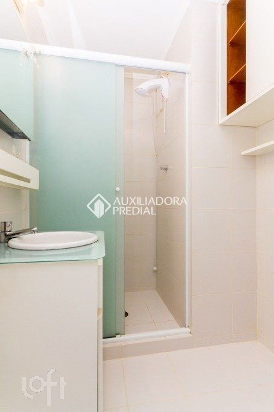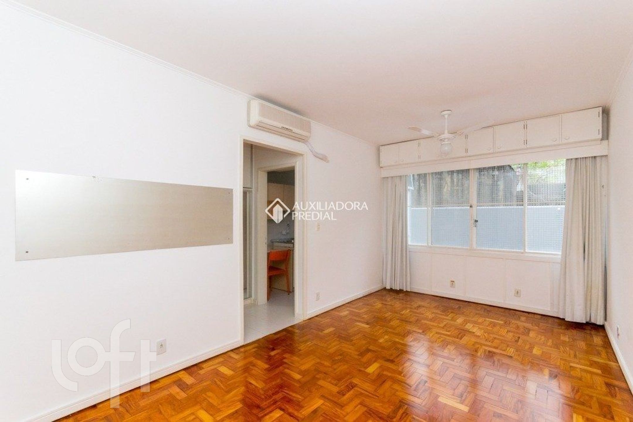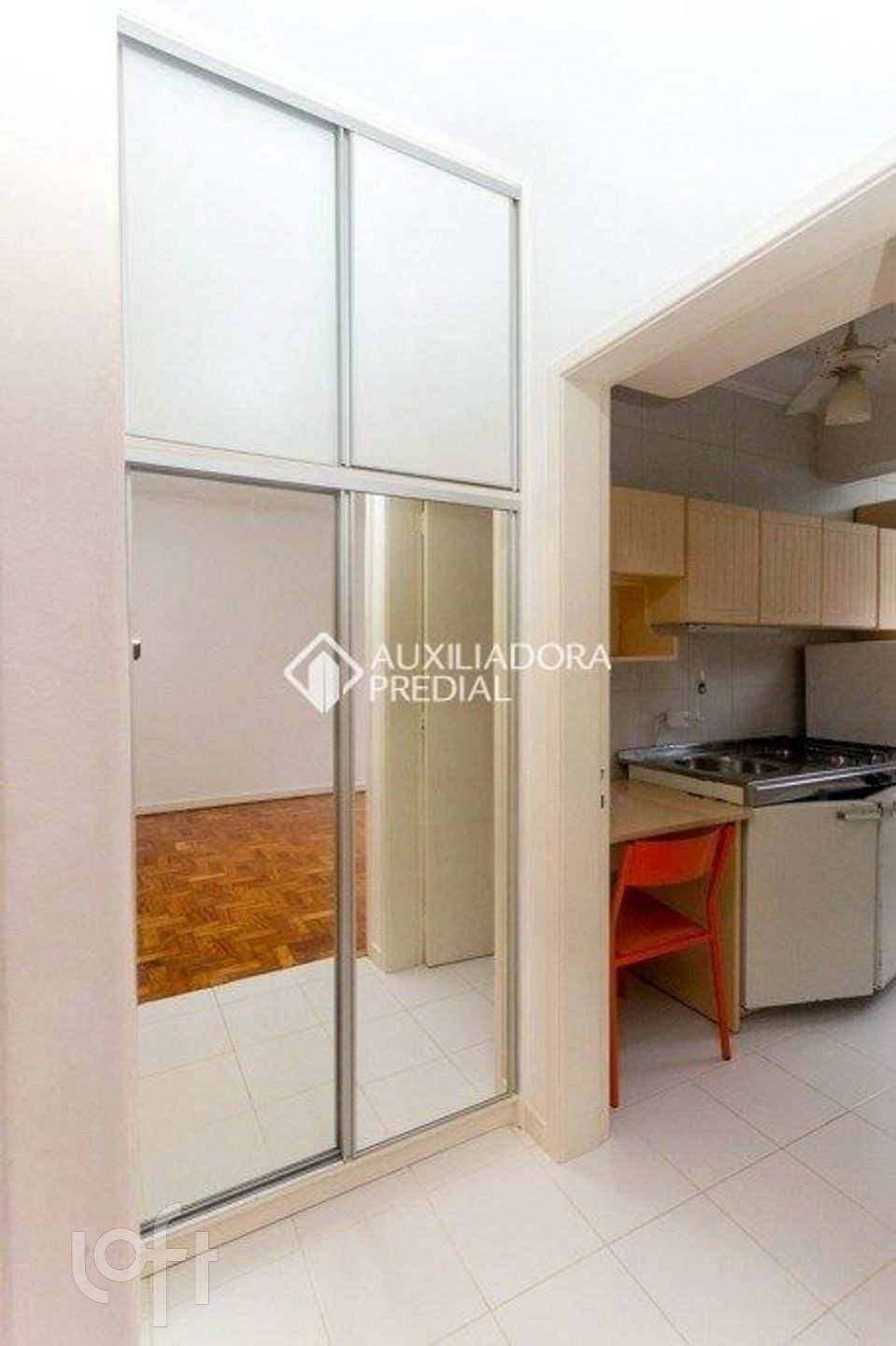 O imóvel conta com ambiente living/dormitório equipado com ar-condicionado split e ventilador de teto, além de cozinha e torneira elétrica. Possui ainda área de serviço e banheiro social com box e armários.