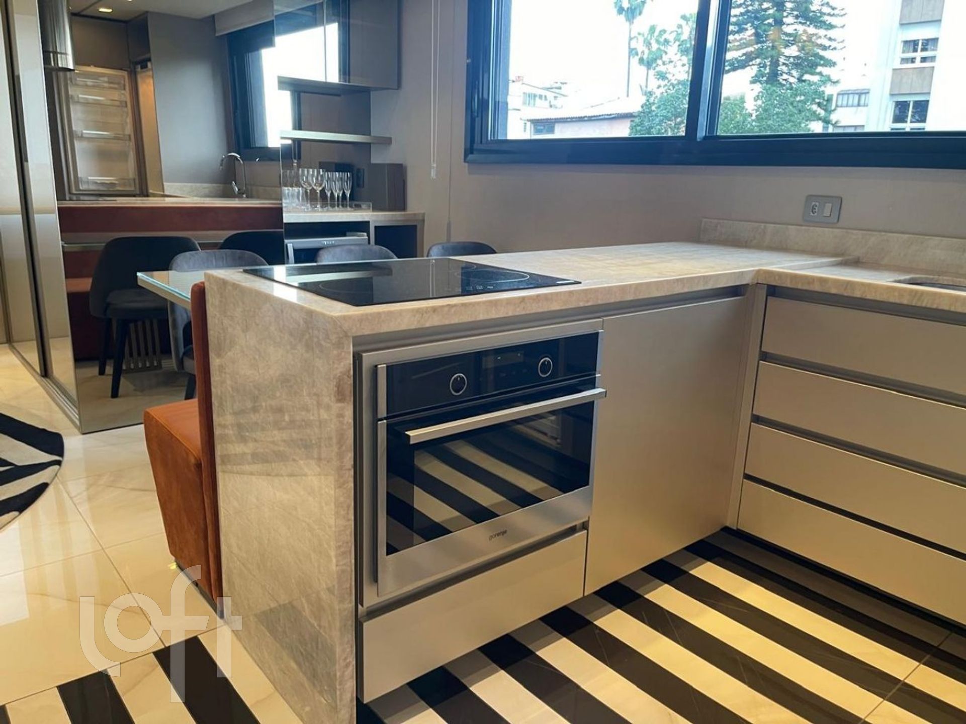 A marcenaria inteligente e multifuncional integra de forma harmoniosa todo o espaço, linha de eletrodomésticos de design, cuidadosamente selecionados para complementar a estética do projeto que estão discretamente embutidos.