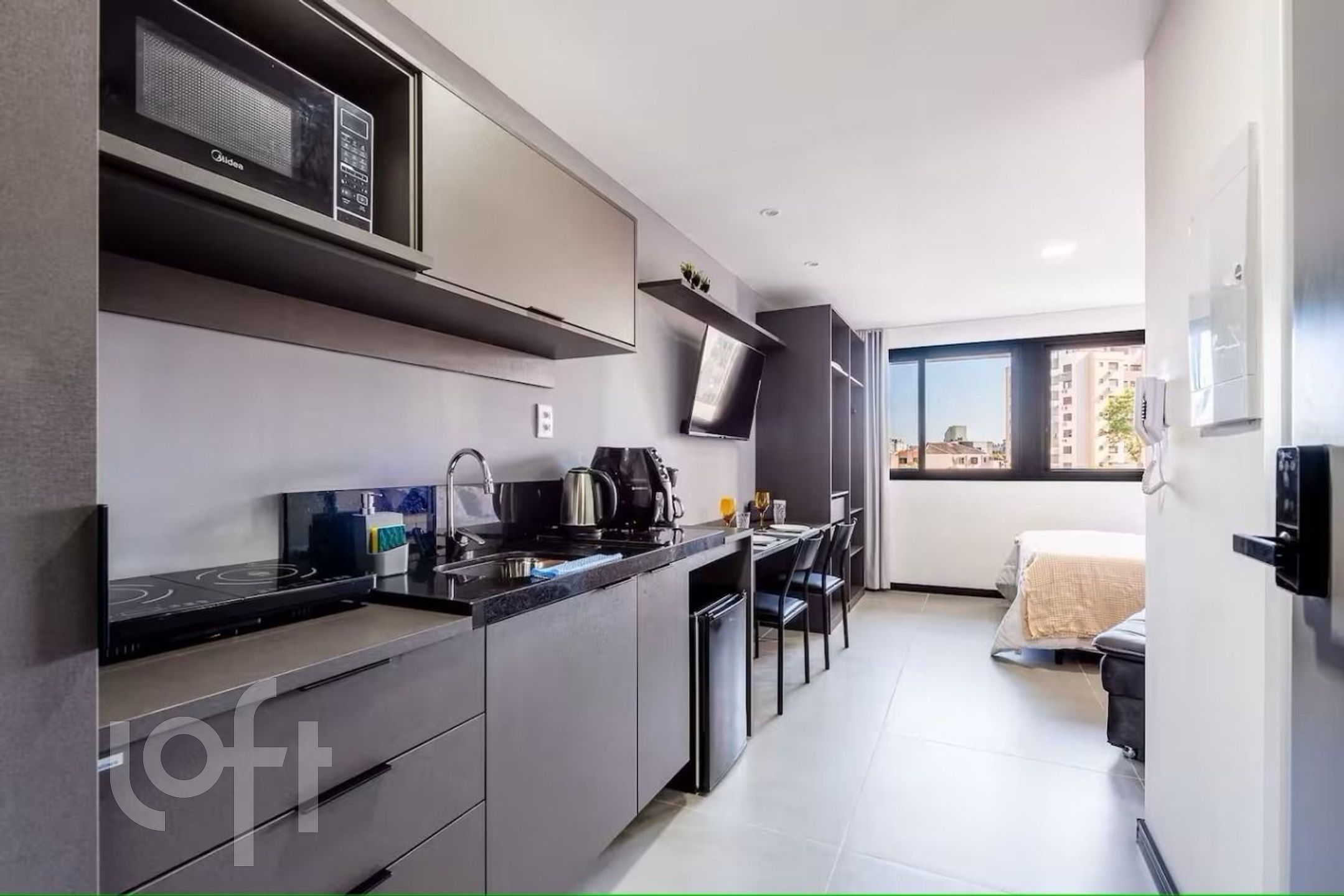 Loft com 28 mts, mobiliado, 4 andar, cama casal, sofá cama estilo Chaise de solteiro. Ar condicionado inverter quente e frio, TV 43 smart. Armários e prateleiras para roupas. Mesa de apoio e duas cadeiras.