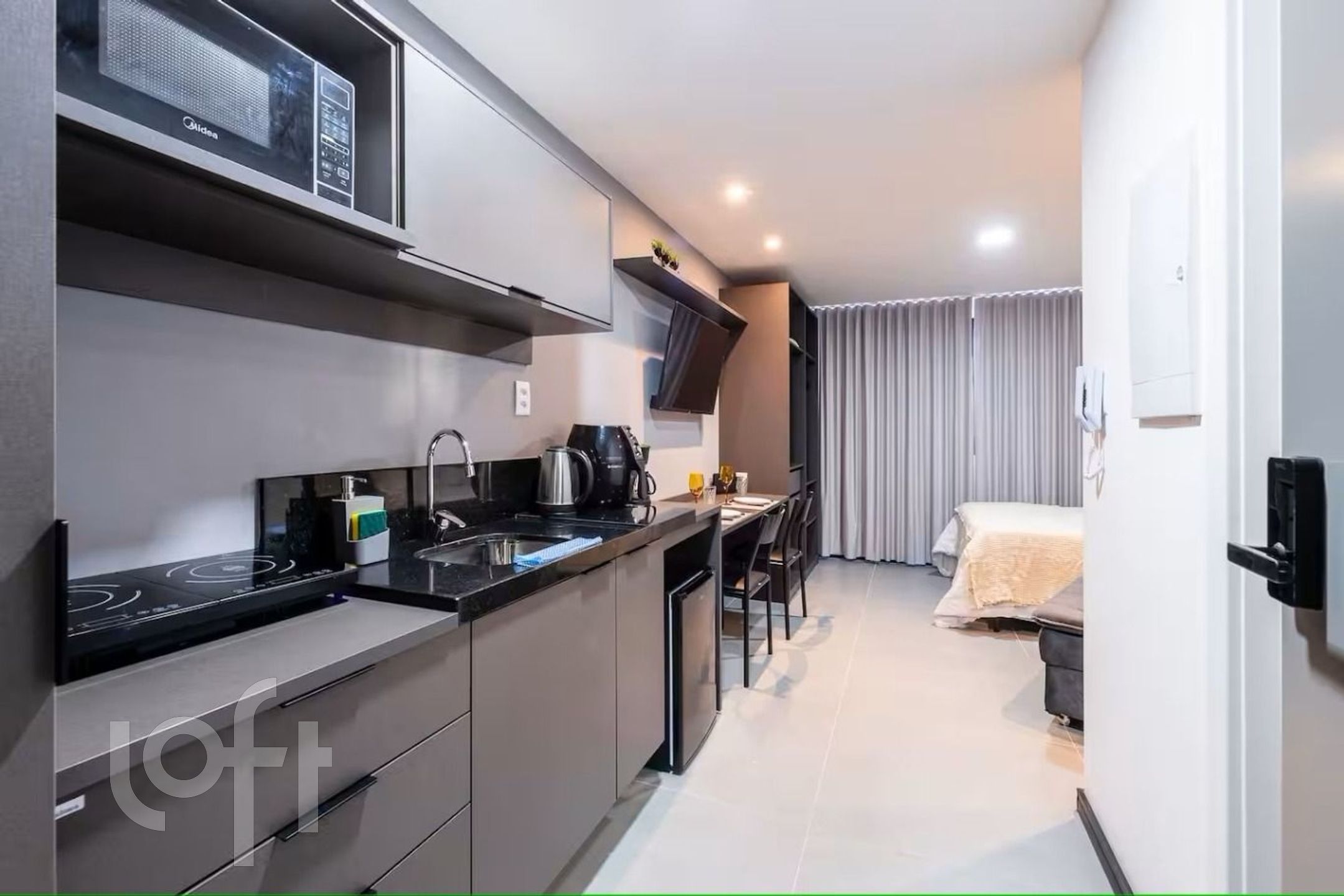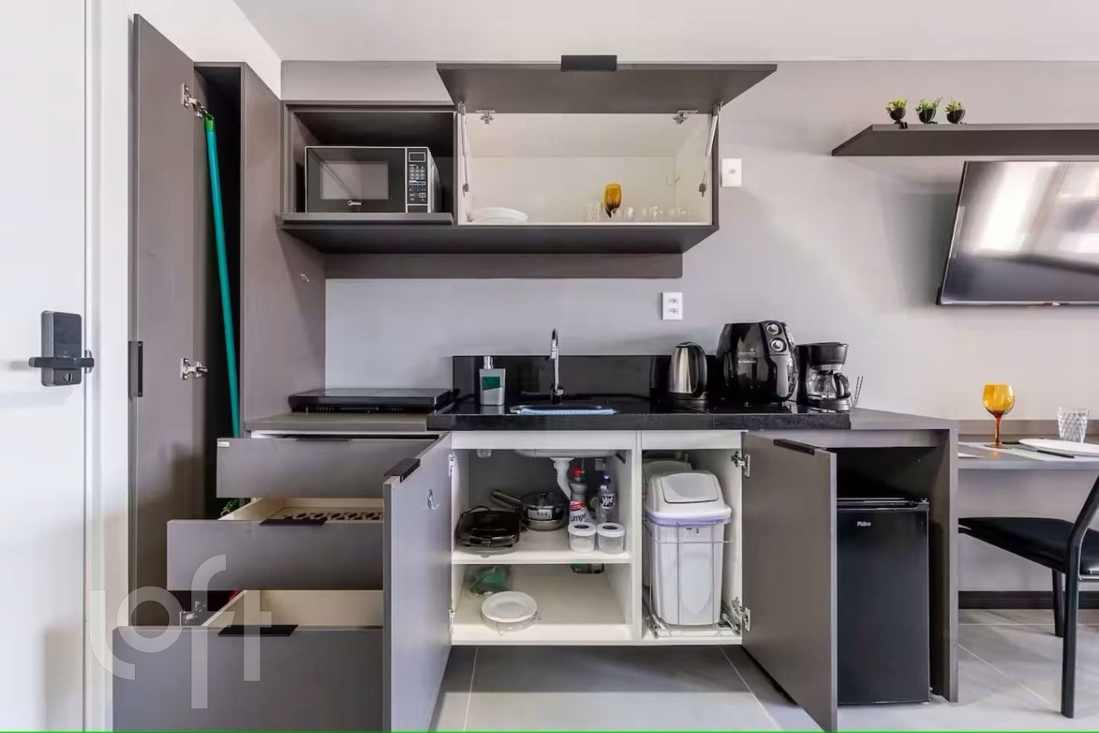 Cozinha montada com armários e bancada de granito São Gabriel, com frigobar, microondas, air fryer, cooktop de indução, chaleira elétrica, torradeira, ferro de passar, além de pratos , talheres, algumas panelas de indução e utensílios variados.