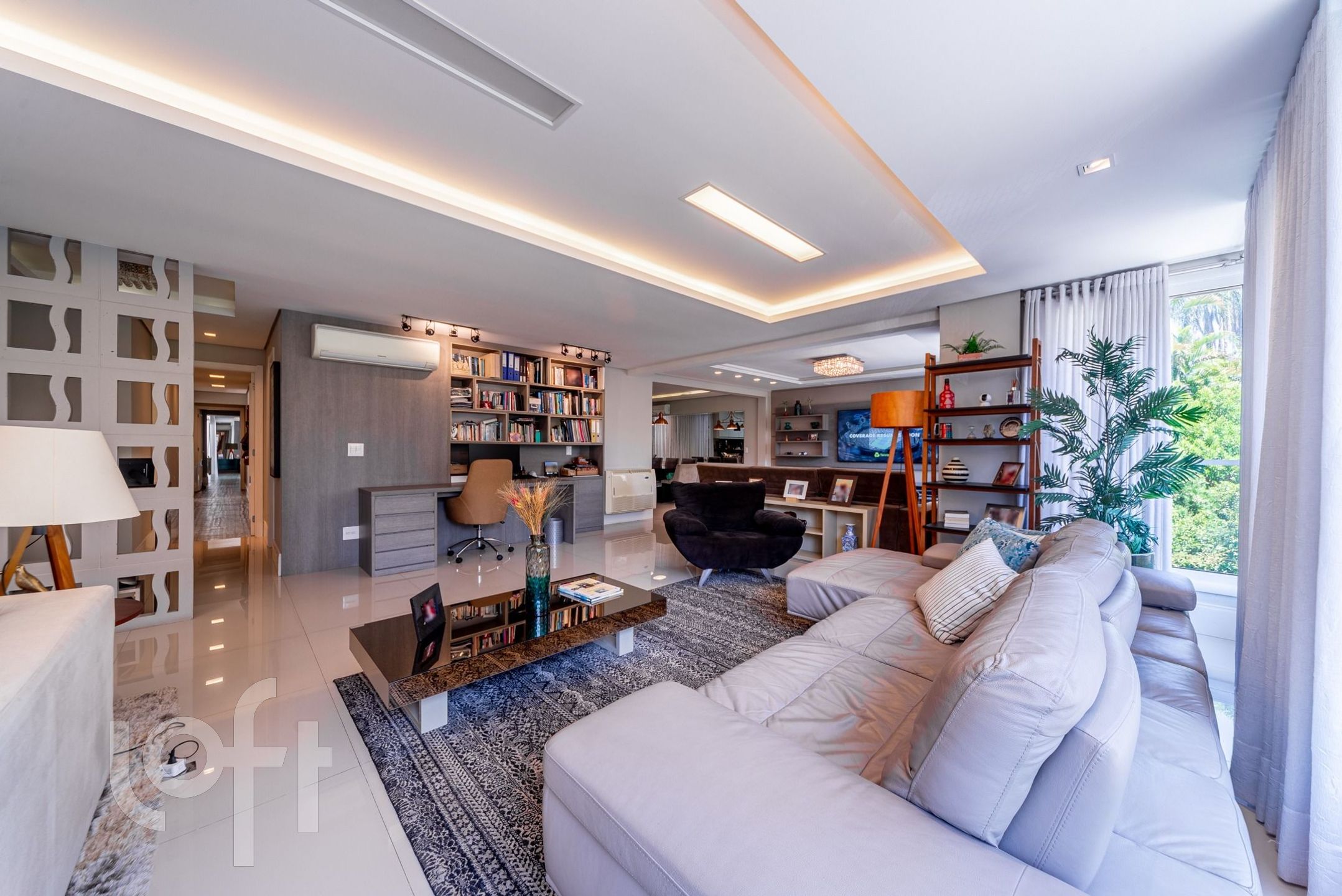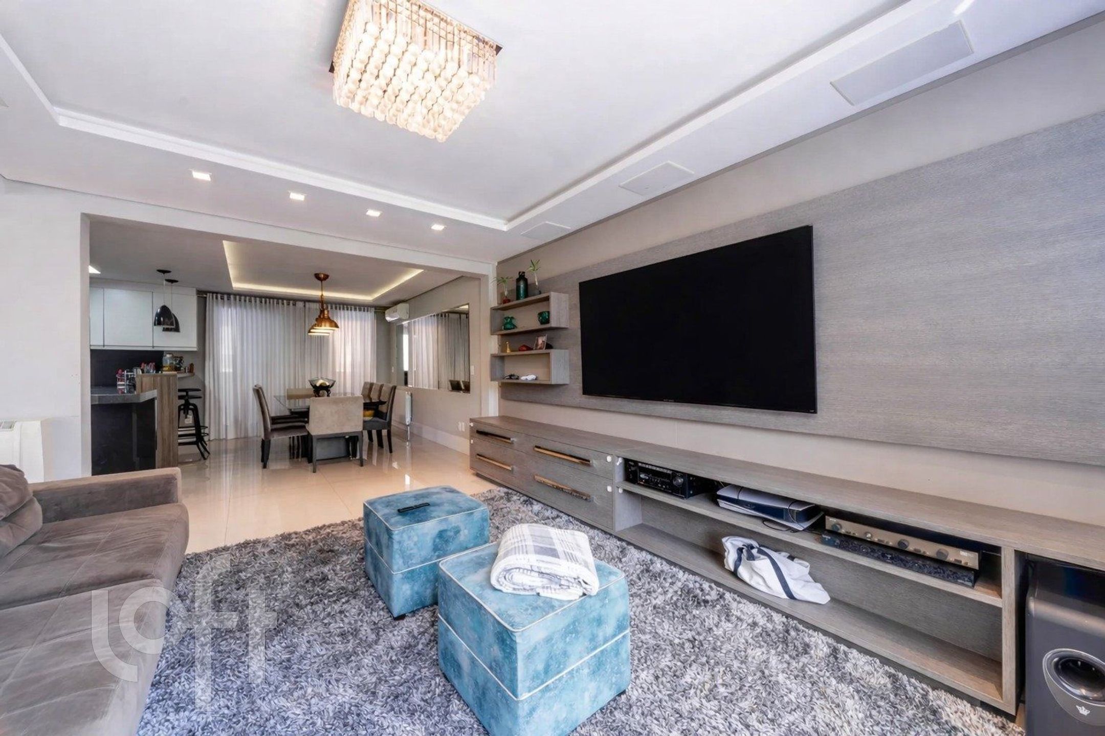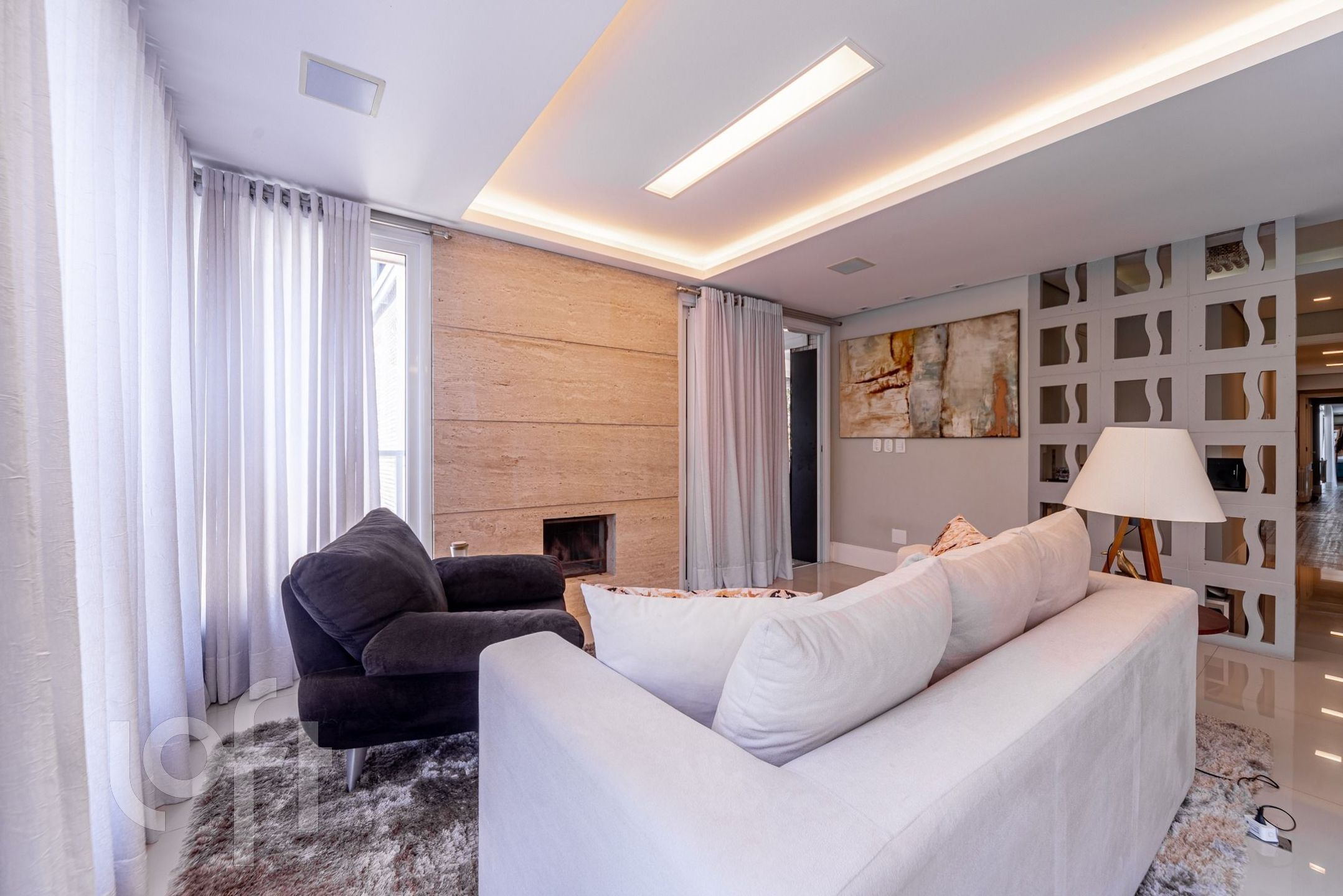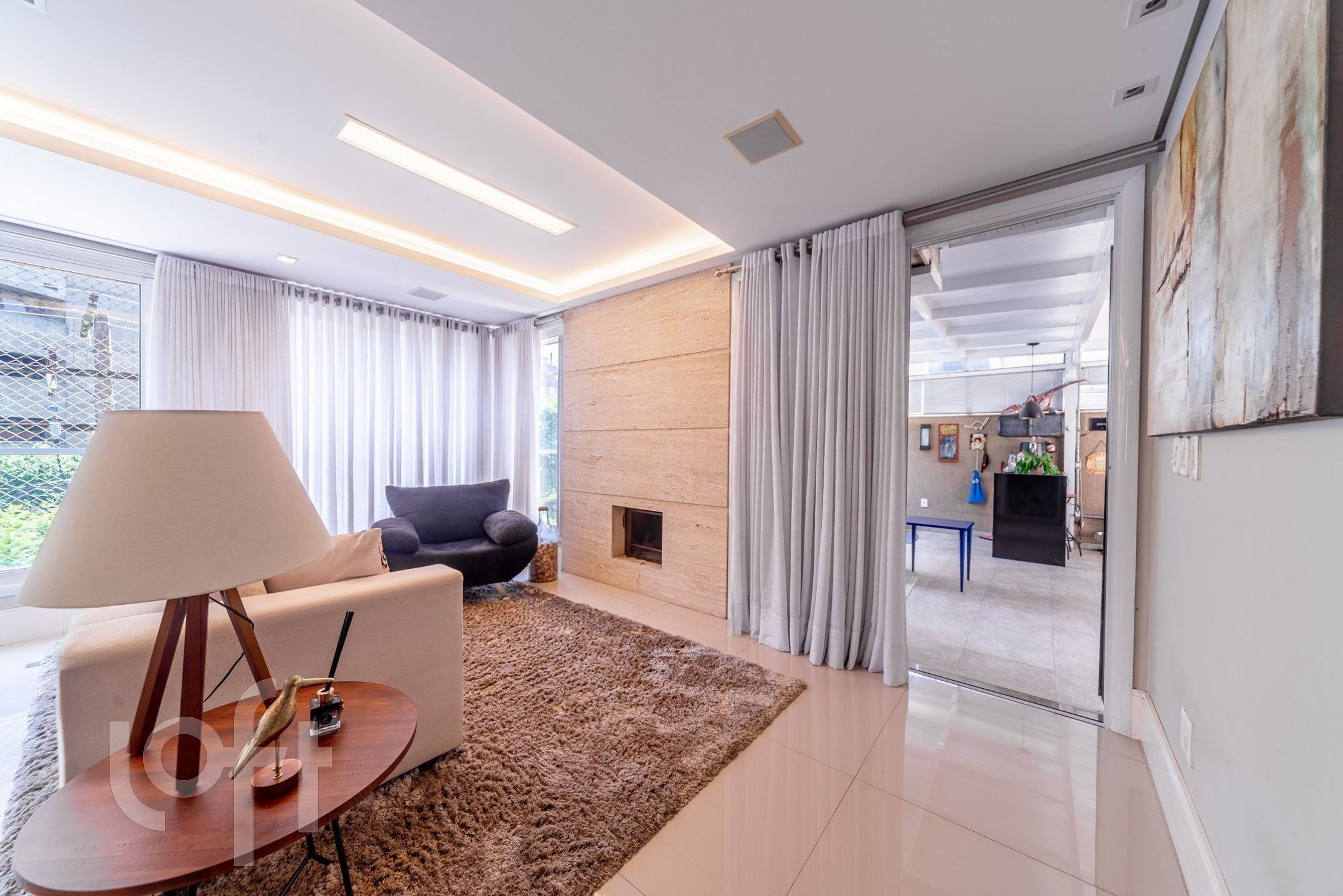 Living para 3 ambientes com lareira, churrasqueira, lavabo, cozinha, área de serviço e área externa com piscina.