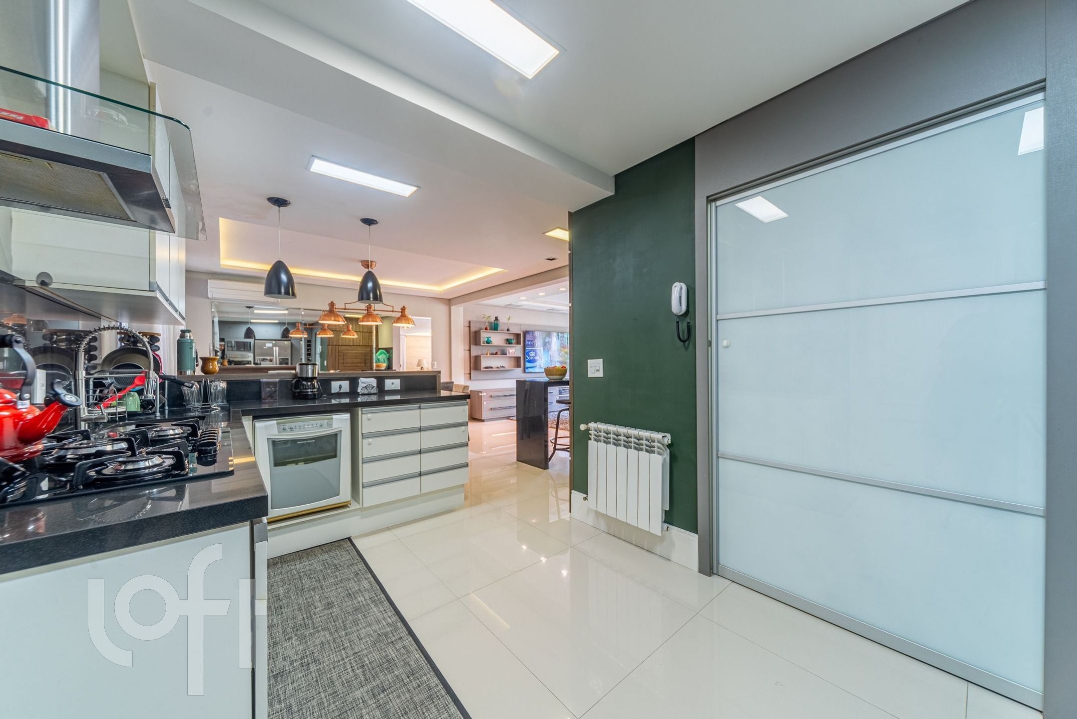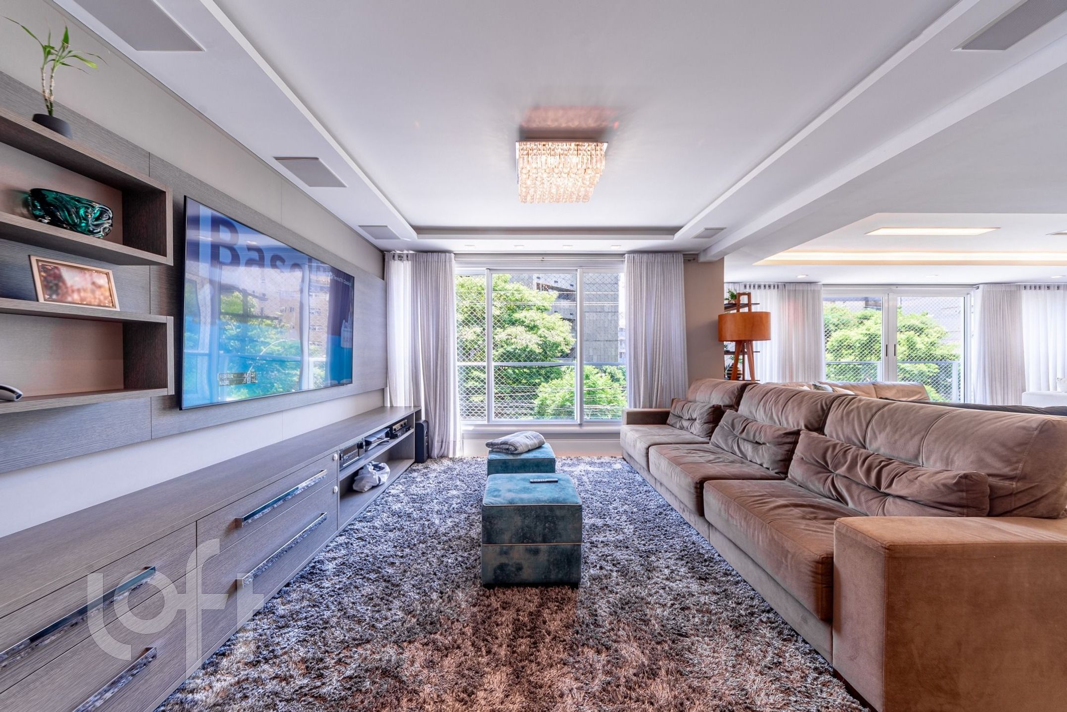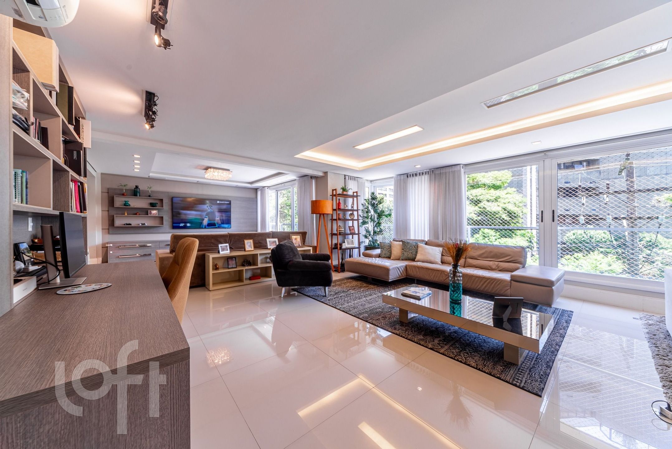 Living para 3 ambientes com lareira, churrasqueira, lavabo, cozinha, área de serviço e área externa com piscina.