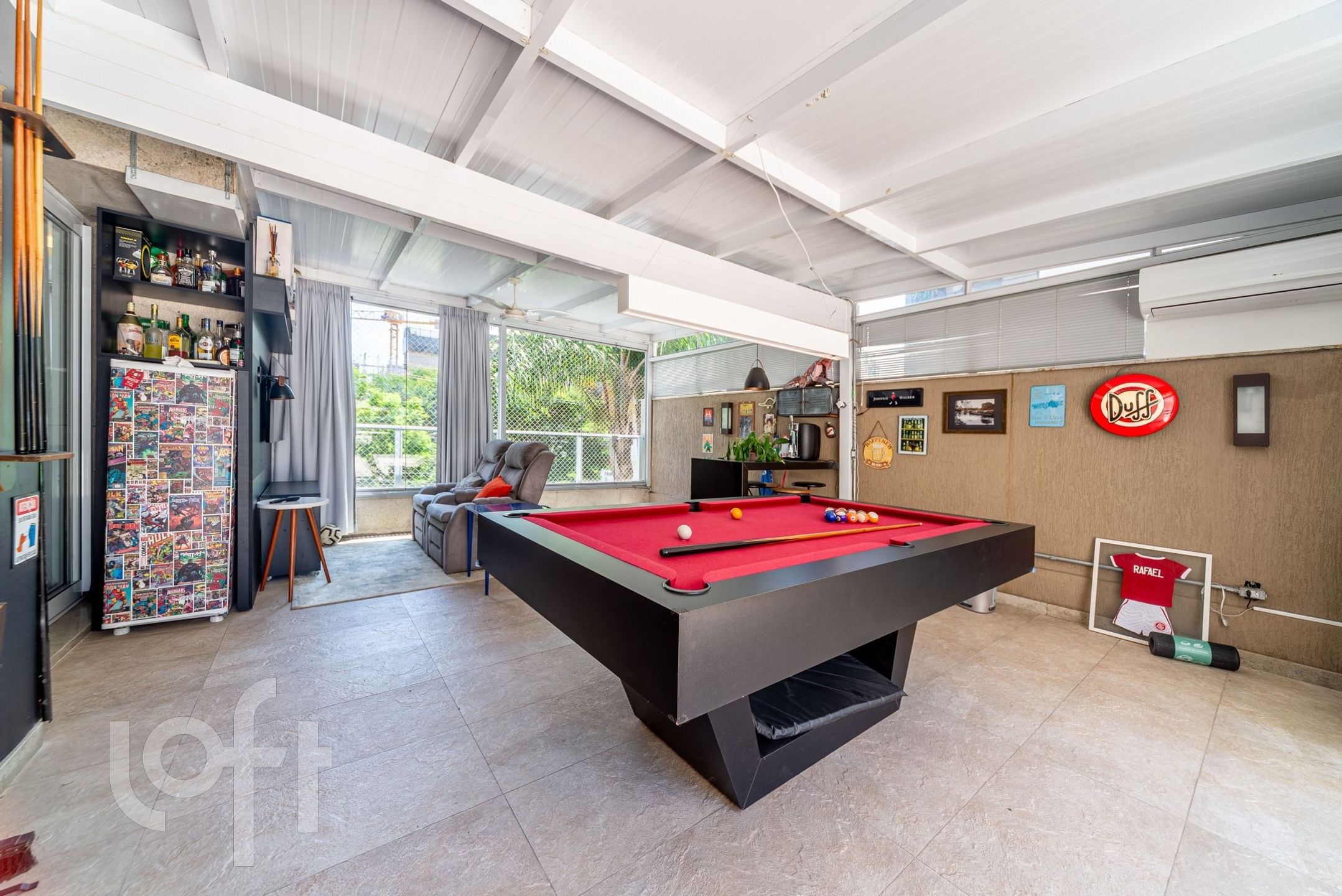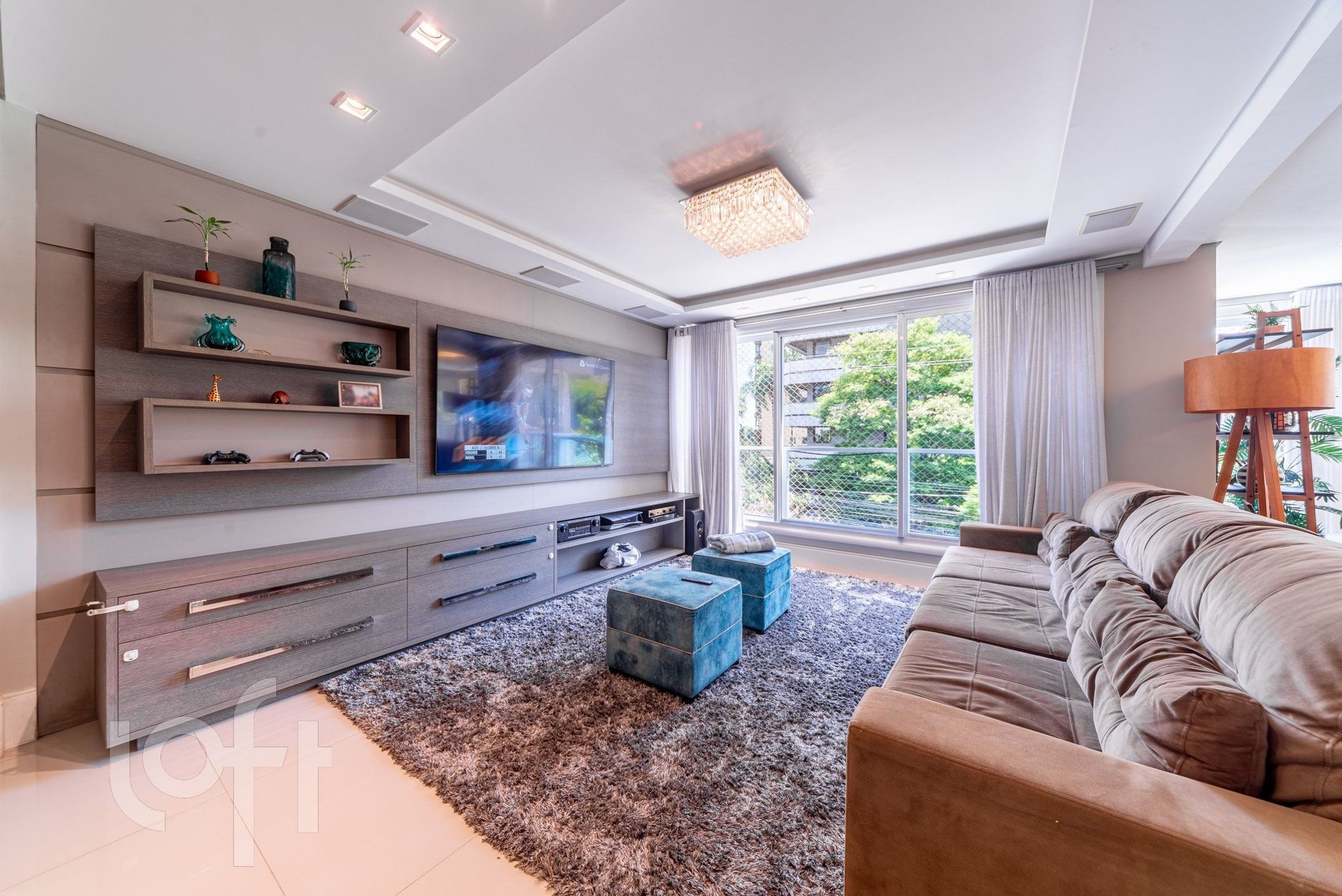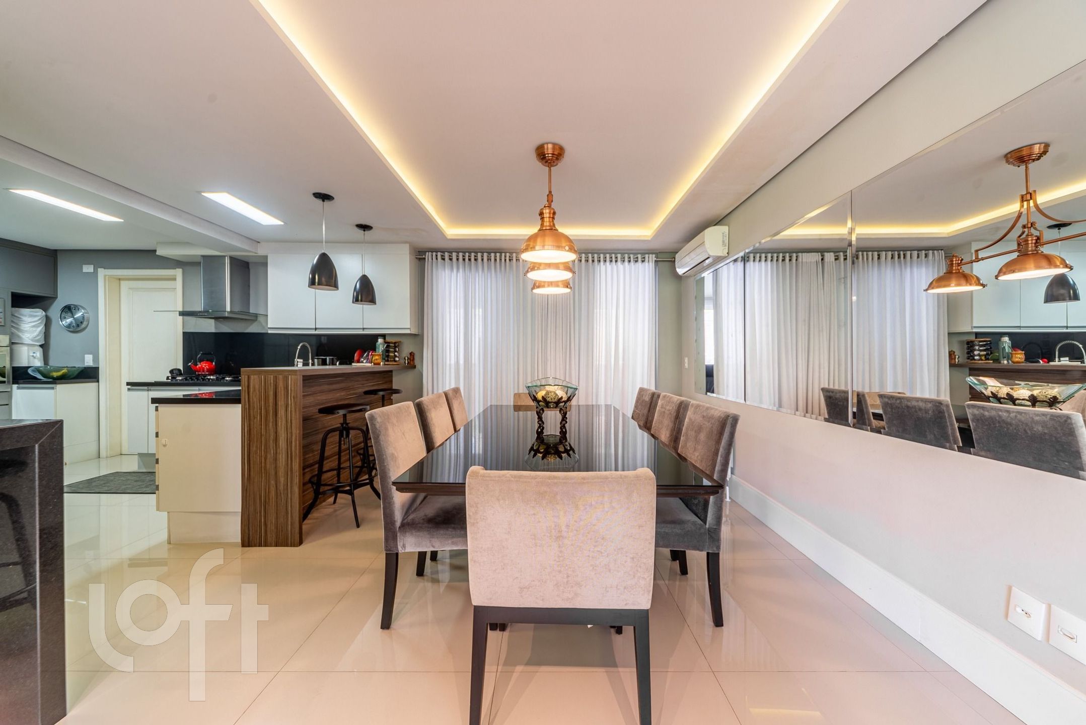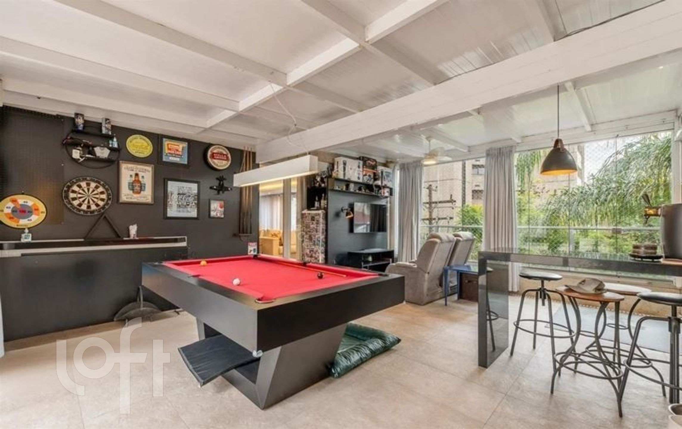 Living para 3 ambientes com lareira, churrasqueira, lavabo, cozinha, área de serviço e área externa com piscina.