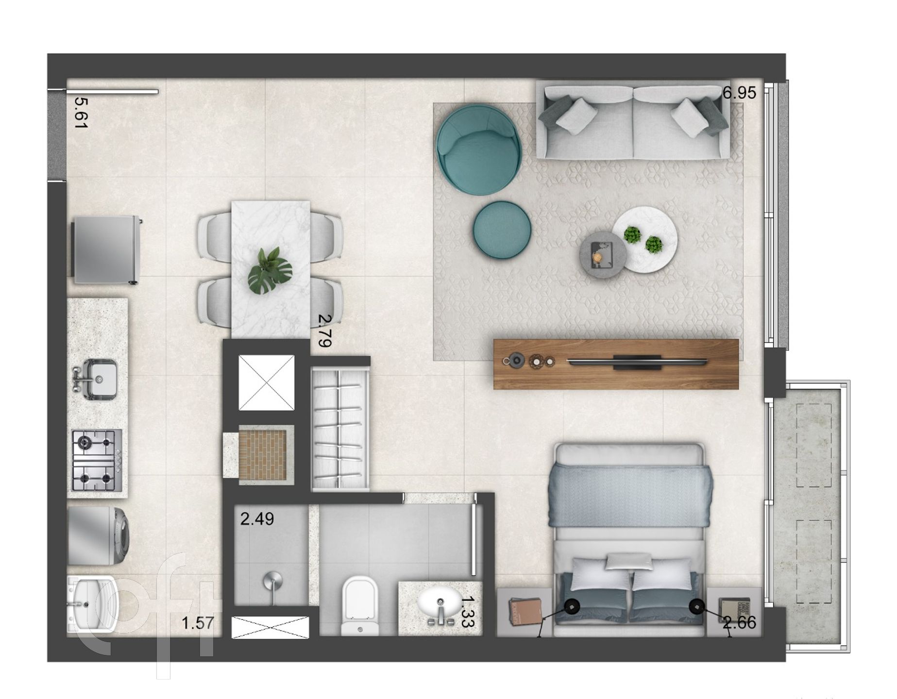 Seus studios possuem áreas privativas de 28m² e 29m², apartamentos de 1 e 2 dormitórios de 45m² a 70m².