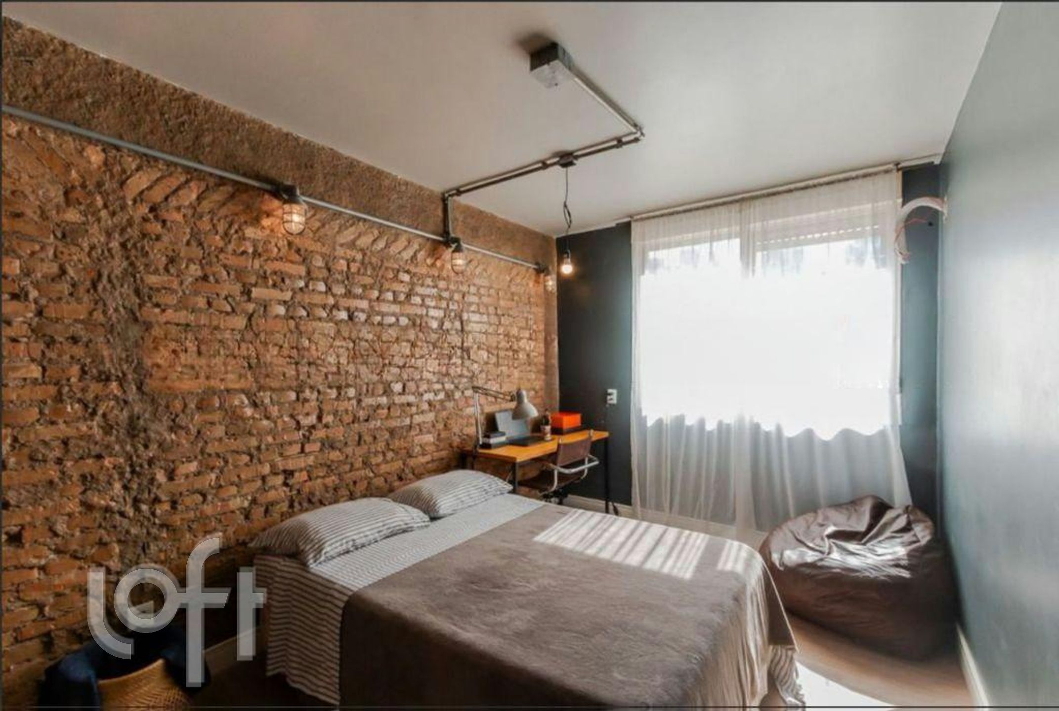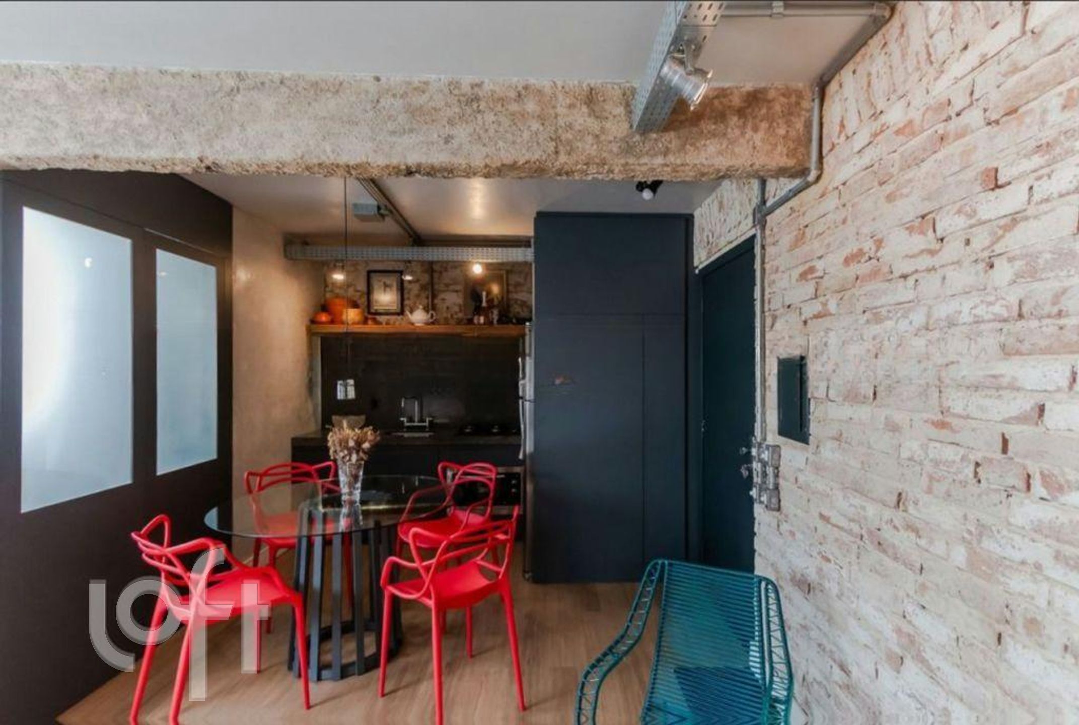 A sala de estar e jantar integradas oferece um ambiente acolhedor e moderno, com paredes em tijolo aparente, iluminação em trilhos aparentes e piso amadeirado, criando uma atmosfera urbana e sofisticada. A integração favorece a circulação e a entrada de luz natural, tornando o espaço funcional e agradável para receber.