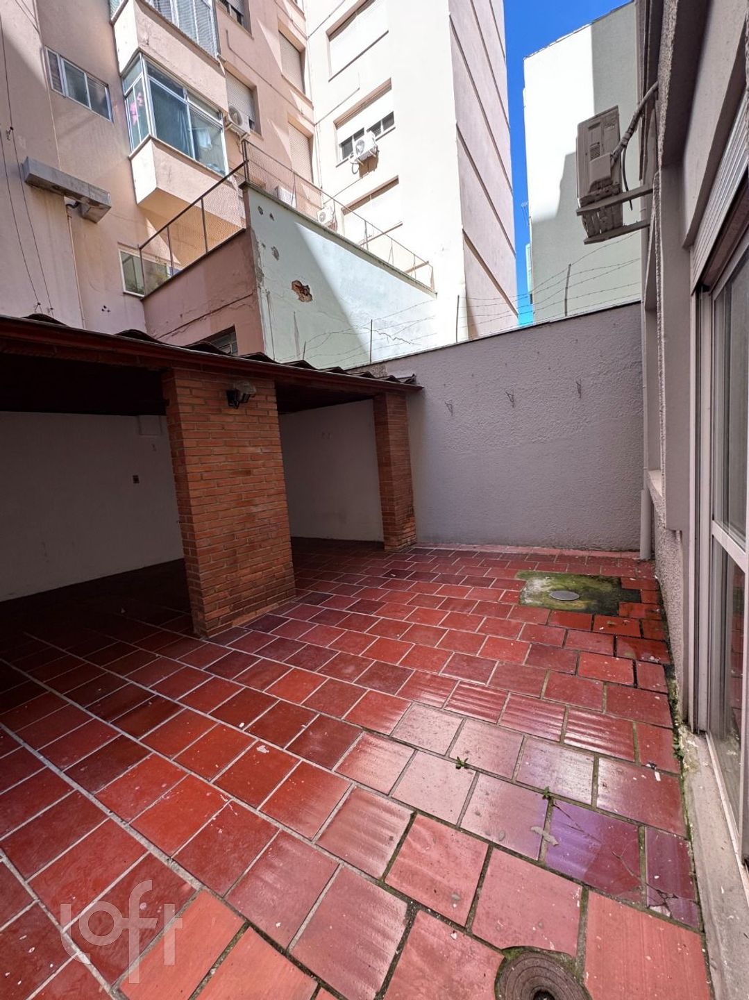 Apartamento térreo com 2 quartos sendo uma suite, cozinha com lavanderia externa, sala, banheiro social, quarto de fundos com saida para ampla área externa sendo esse ambiente com parte aberta e fechada.