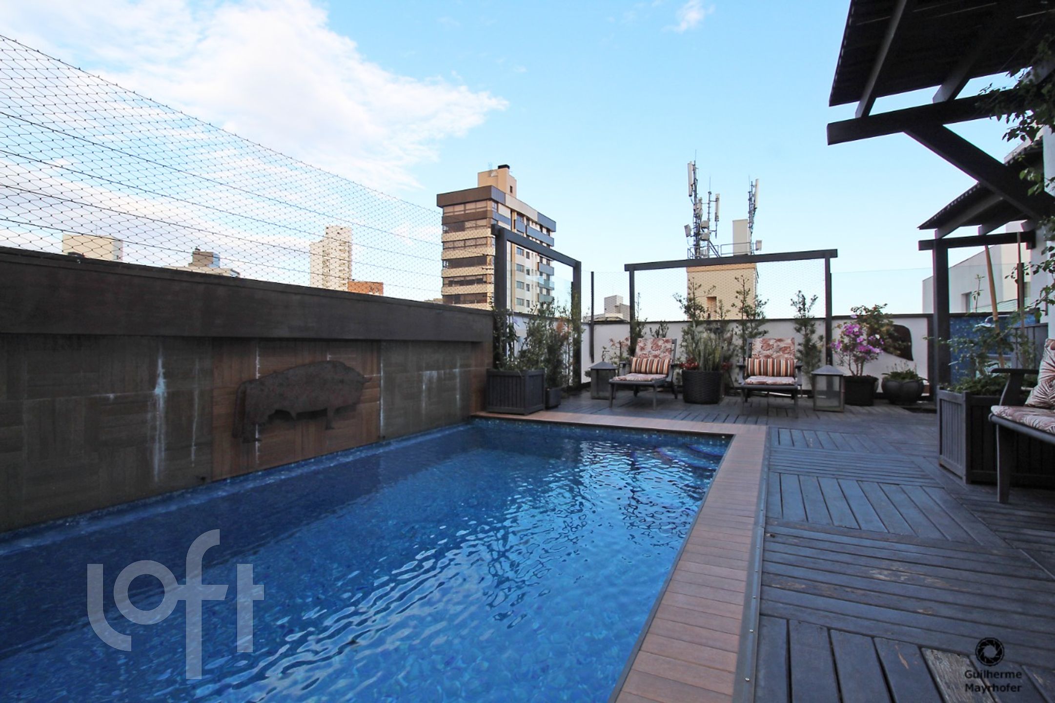 2º andar conta com living para 3 ambientes, espaço gourmet com 140 m², churrasqueira com grelha, lareira, banheiro, área externa com jardim, deck de madeira, pérgolas de madeira, ducha externa, piscina revestida de pastilhas, aquecida e ampla lavanderia.