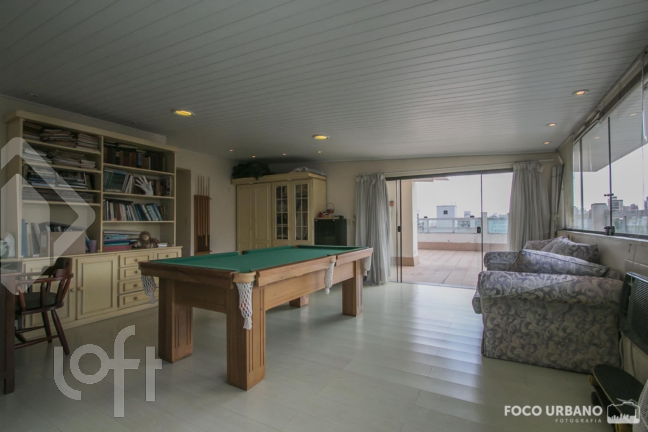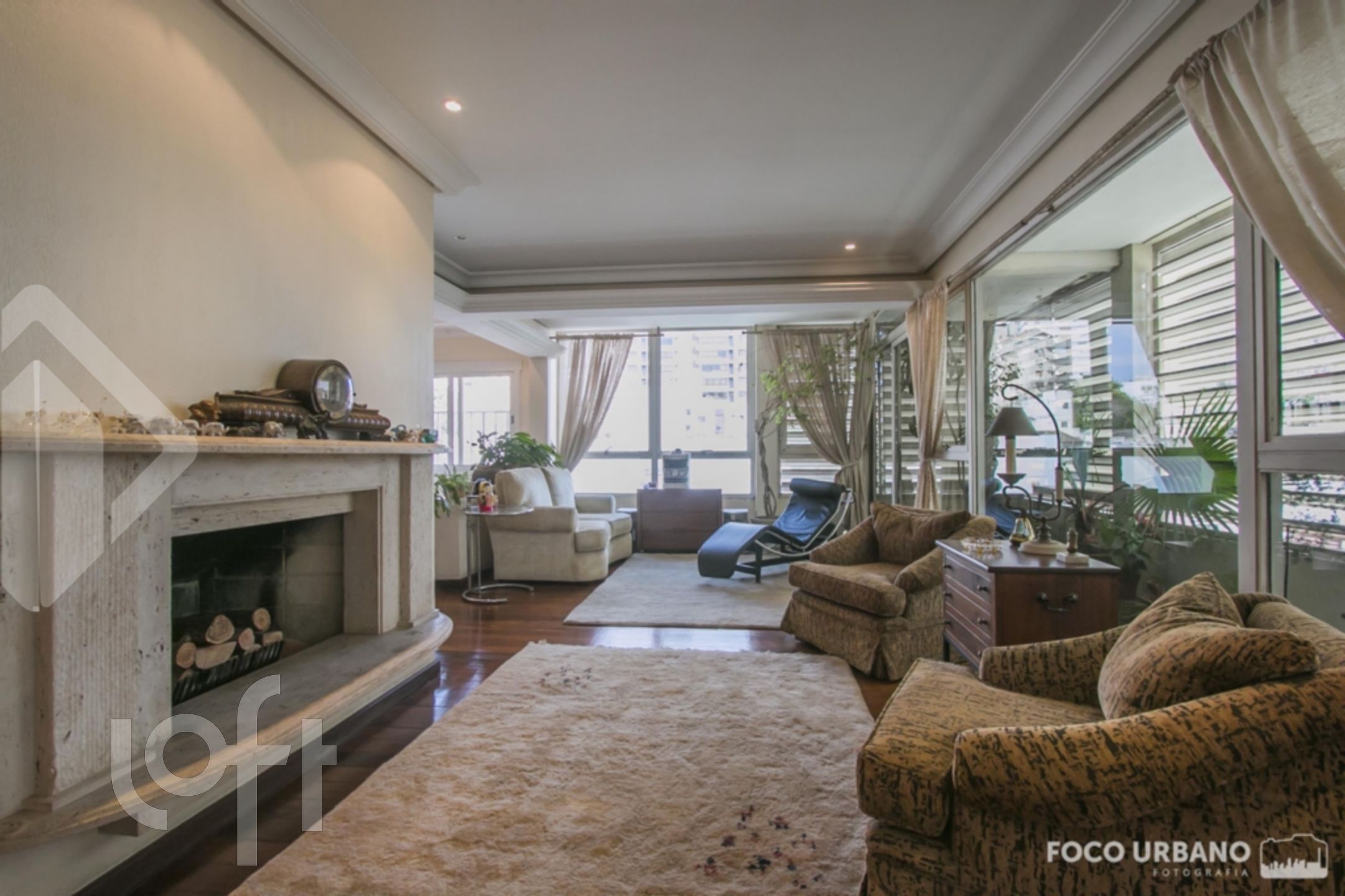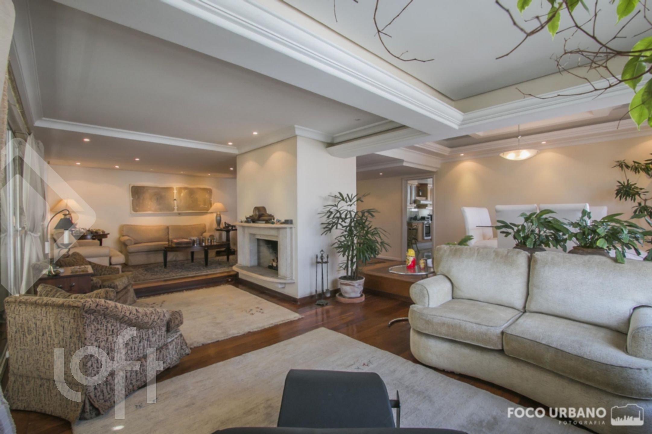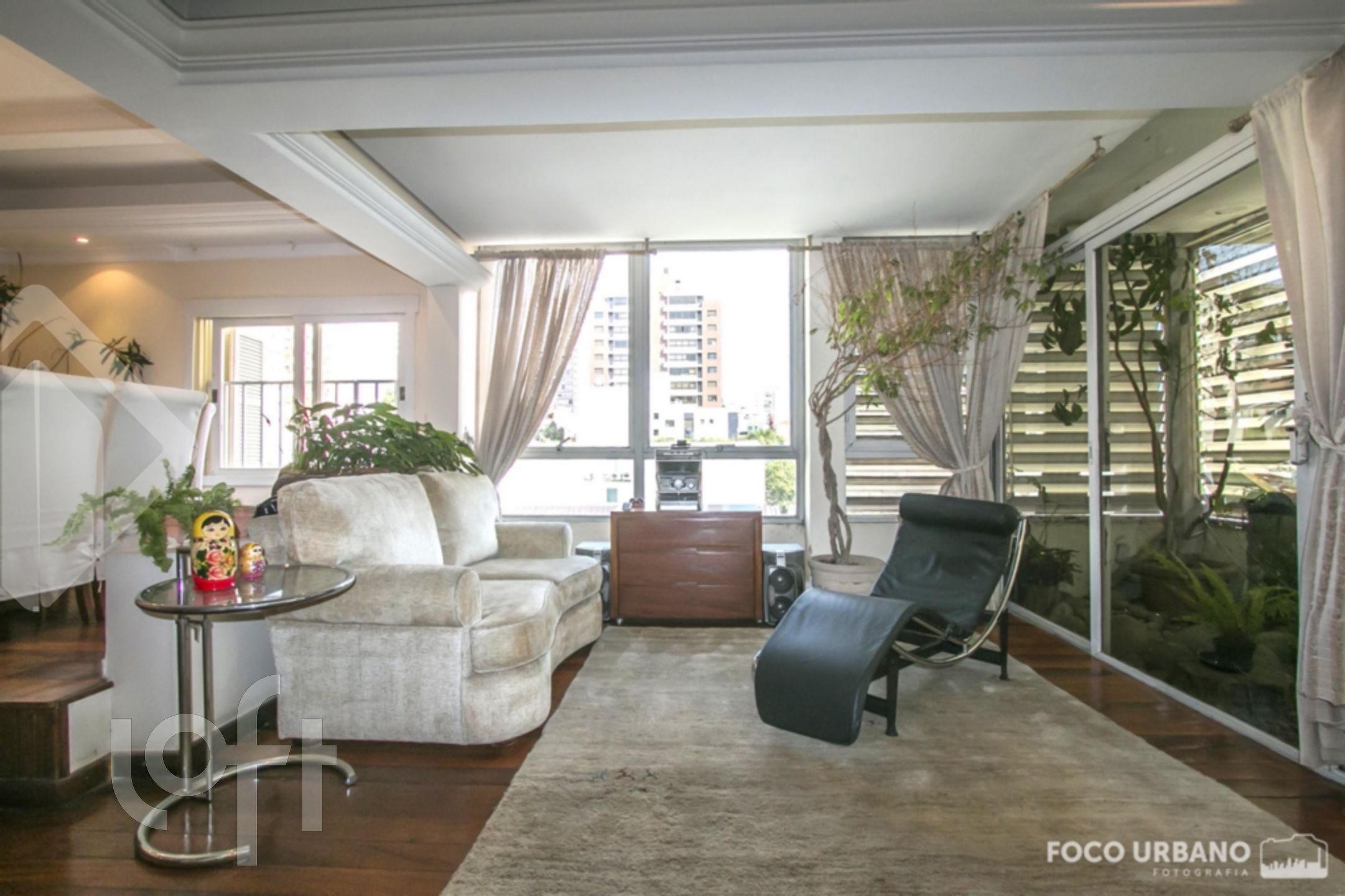 Cobertura com 4 quartos (dormitórios), sendo 4 suítes, área de 529m², 2 vagas de garagem, living amplo em desnível para diversos ambientes, um deles com lareira, jardim de inverno, closet e hidromassagem em uma das suítes, copa cozinha, área de serviço, dependência de empregada, banheiro auxiliar. Parte superior: sala ampla com lareira, churrasqueira, salão de jogos, banho social, amplo terraço, vista.