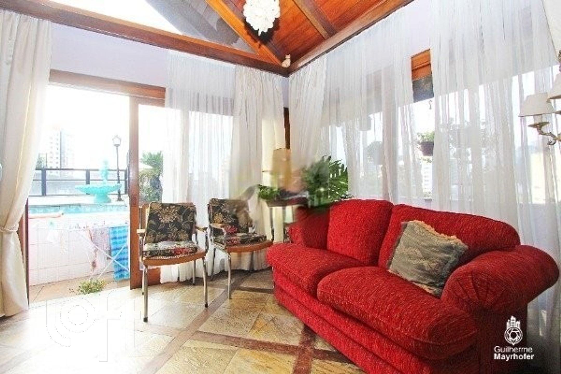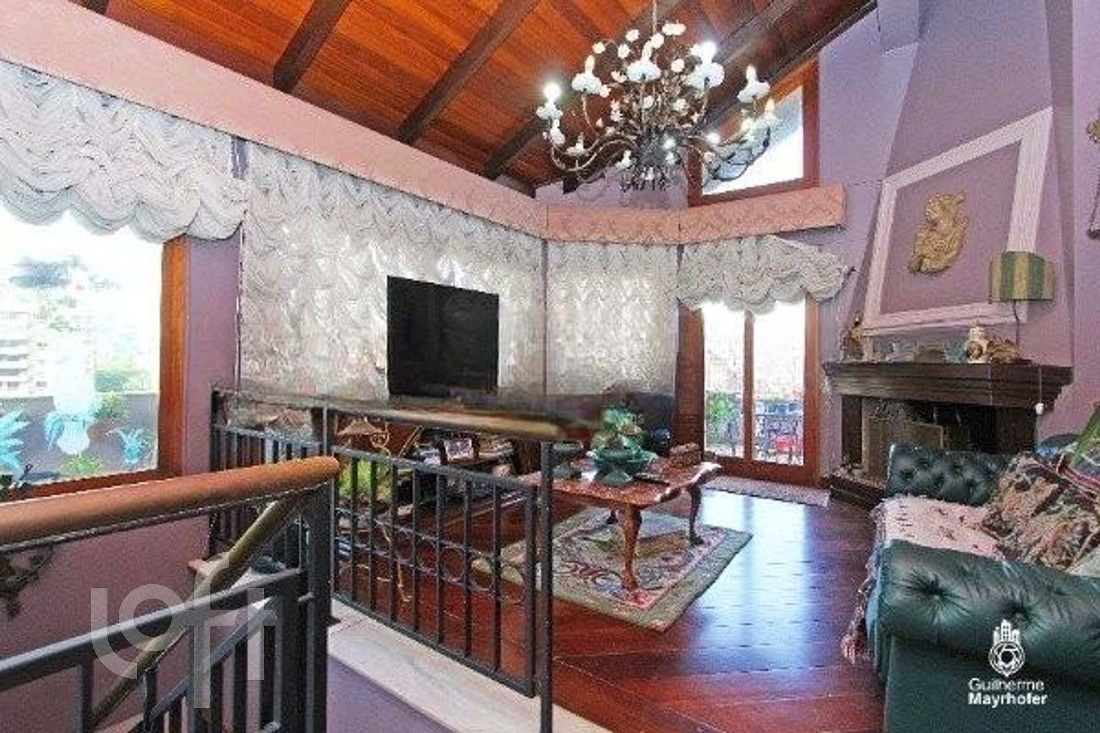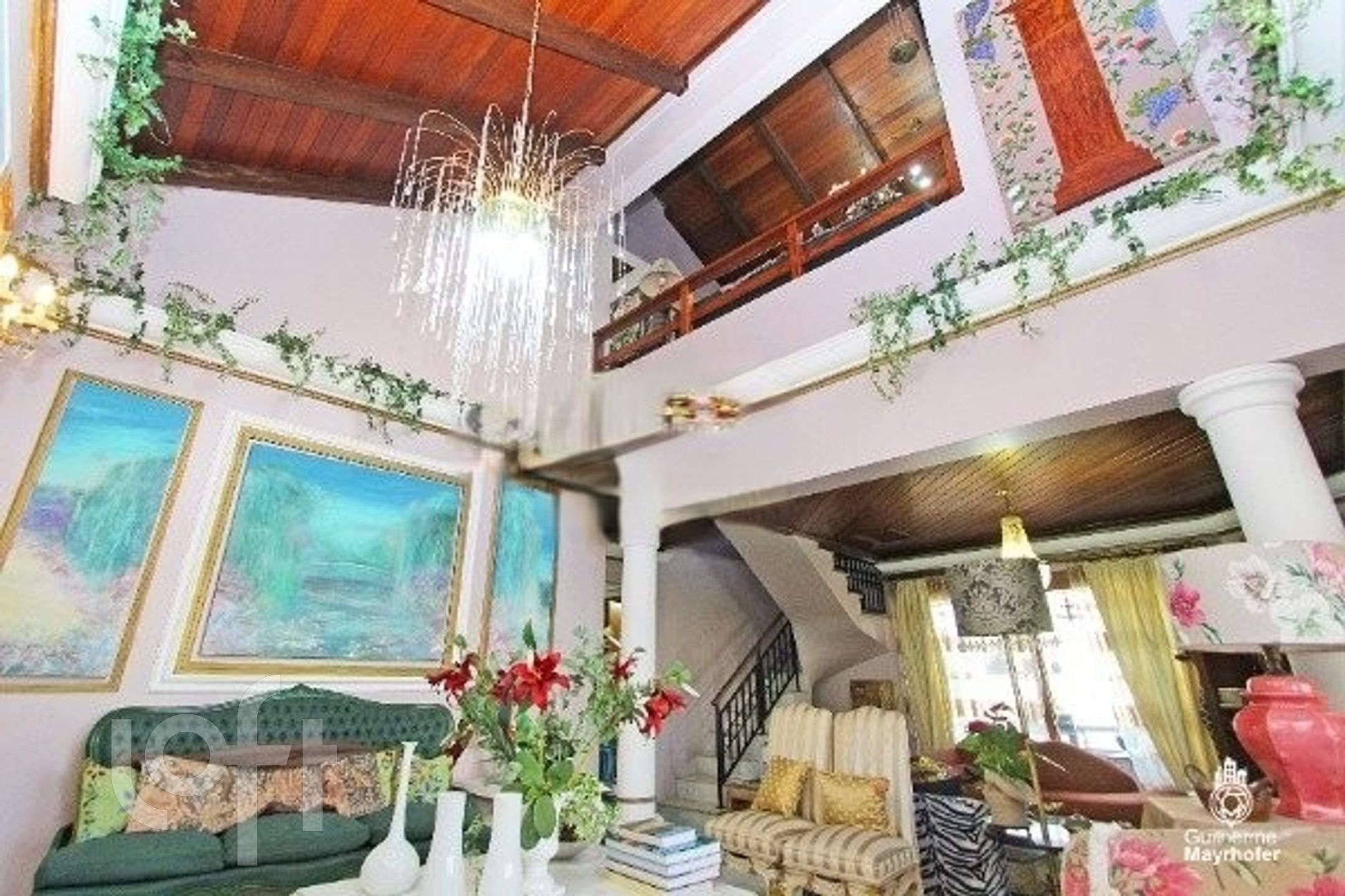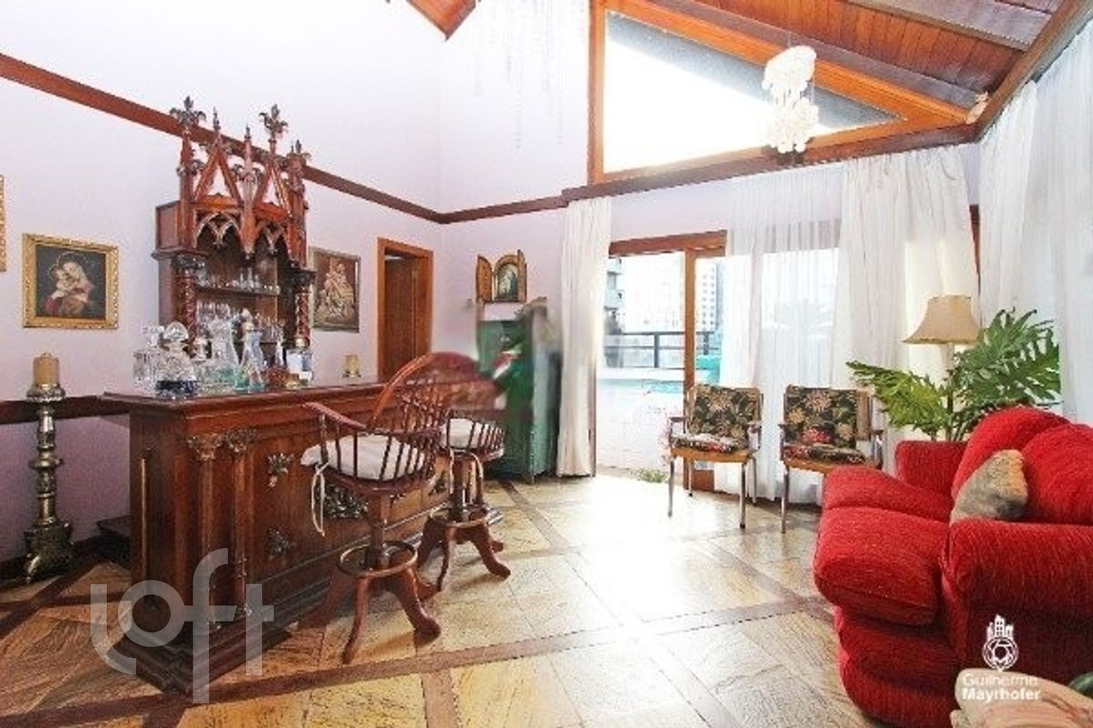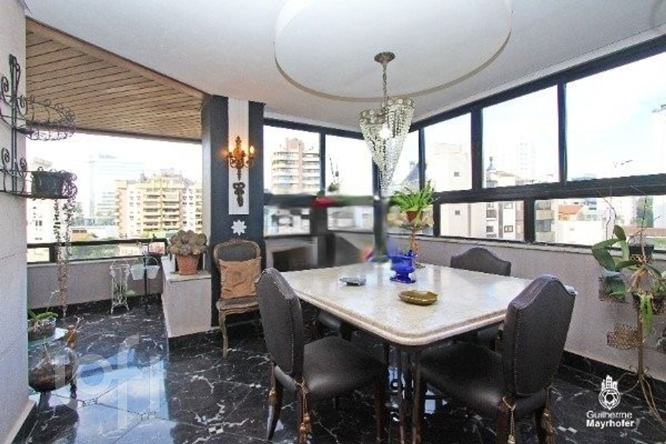 Esta cobertura ocupa um andar completo, oferecendo 550m² úteis (650m² no total) e possui 4 vagas de estacionamento escrituradas (incluindo 2 vagas duplas, totalizando espaço para 6 carros, não contabilizados na área total). O ambiente interno é dividido em um living em desnível para 3 espaços distintos, sala de jantar, sacada para área de estar íntimo, e conta com 3 lareiras.