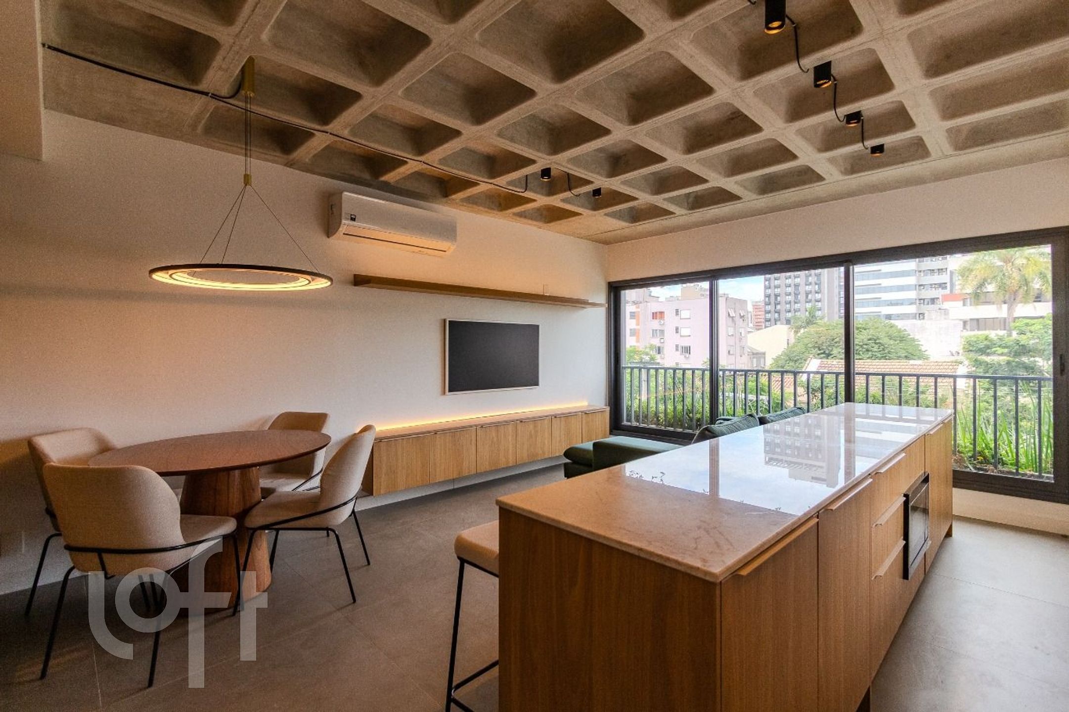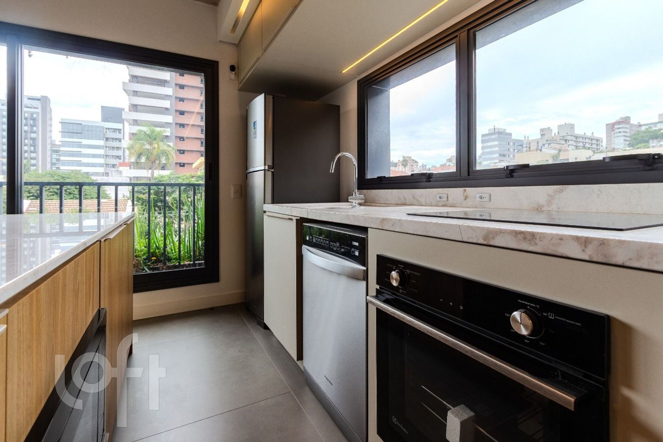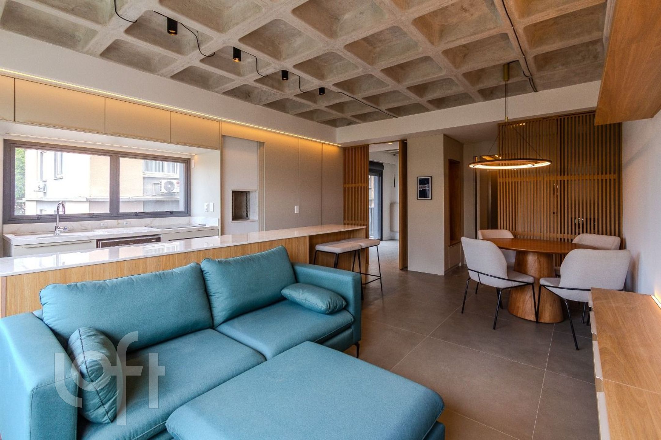 O amplo living integrado à cozinha valoriza a iluminação natural, potencializada pelas esquadrias piso-teto em alumínio, que conferem elegância e amplitude aos ambientes. Um espaço pensado para quem aprecia morar com estilo, sem abrir mão da praticidade.