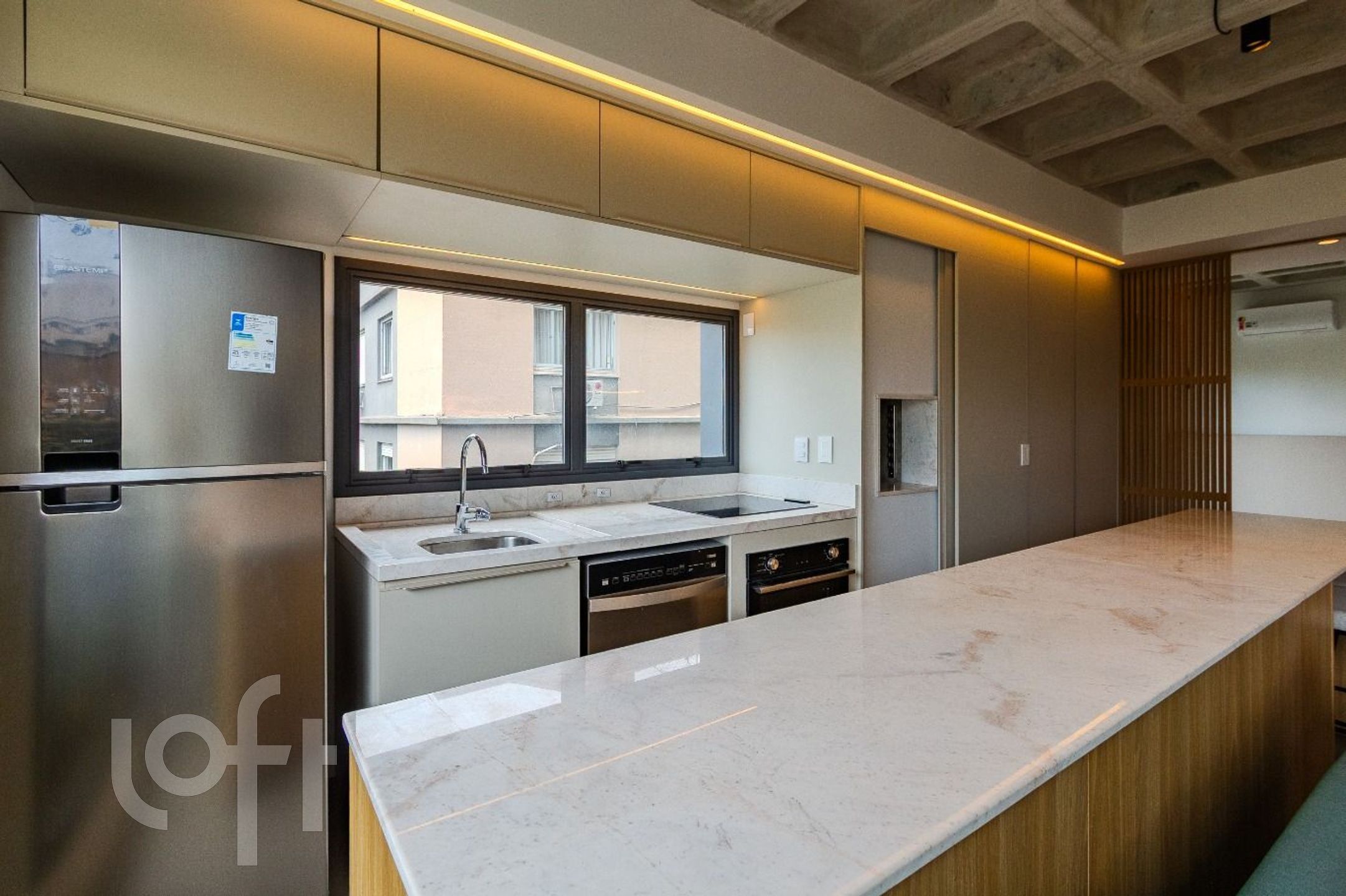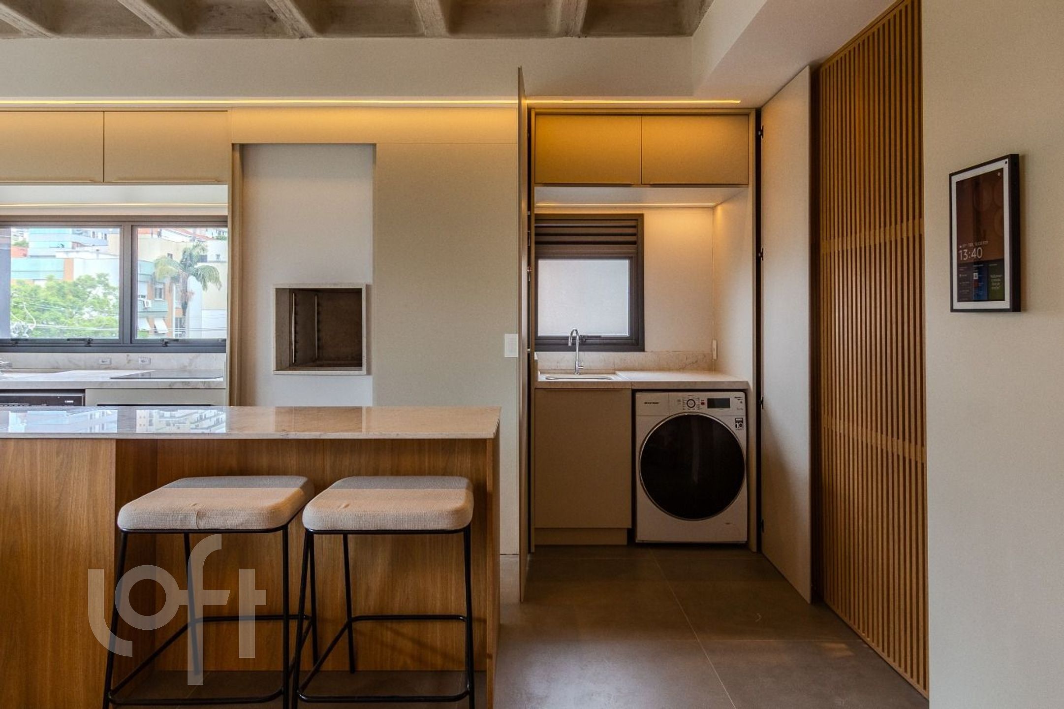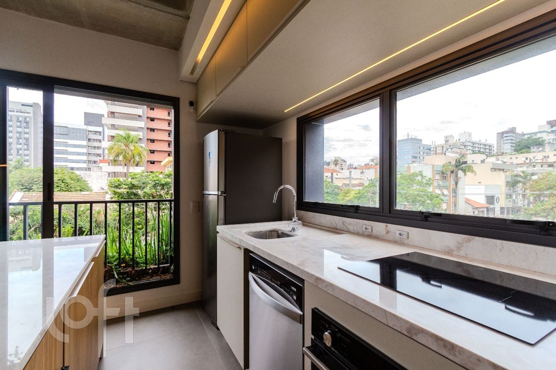 O amplo living integrado à cozinha valoriza a iluminação natural, potencializada pelas esquadrias piso-teto em alumínio, que conferem elegância e amplitude aos ambientes. Um espaço pensado para quem aprecia morar com estilo, sem abrir mão da praticidade.