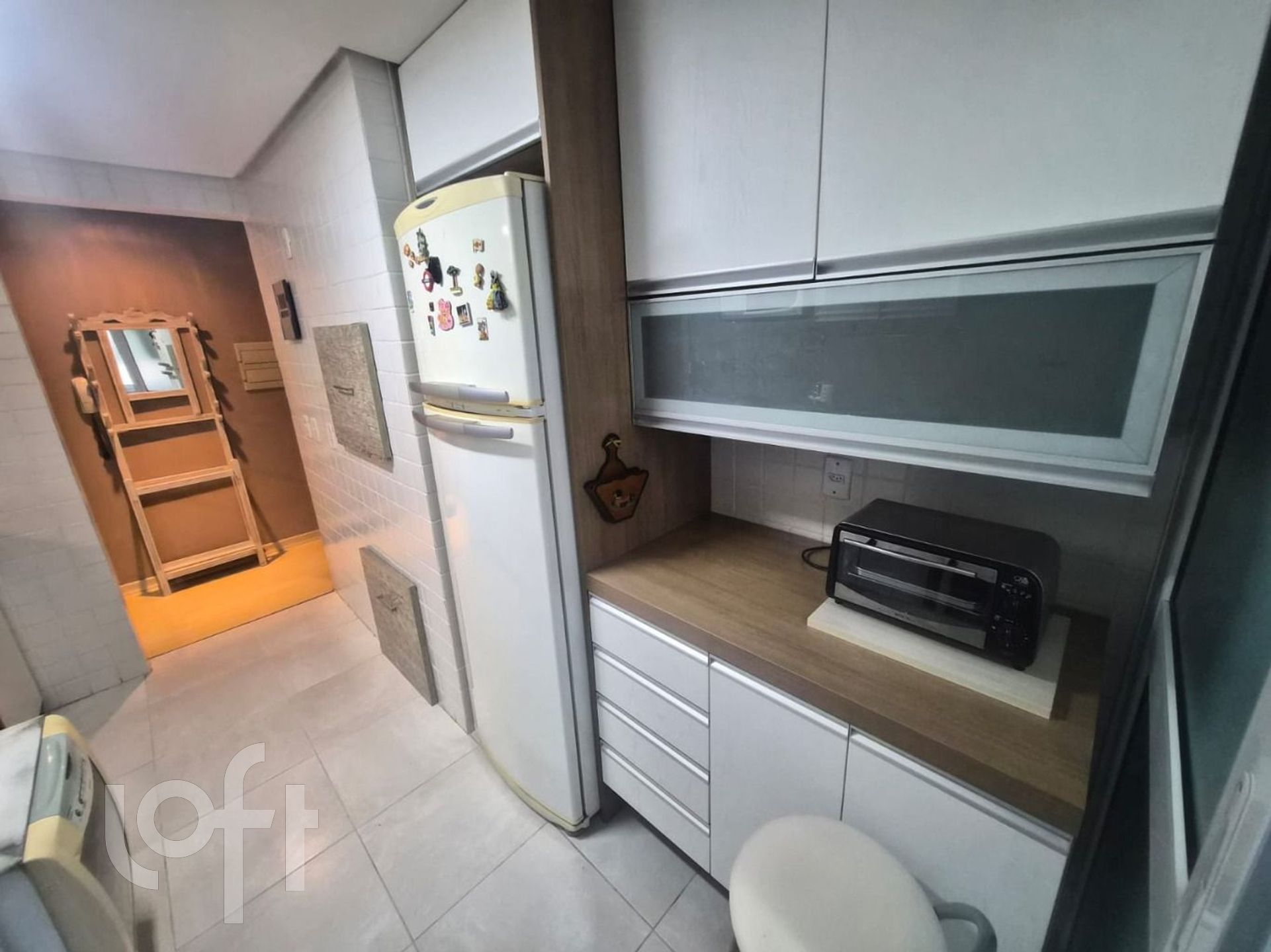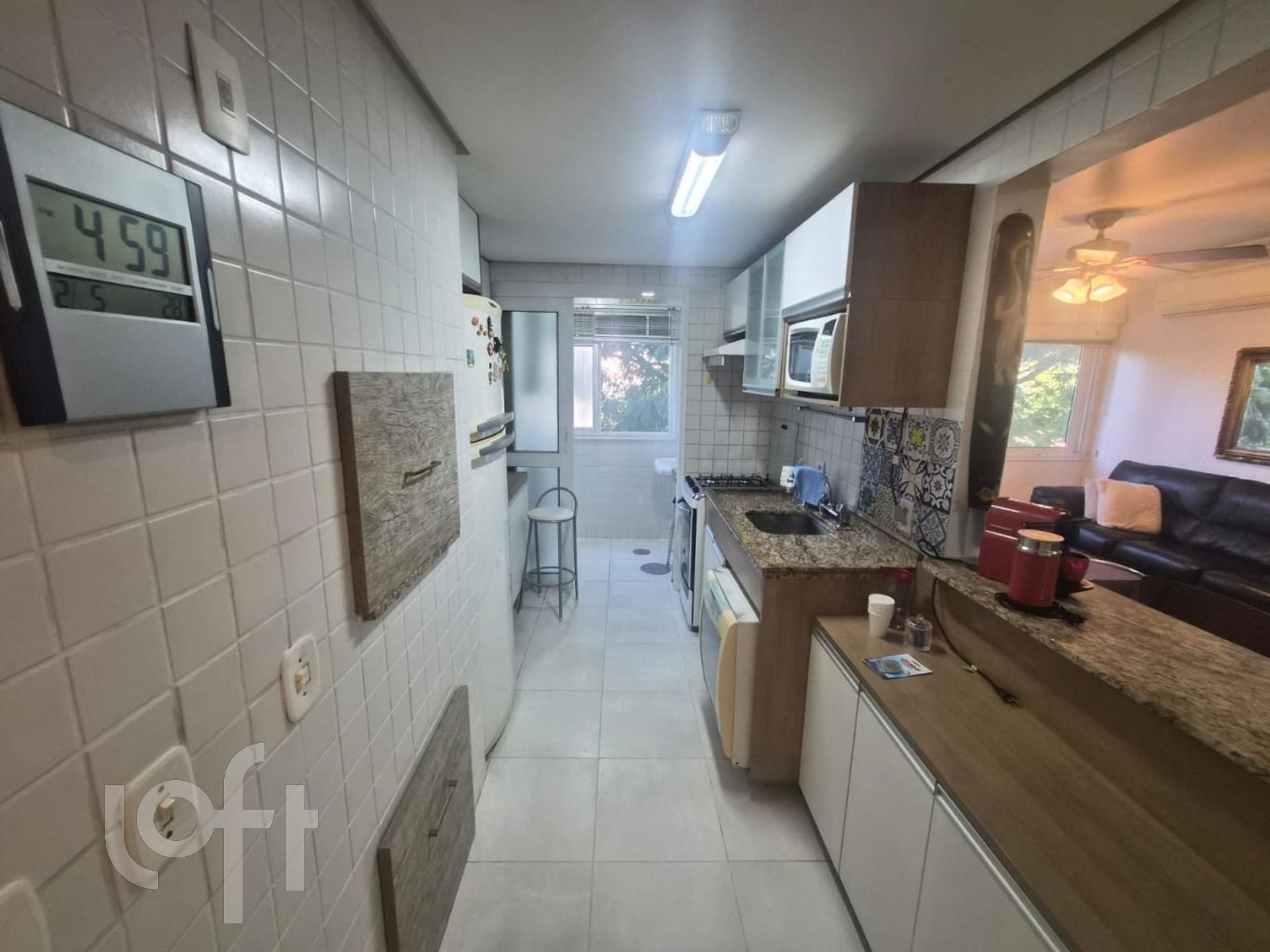 A área social é moderna e acolhedora, com living climatizado e totalmente mobiliado, integrado à cozinha equipada, que conta com churrasqueira, móveis planejados e eletrodomésticos, além de área de serviço funcional.