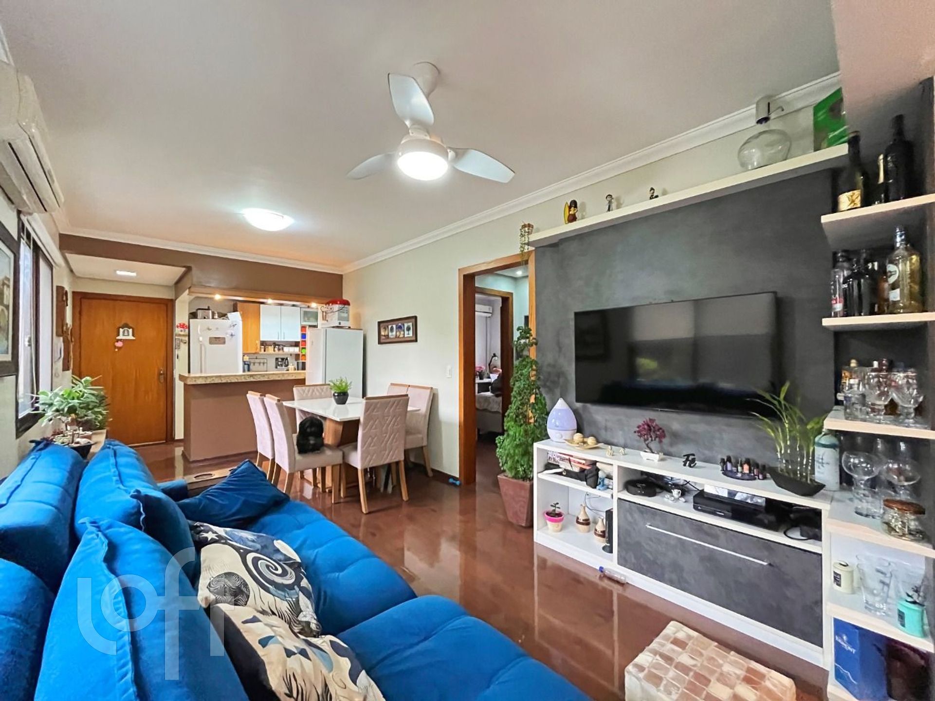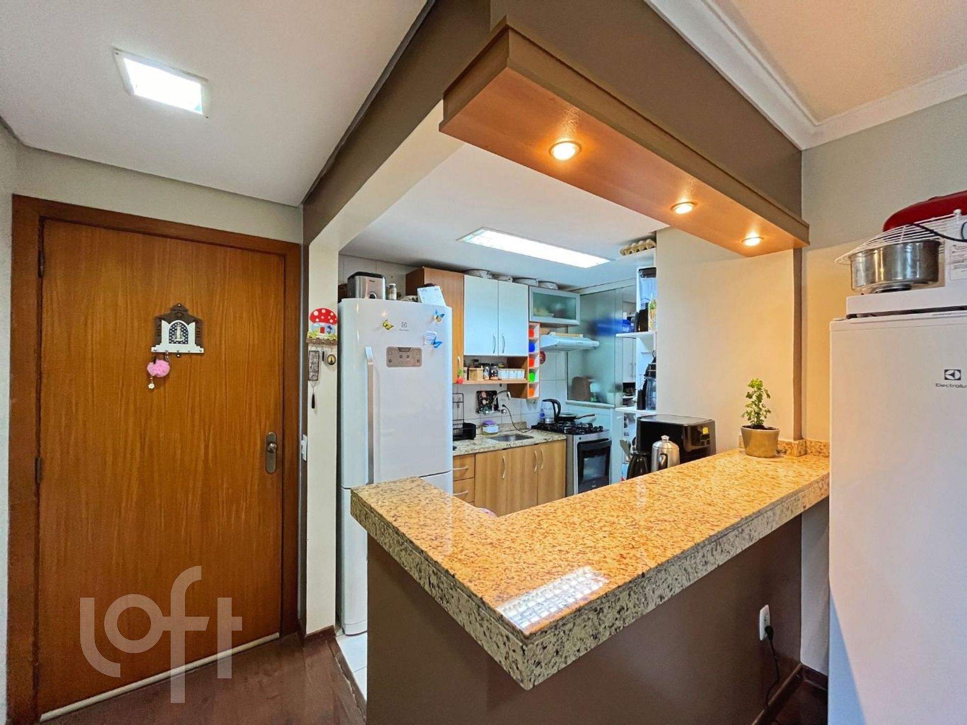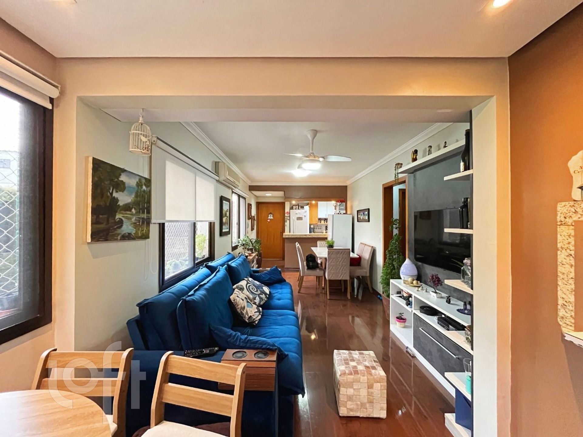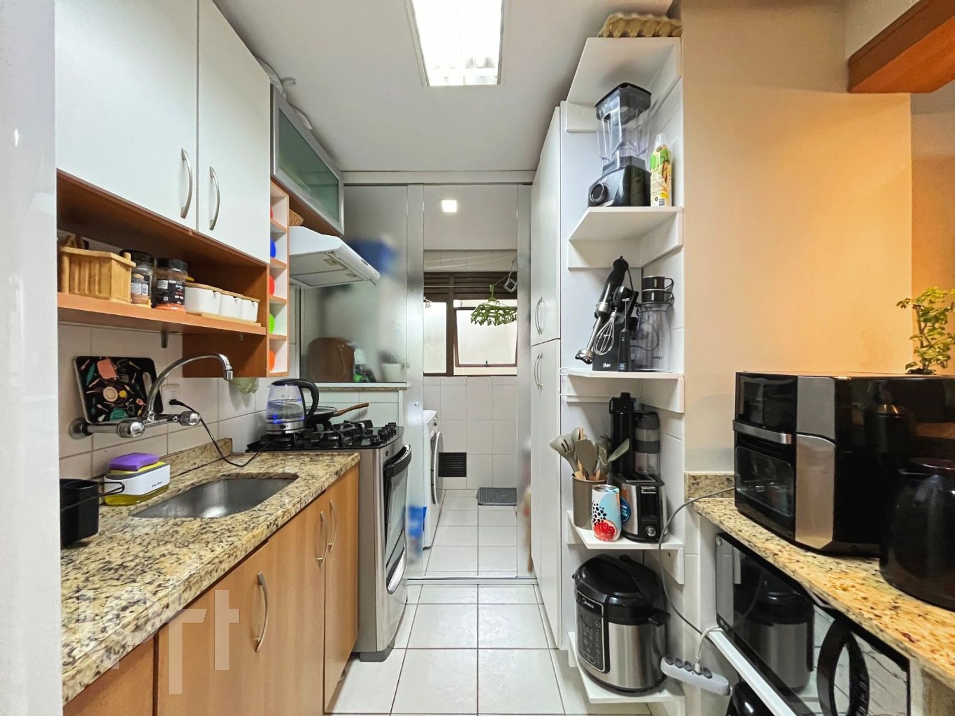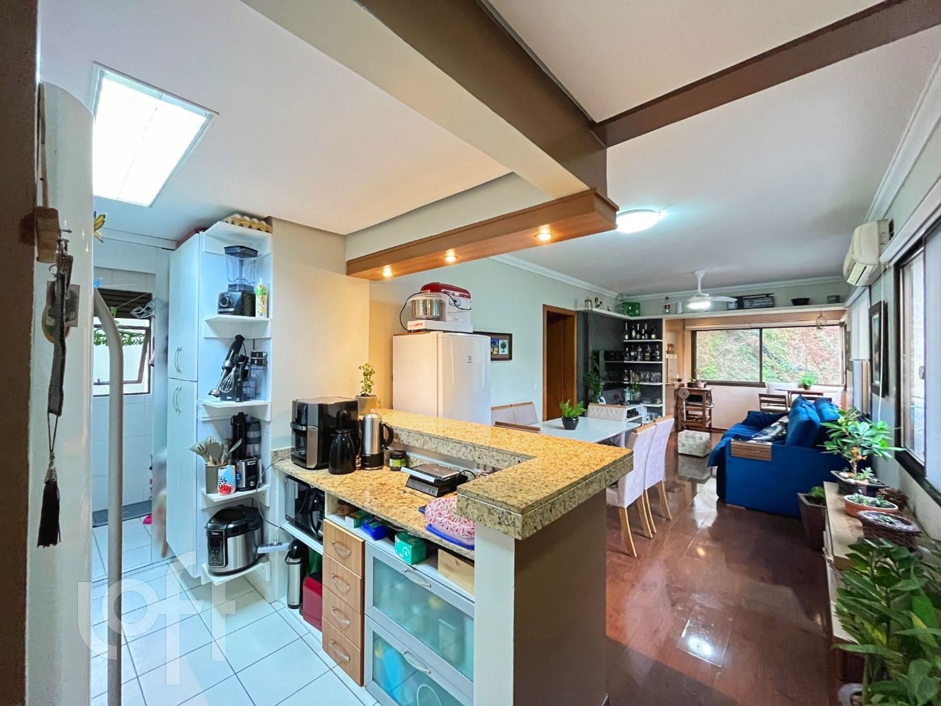 O living para dois ambientes é aconchegante e conta com sacada integrada, churrasqueira e janelas amplas. A cozinha americana montada, conectada à área de serviço com porta de vidro, garante funcionalidade ao dia a dia.
