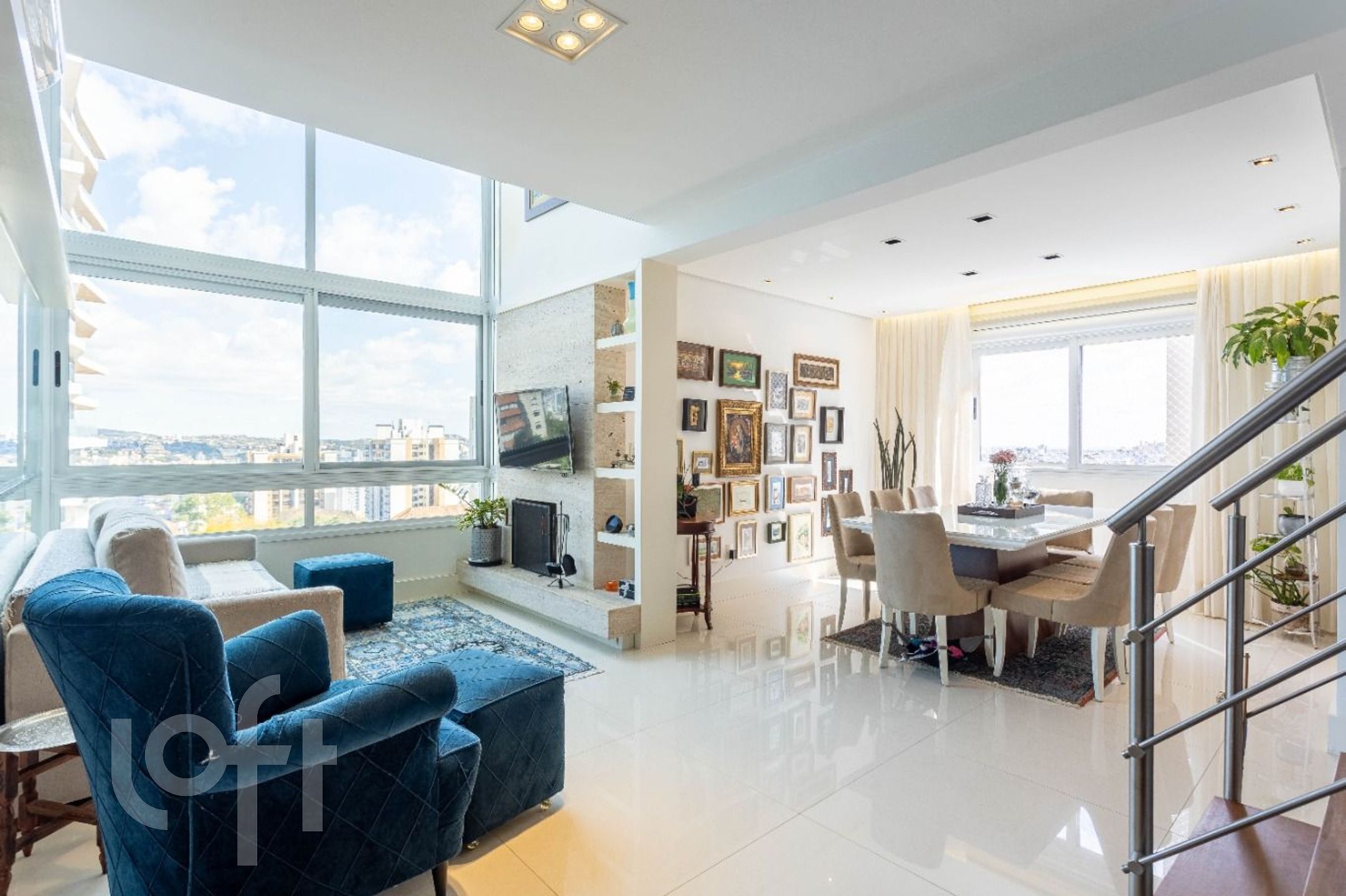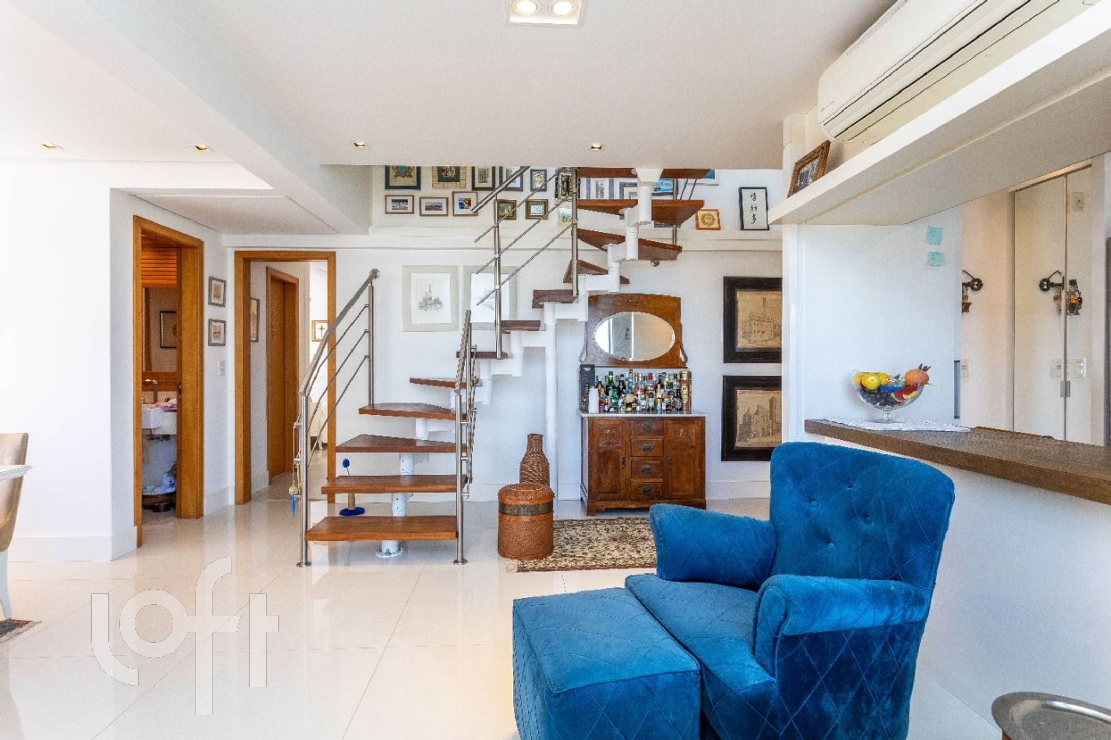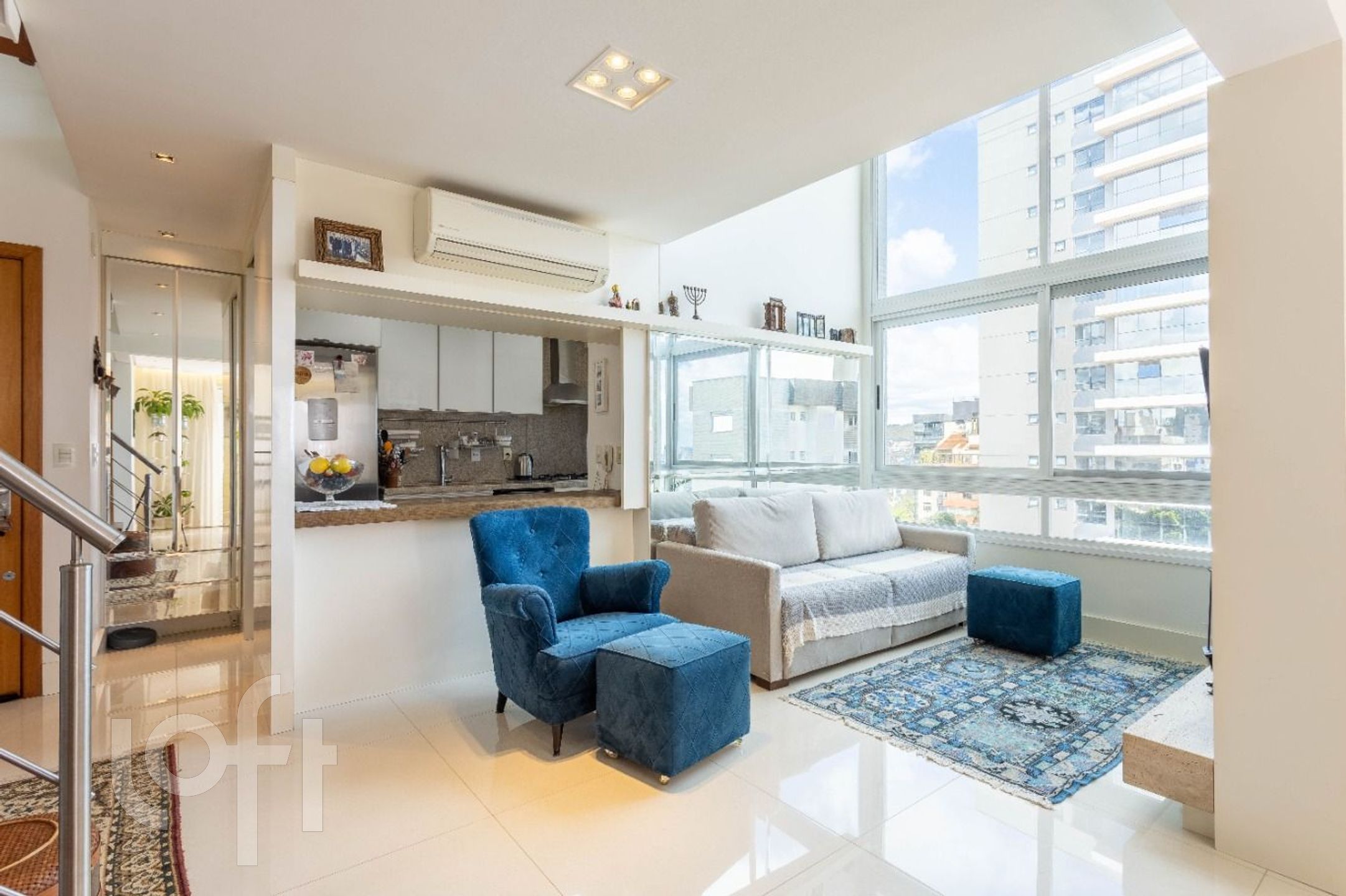 Apartamento a venda na Rua Cabral bairro Rio Branco, pé direito duplo na área social, mezanino com sala de TV montada + home office com vista. Dois quartos transformado para 1 suíte e uma sala de jantar com lavabo + living com lareira e cozinha americana com churrasqueira. Duas vagas de garagens, independentes. Dois elevadores, salão de festas, portaria virtual, próximo ao Colégio Leonardo da Vinci, Zaffari da Cabral.