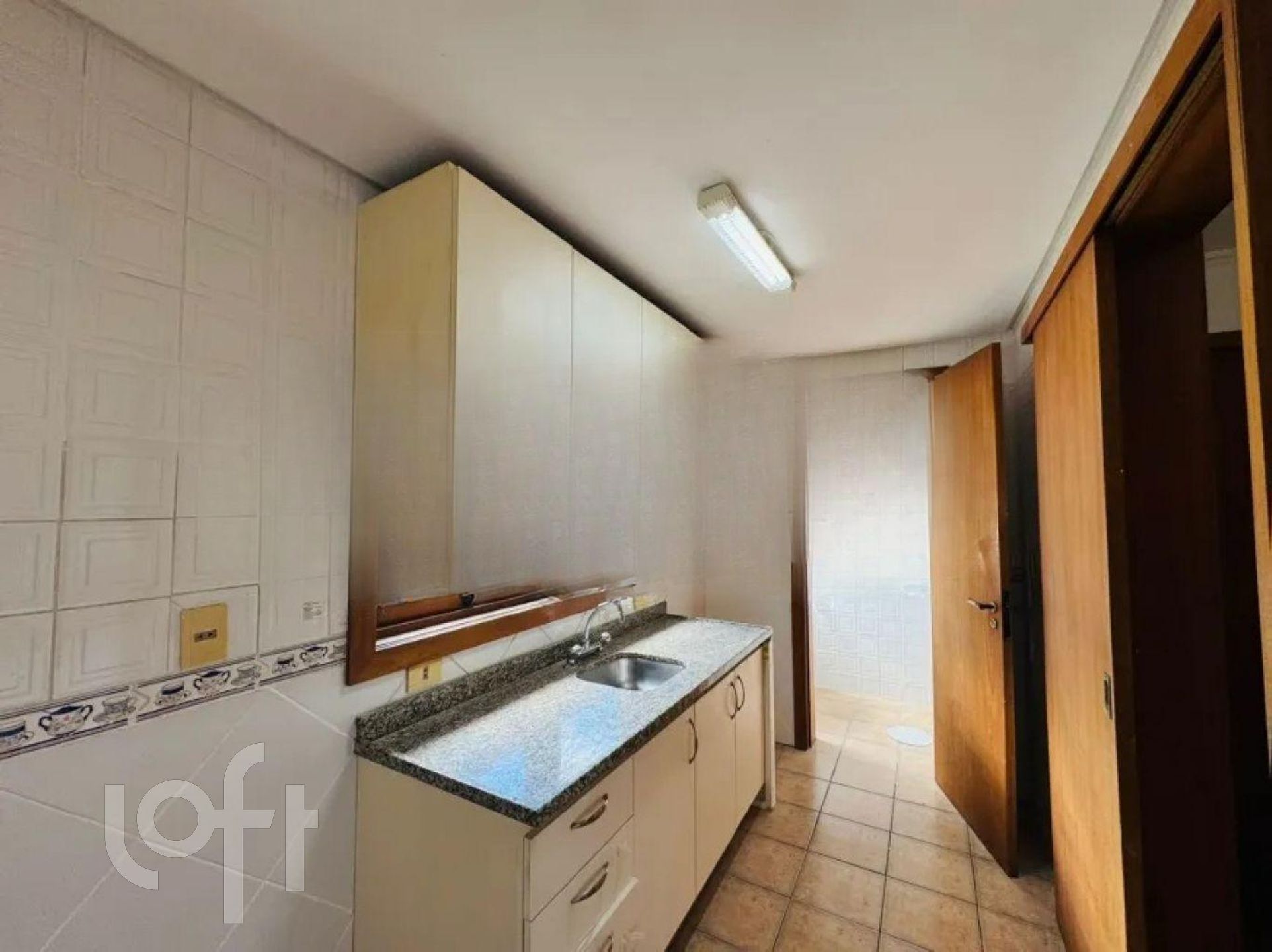 Cozinha com móveis sob medida e área de serviço separada.