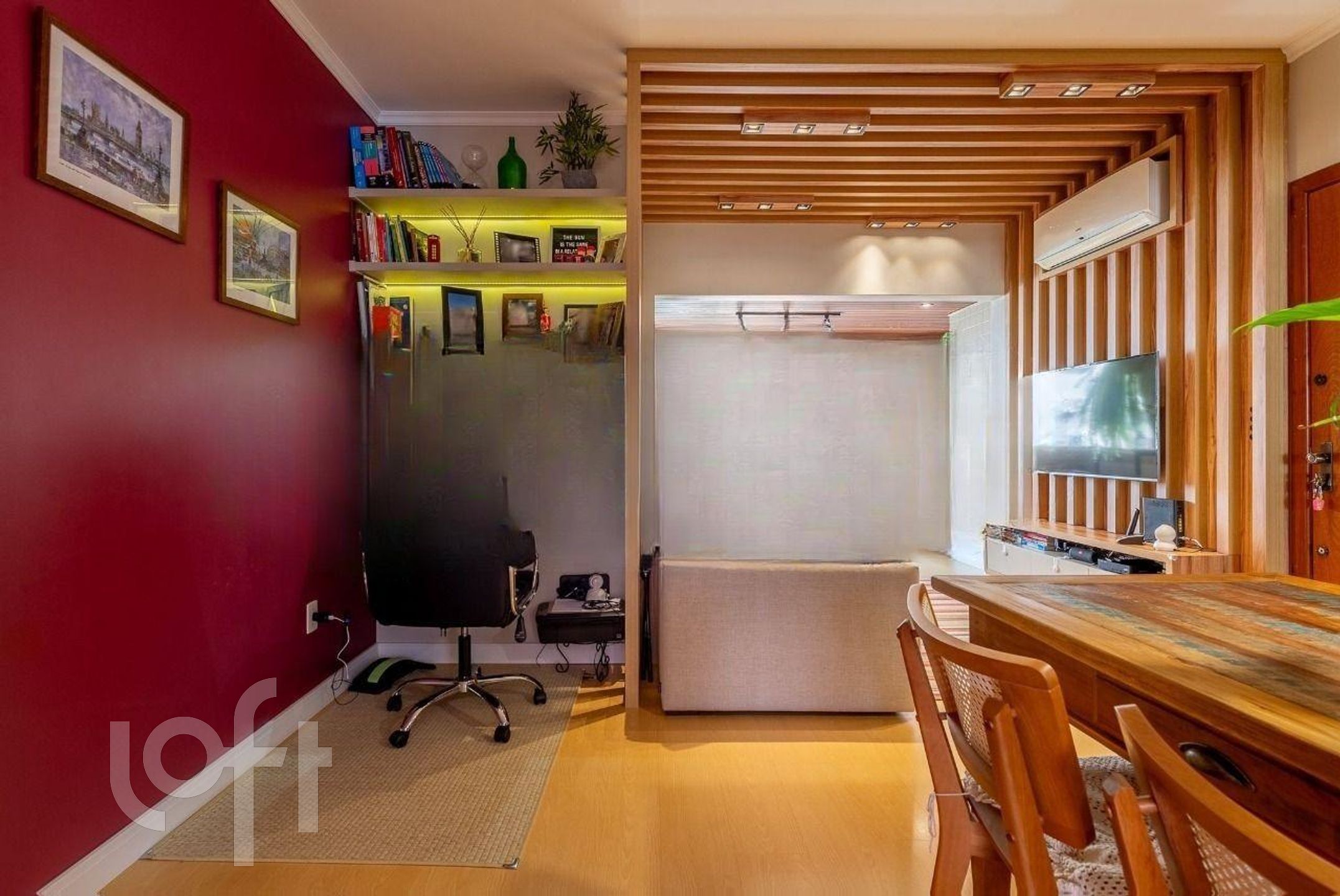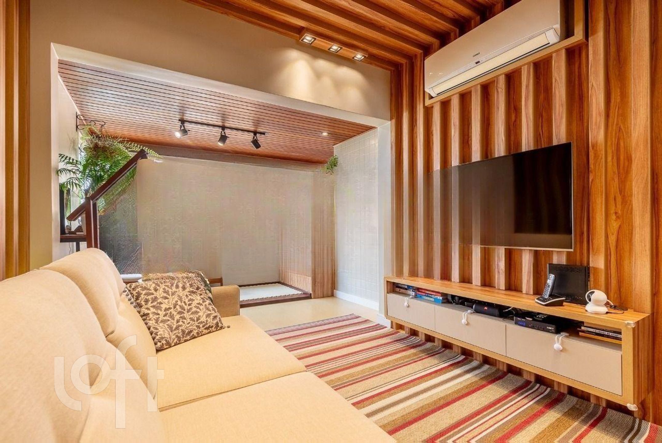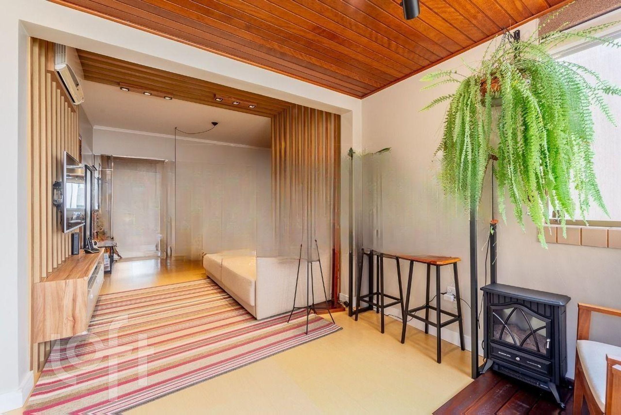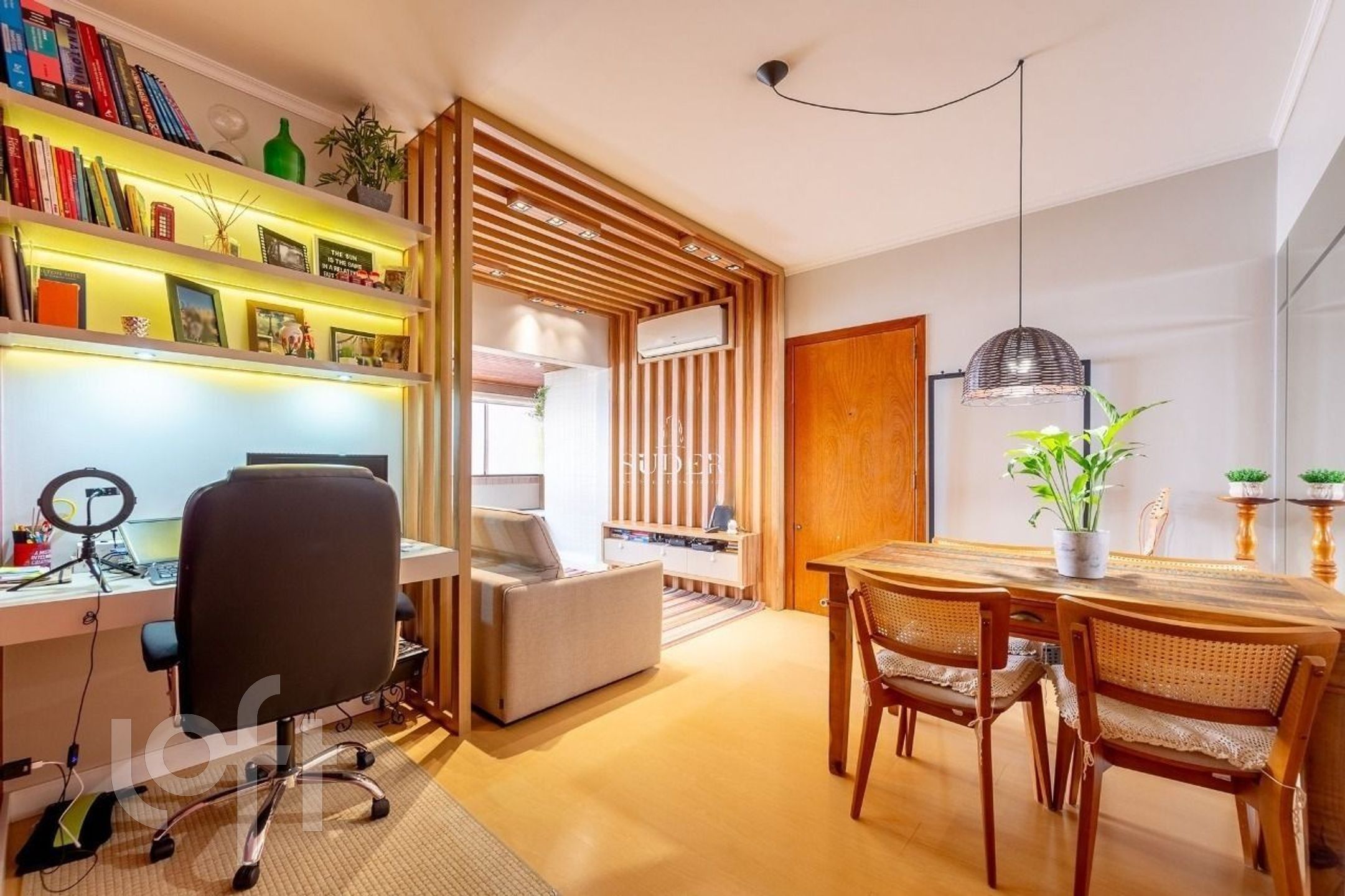 Living: Espaço para dois ambientes com sacada integrada e acabamento em ripado.