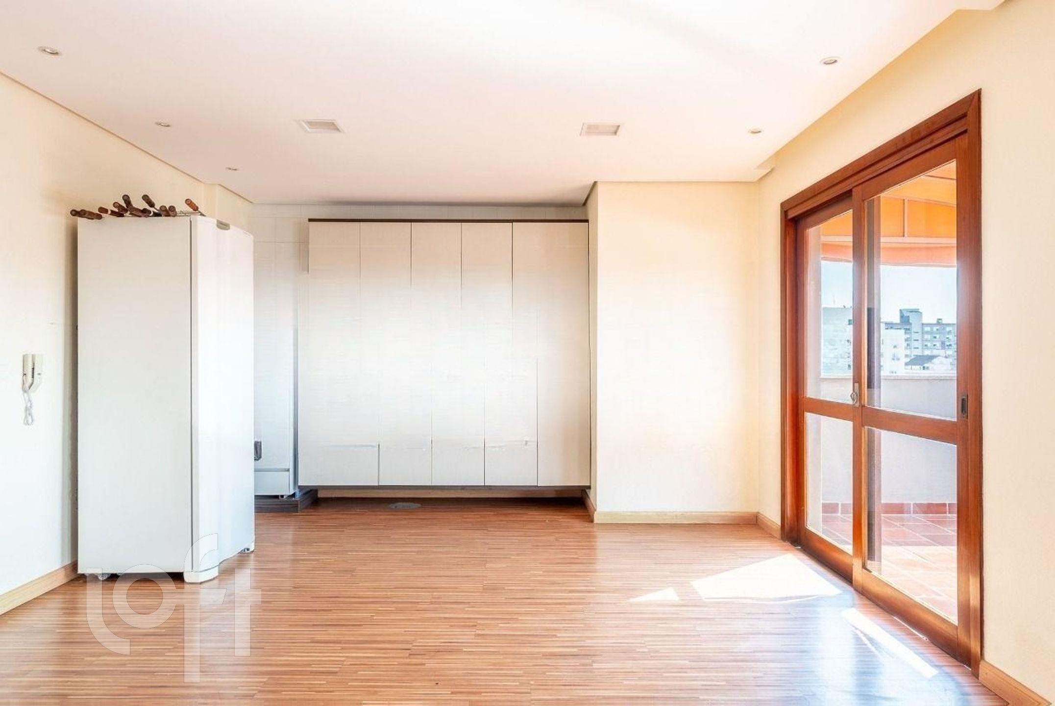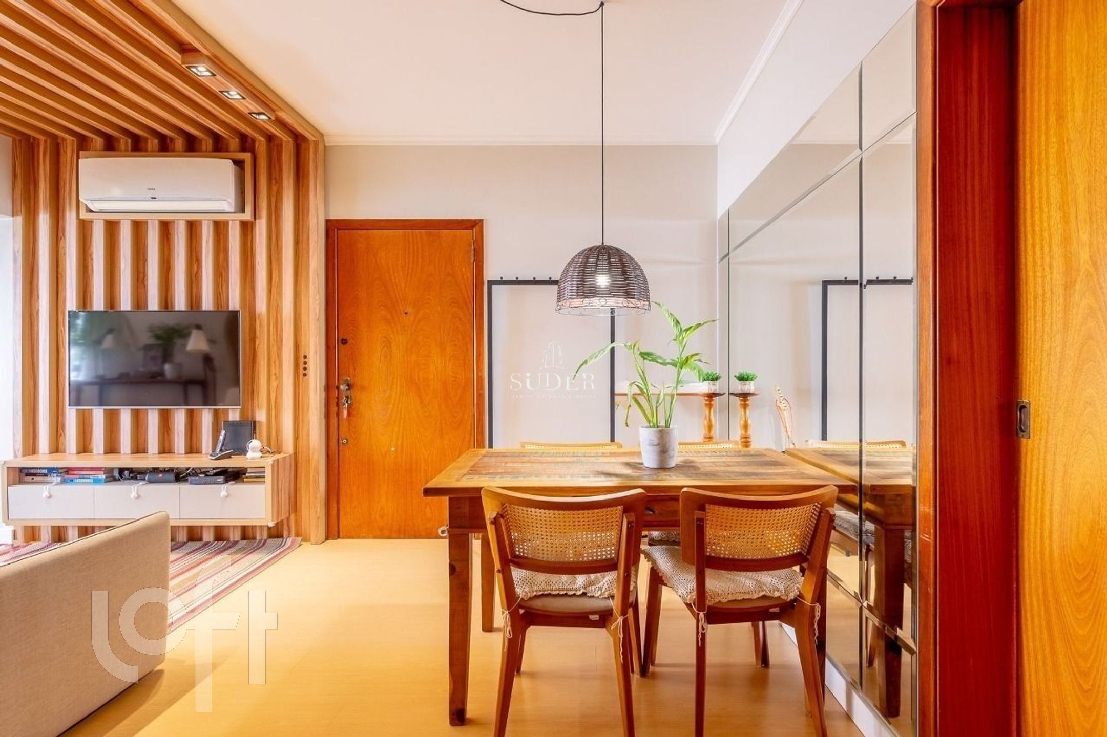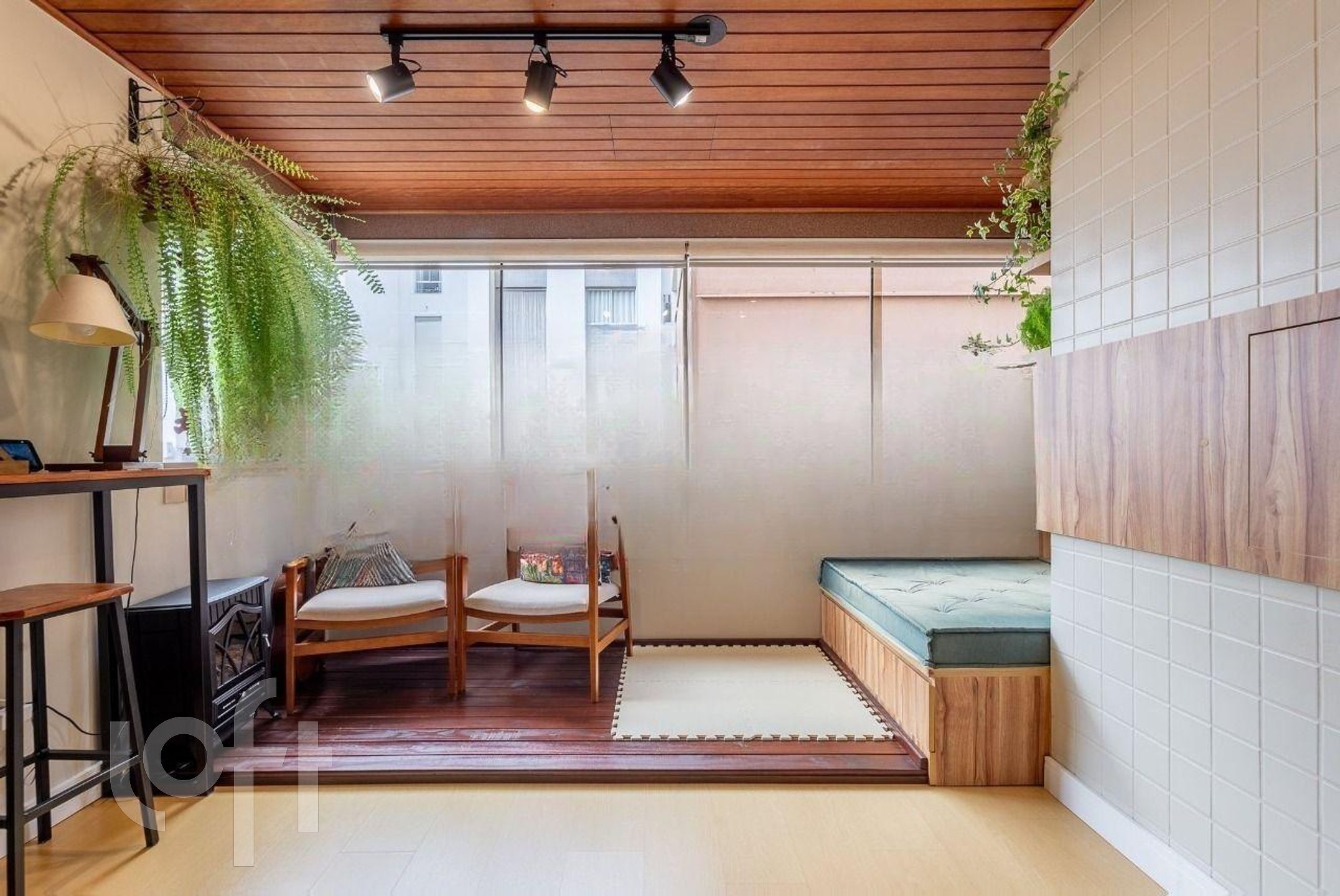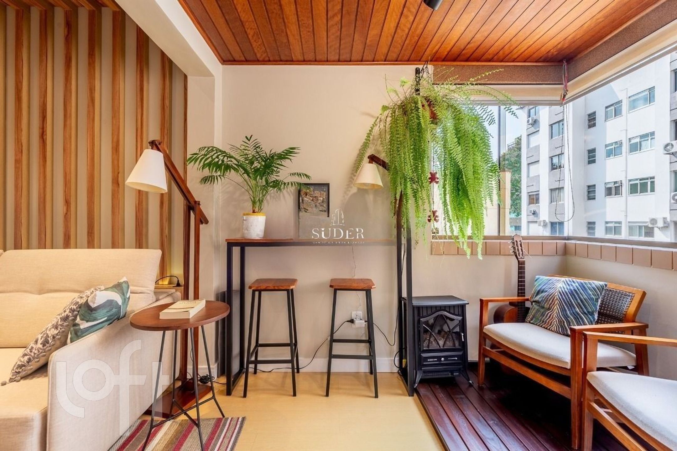 Living: Espaço para dois ambientes com sacada integrada e acabamento em ripado.