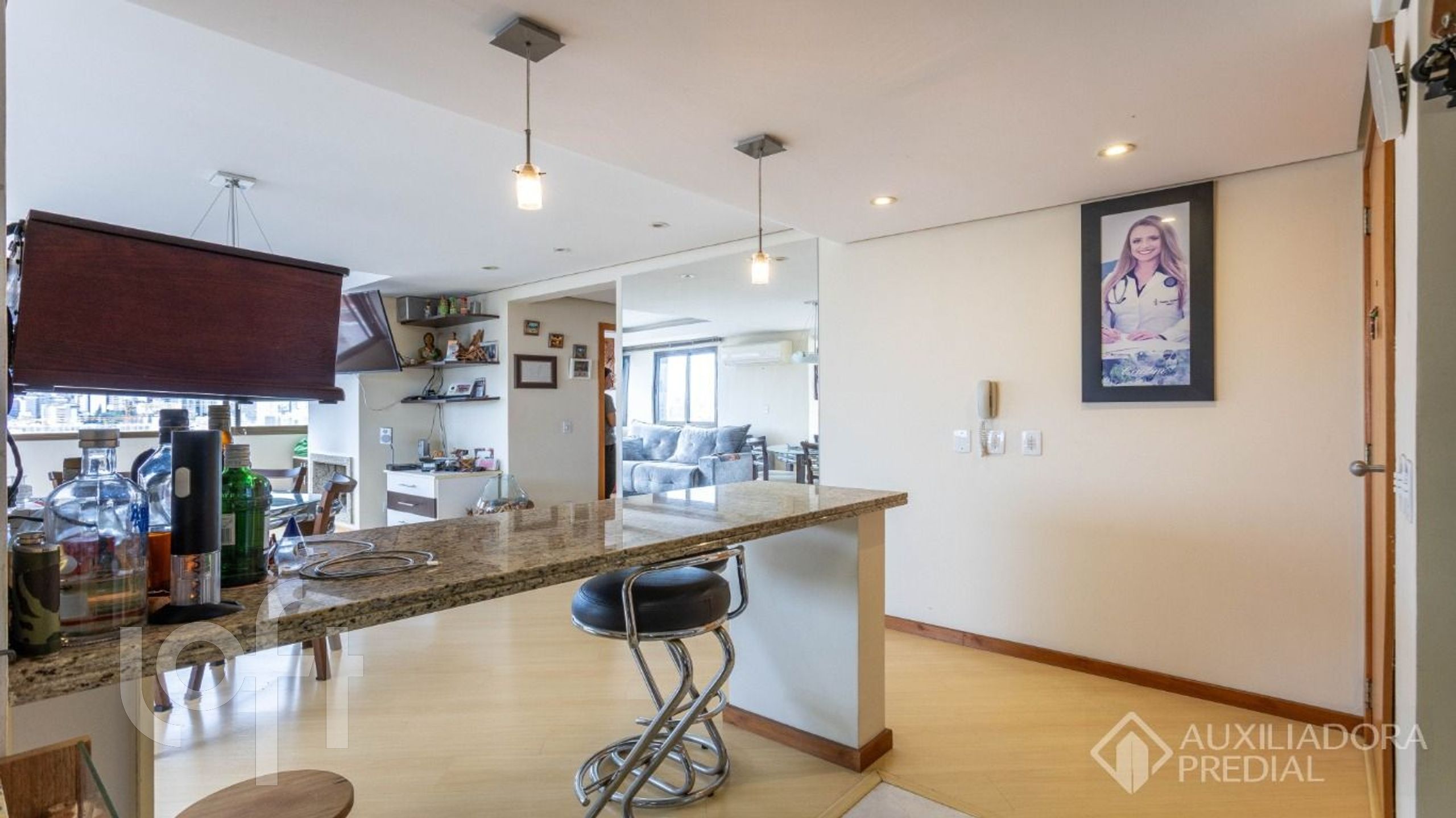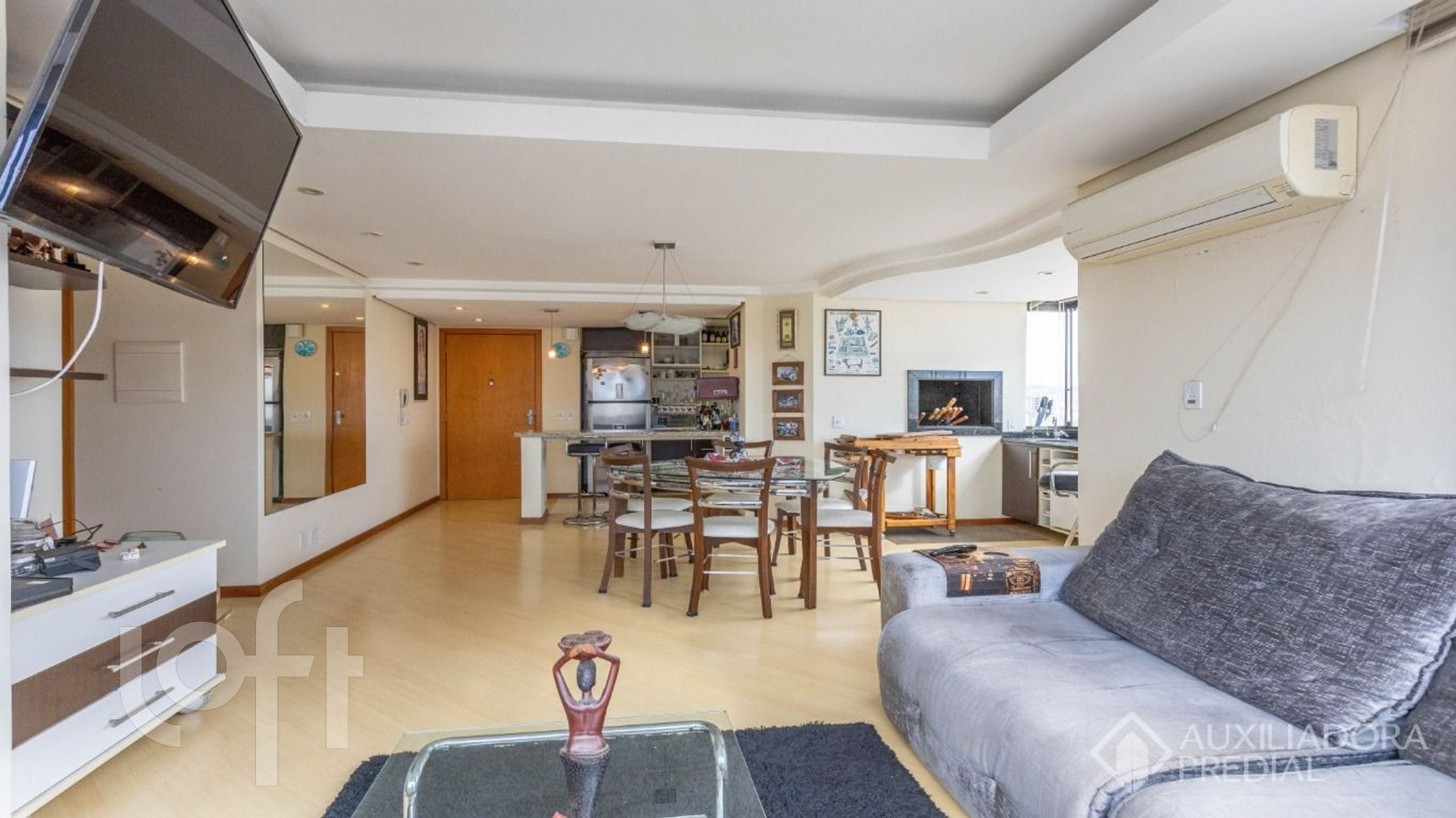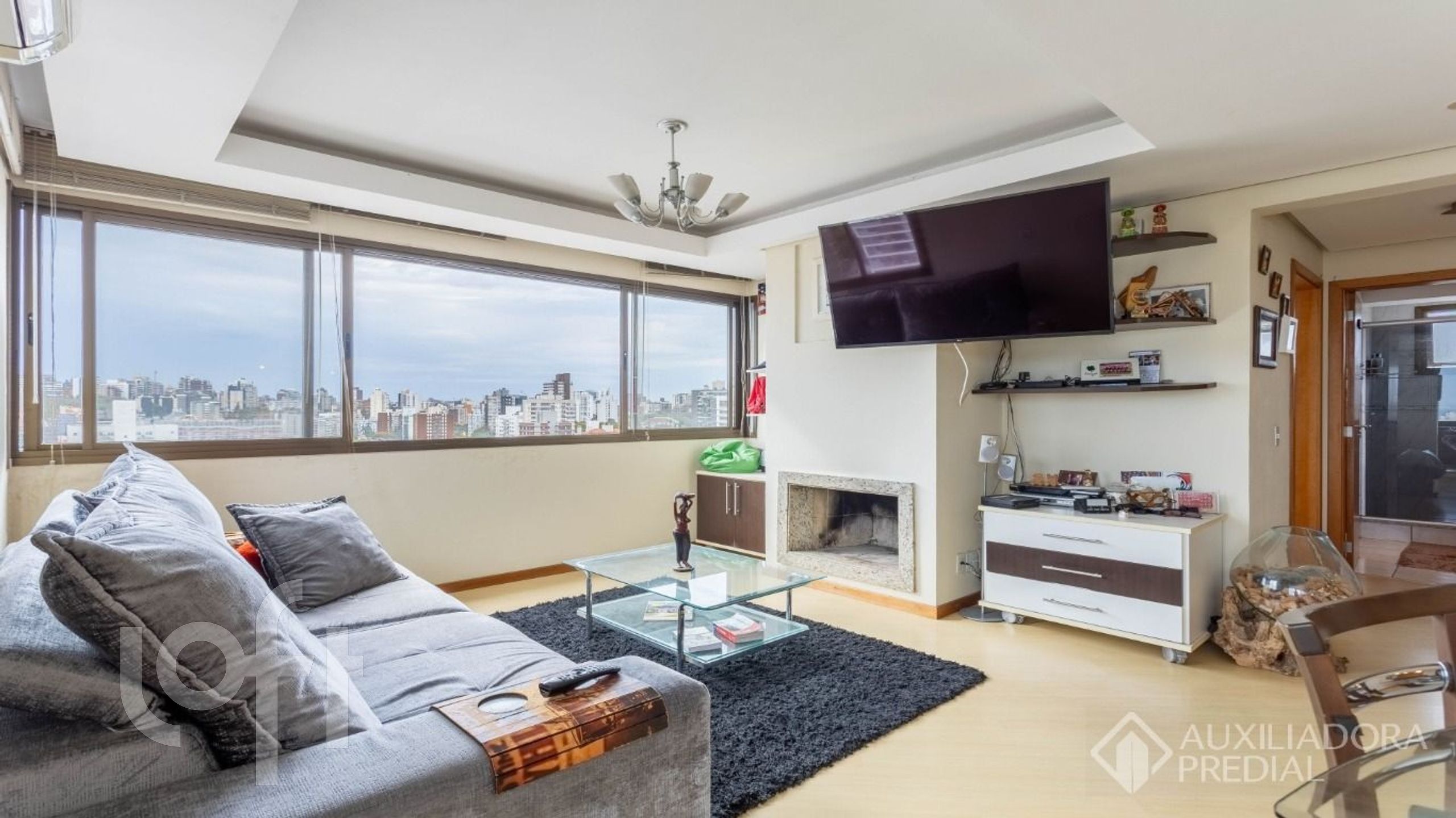 Dois dormitórios, sendo uma suíte, e um banheiro social, cozinha americana, sacada integrada ao living, pia na sacada, churrasqueira, lareira a lenha e três vagas de garagem, uma simples e outra dupla.