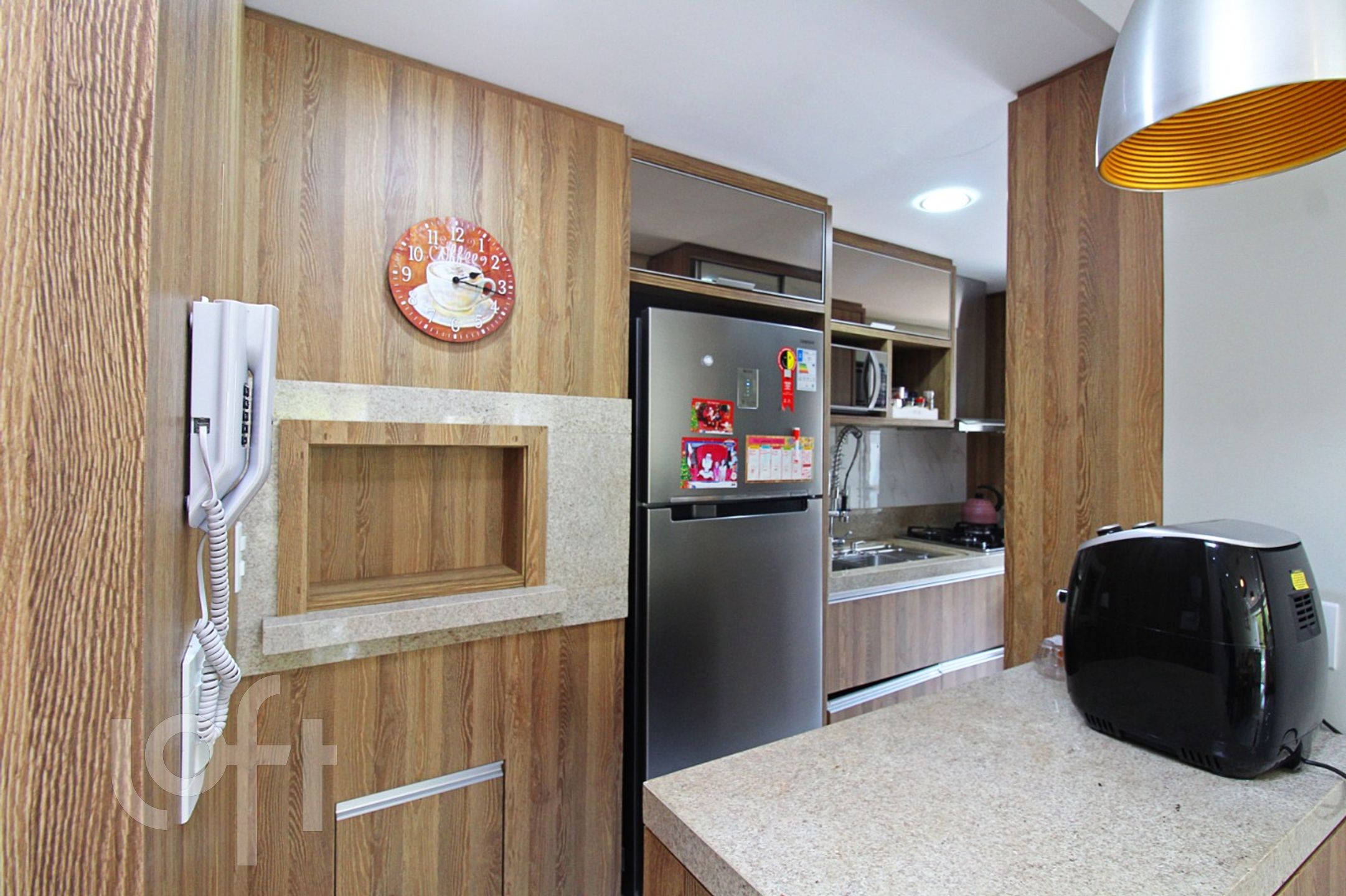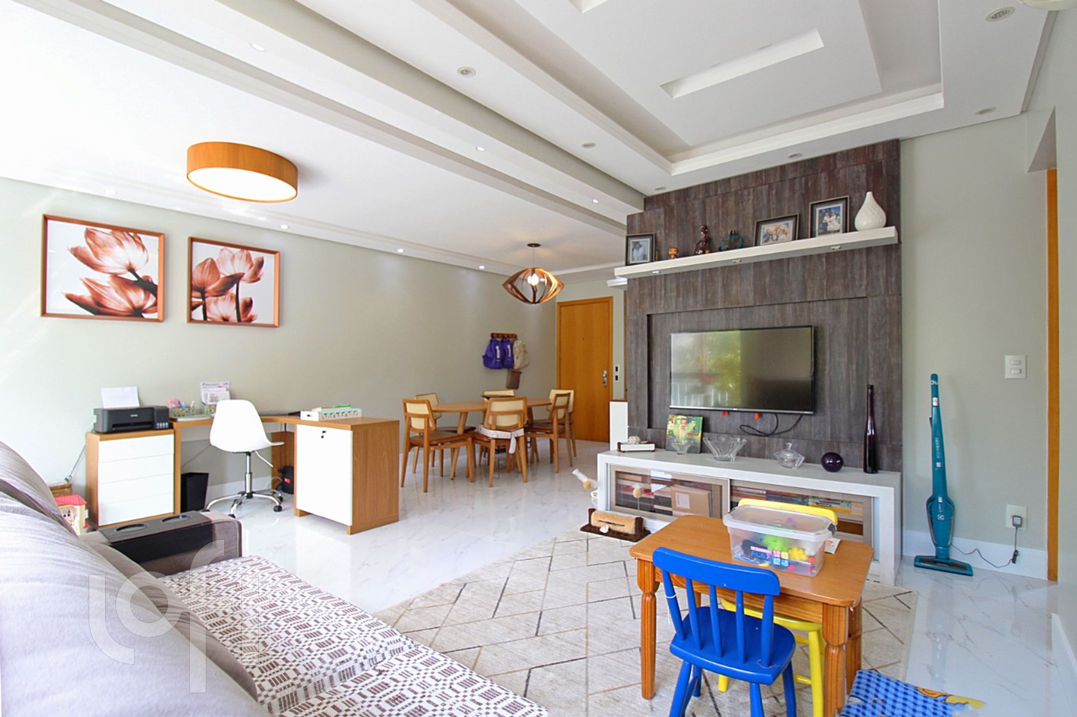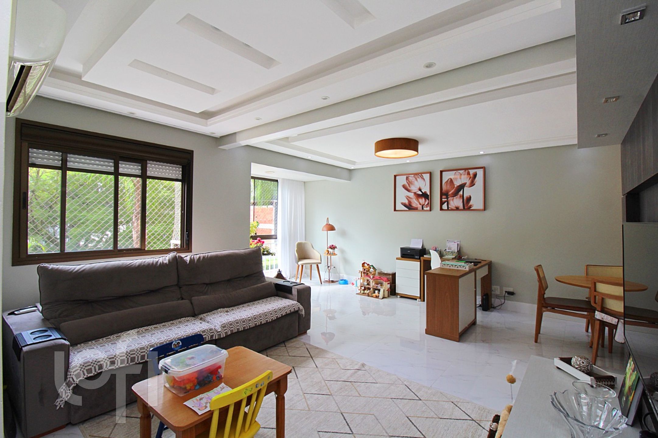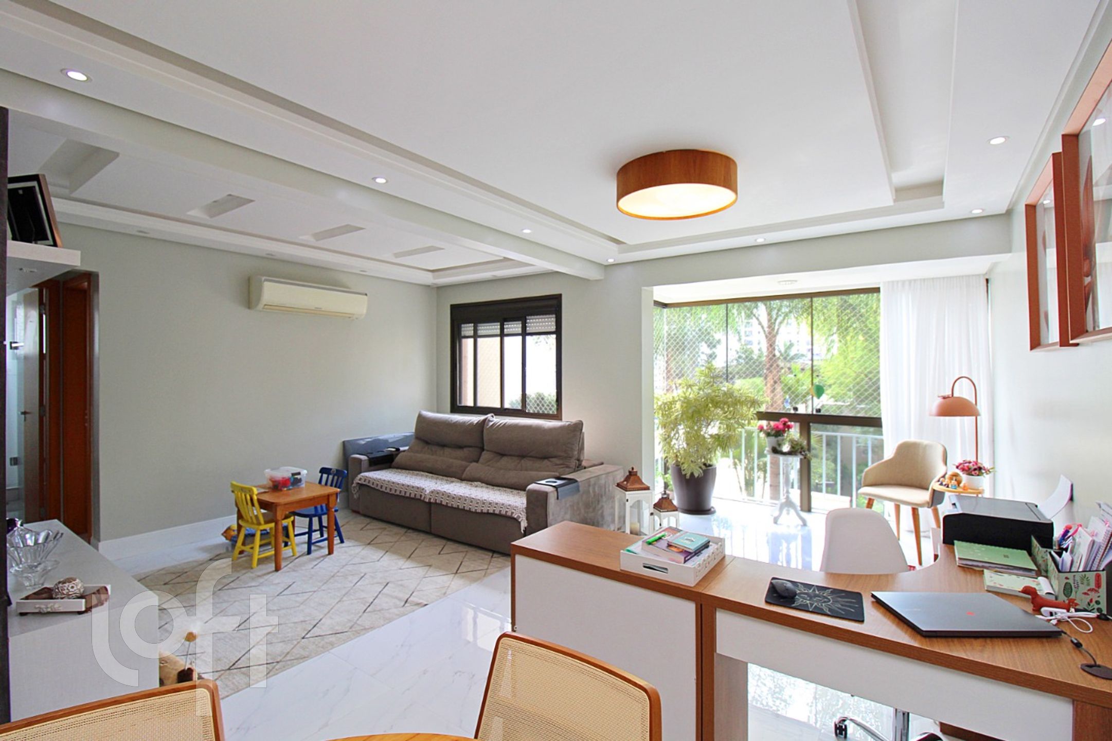 Living para 3 ambientes climatizado com piso todo em porcelanato, copa cozinha americana montada COM CHURRASQUEIRA.