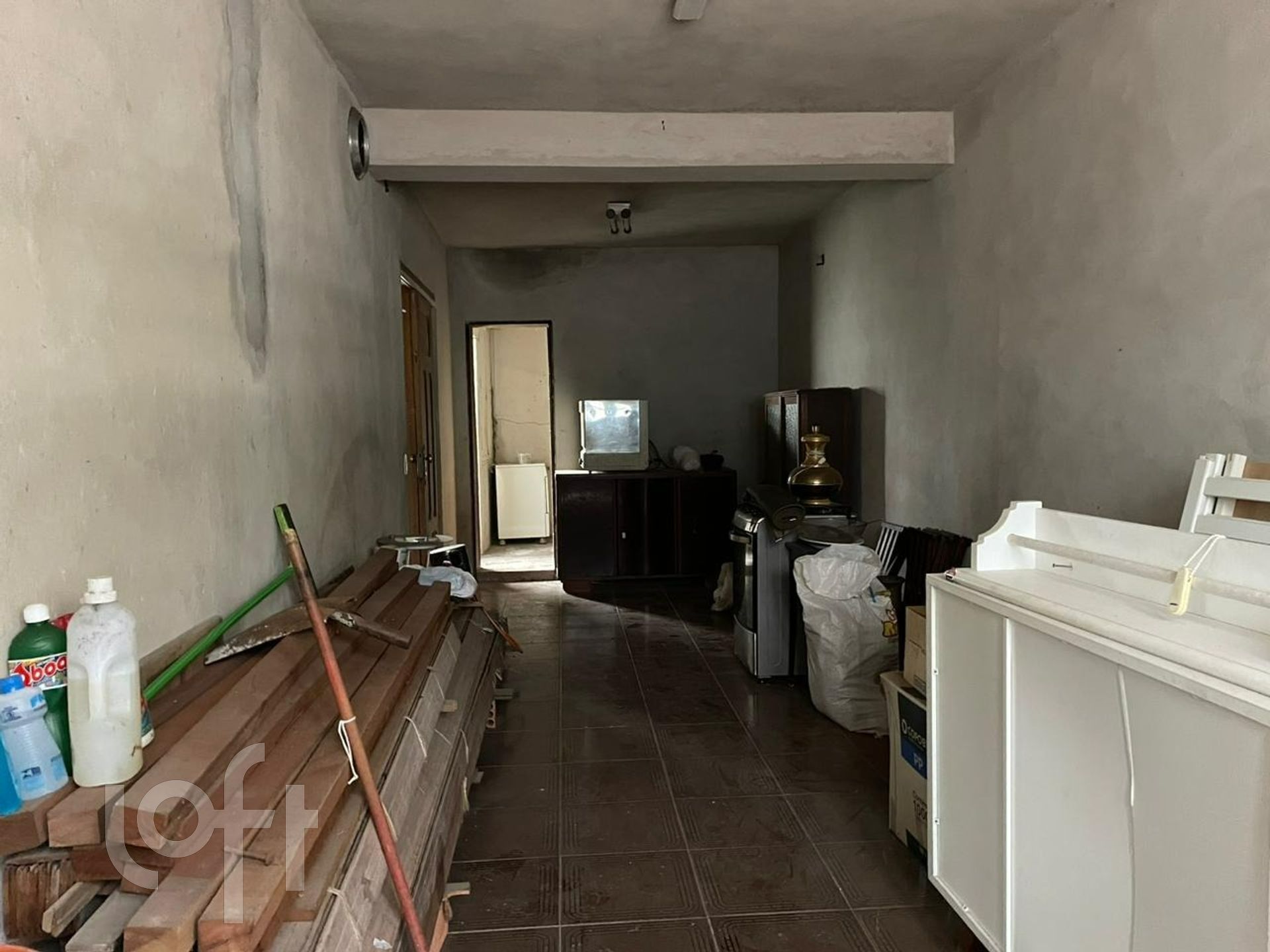 Parte inferior, living 2 ambientes, cozinha, lavado, área de serviço, banheiro auxiliar, pequeno pátio, garagem fechada para 2 vagas, escada em madeira.