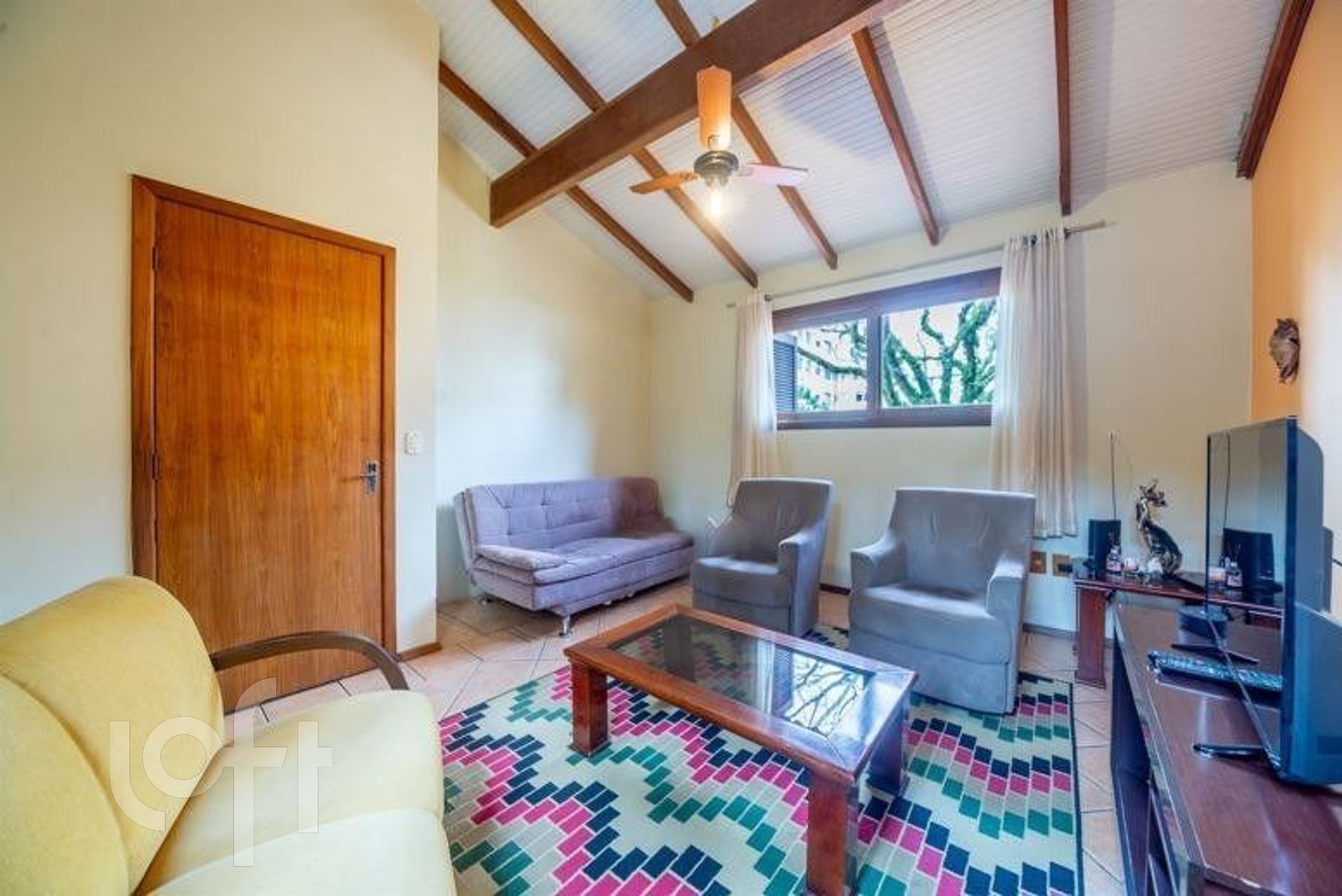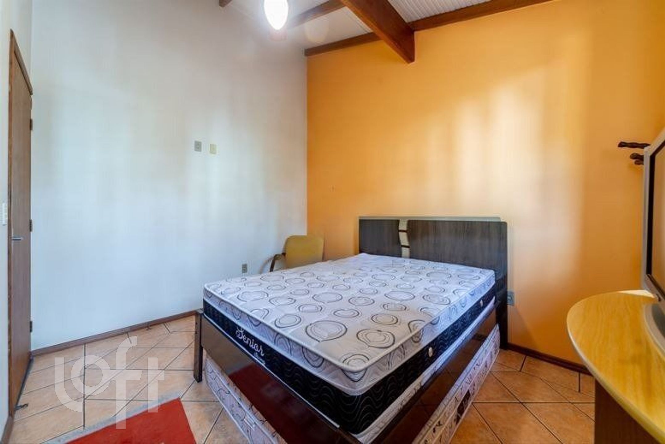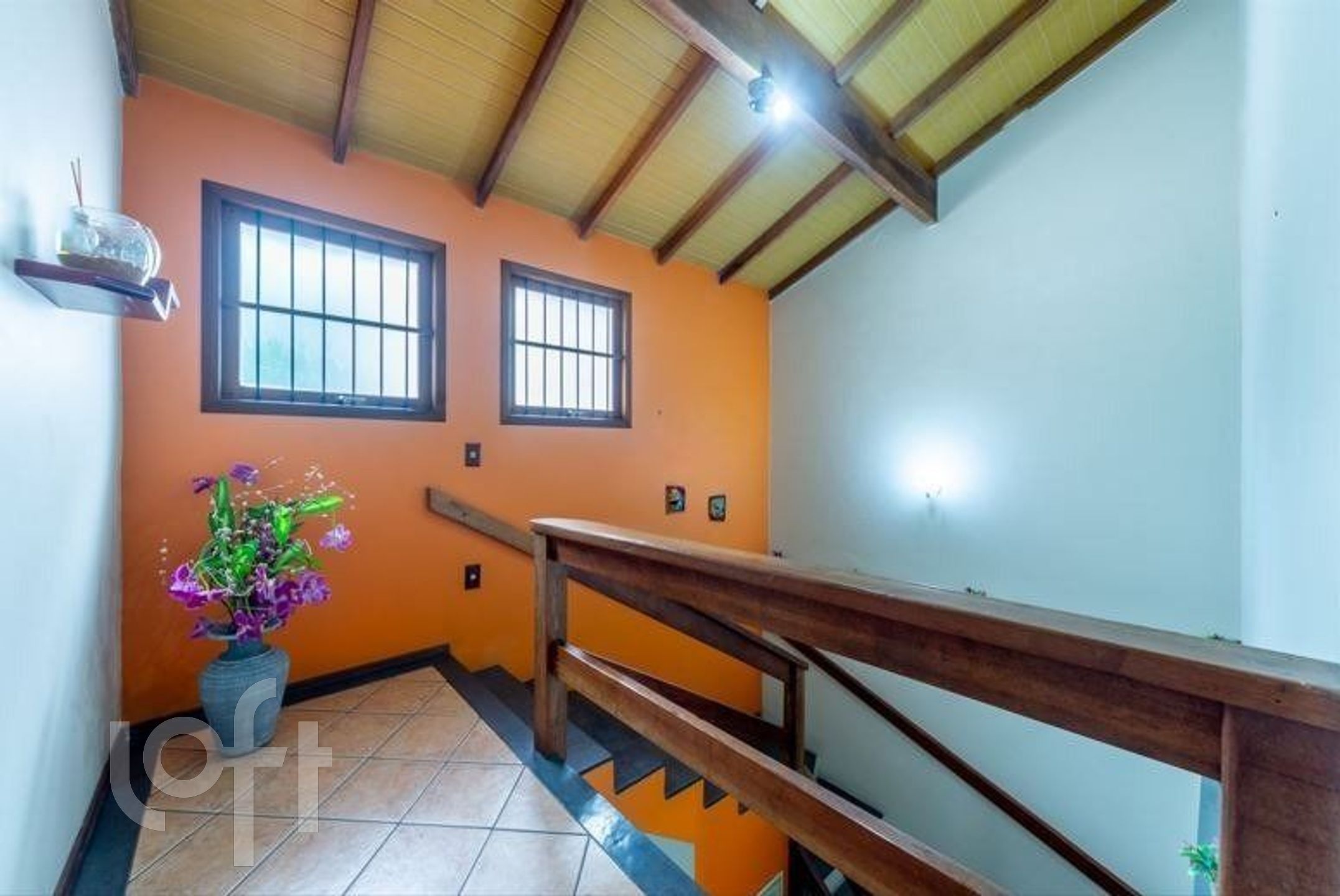 No pavimento superior, a casa possui uma sala de estar, dois dormitórios bem iluminados e um banheiro social.