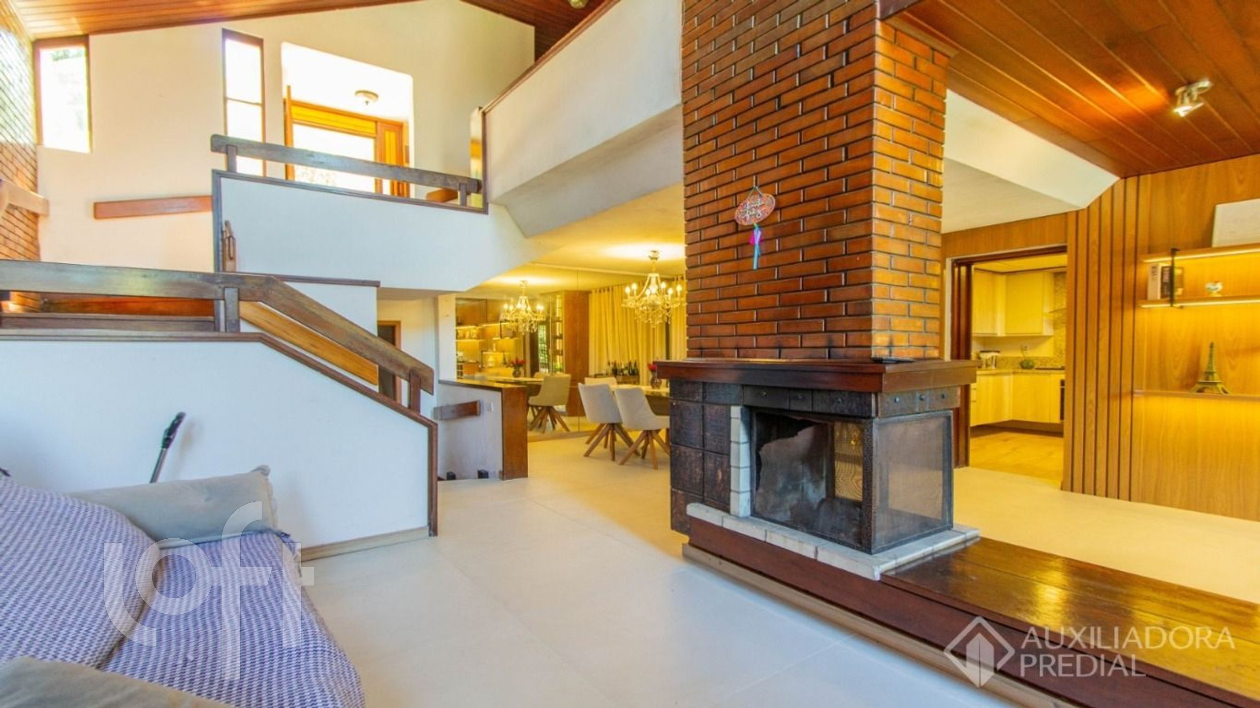 No primeiro pavimento temos um amplo living com sala intima, estar com lareira e jantar, uma varanda com churrasqueira e cozinha com área de serviço separada e elevador.