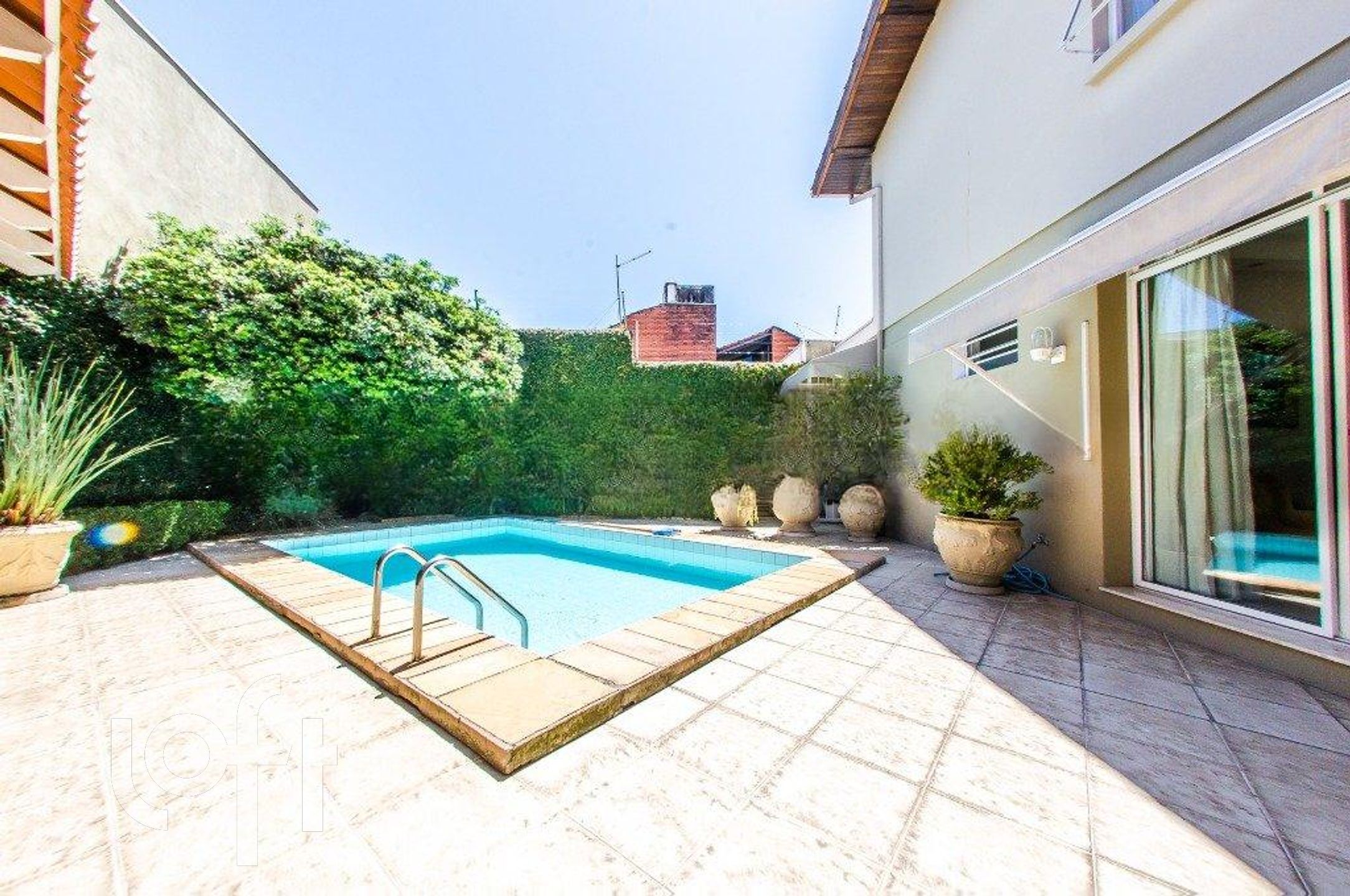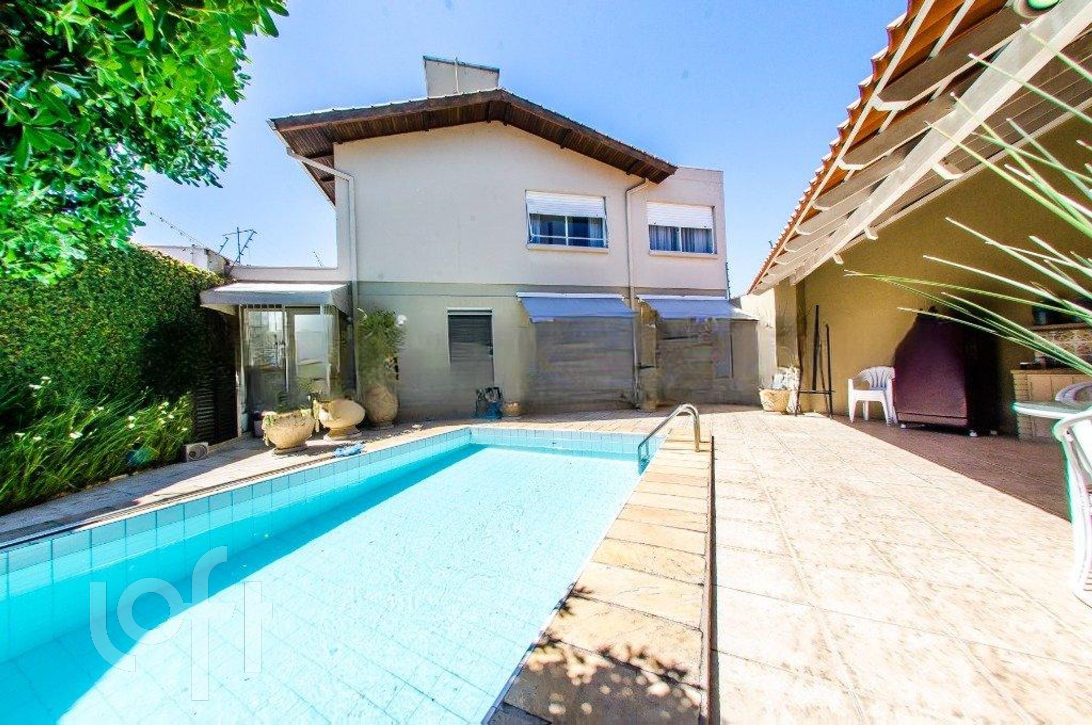 O pátio desta casa é um verdadeiro oásis, com uma encantadora piscina e um quiosque equipado com churrasqueira, perfeito para reunir amigos e familiares e desfrutar de momentos inesquecíveis. O paisagismo exuberante completa o cenário, criando uma atmosfera serena e acolhedora.