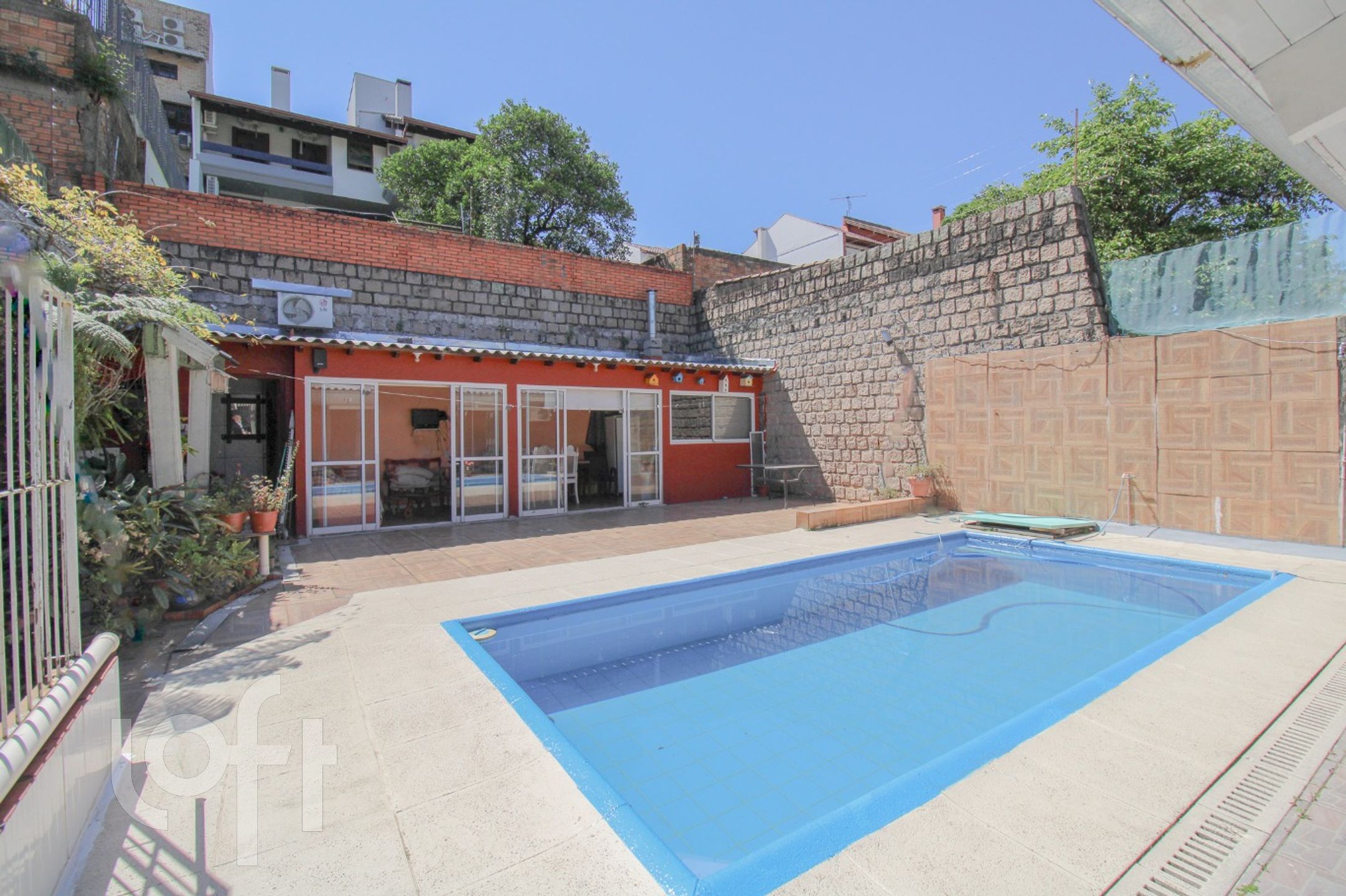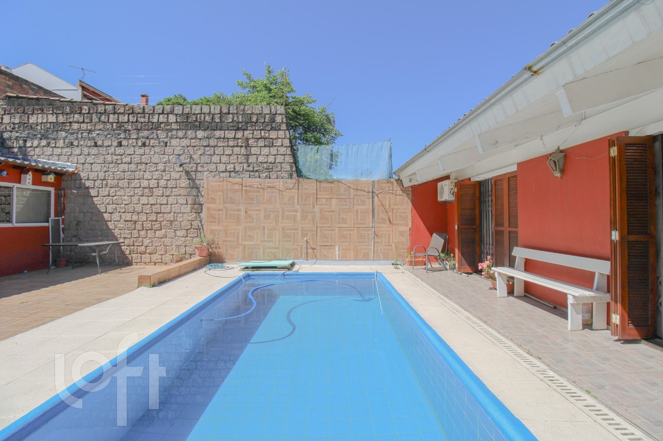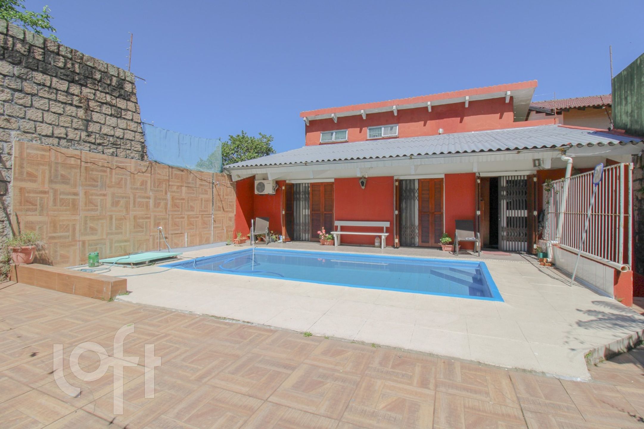 No pátio, encontramos um pequeno salão de festas com churrasqueira e piscina. A garagem acomoda 2 carros na área interna e 2 carros na área externa. O terreno desta casa é de 11mx39,50m.